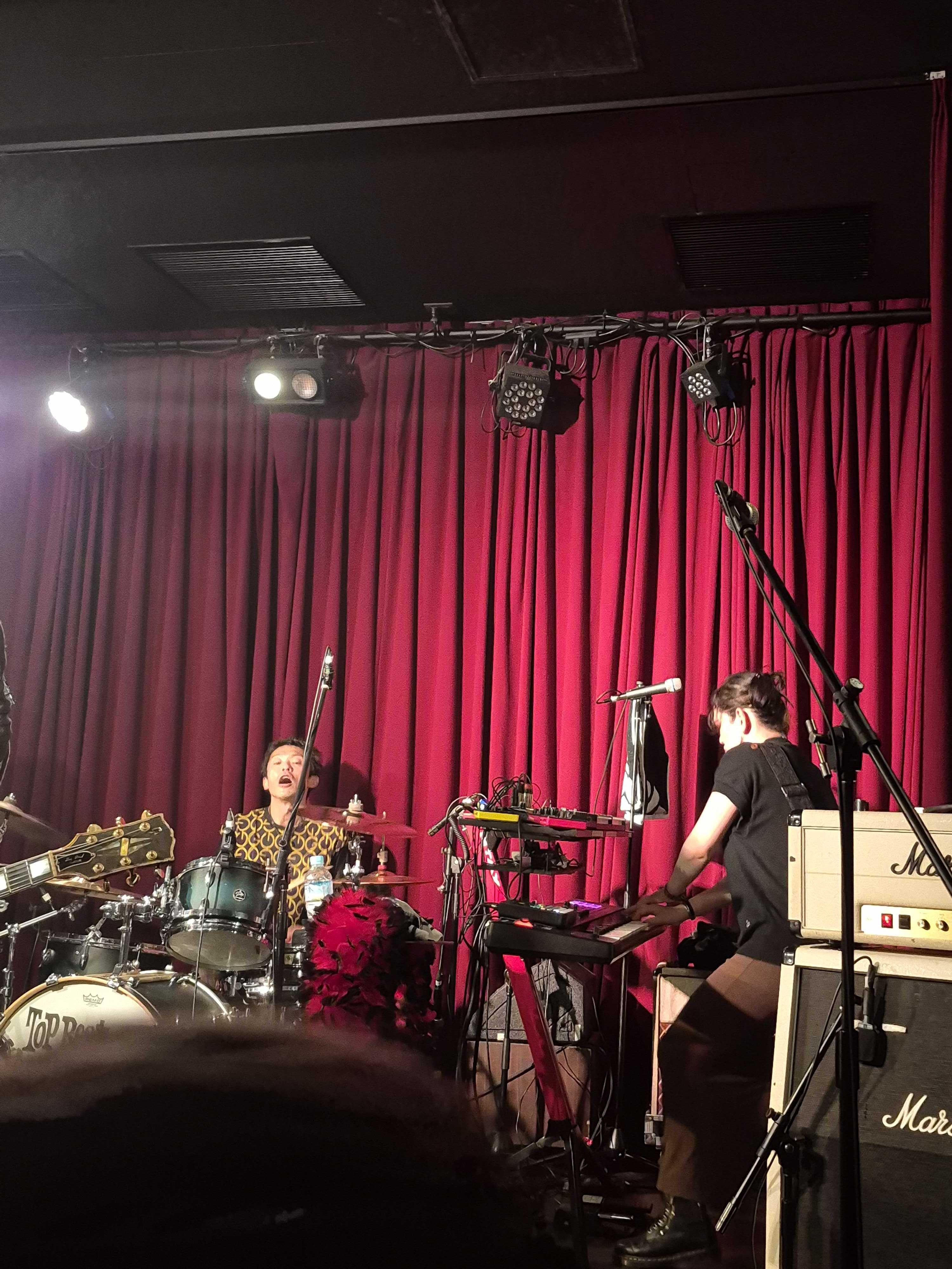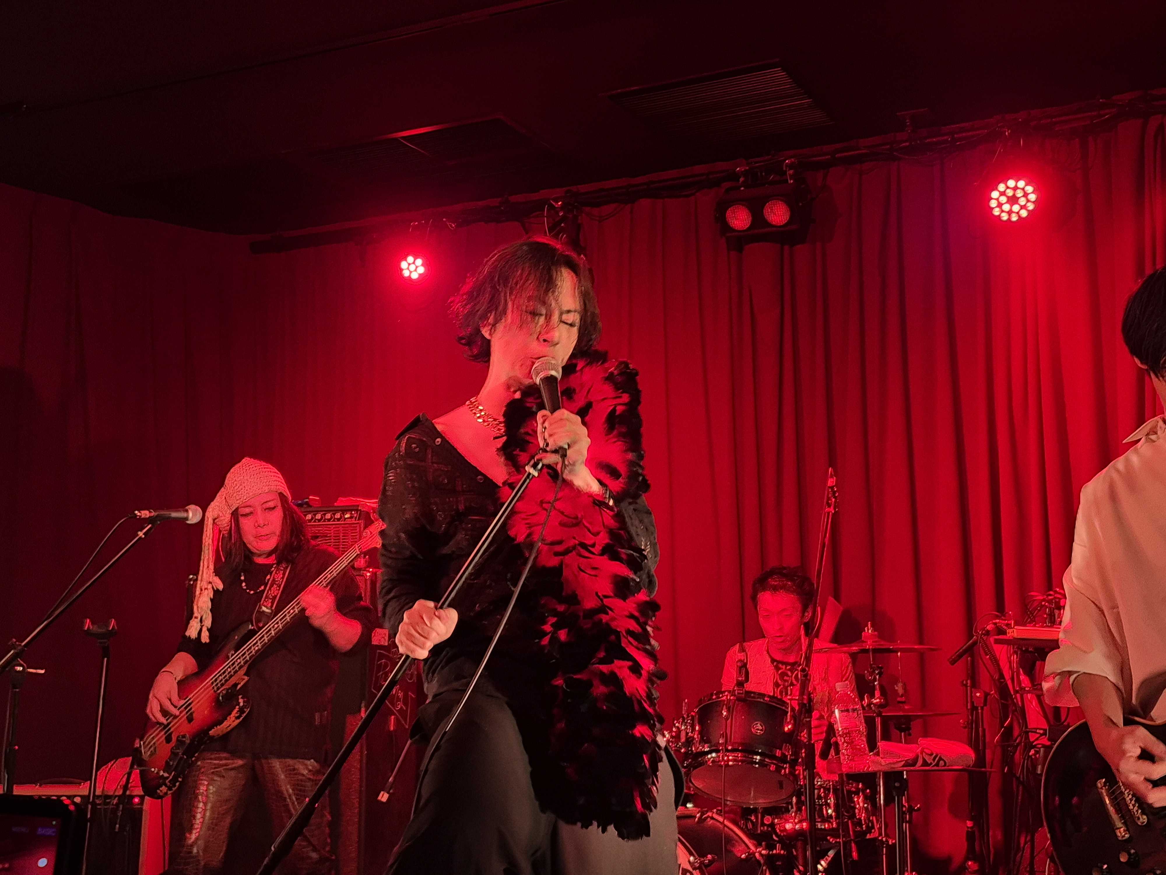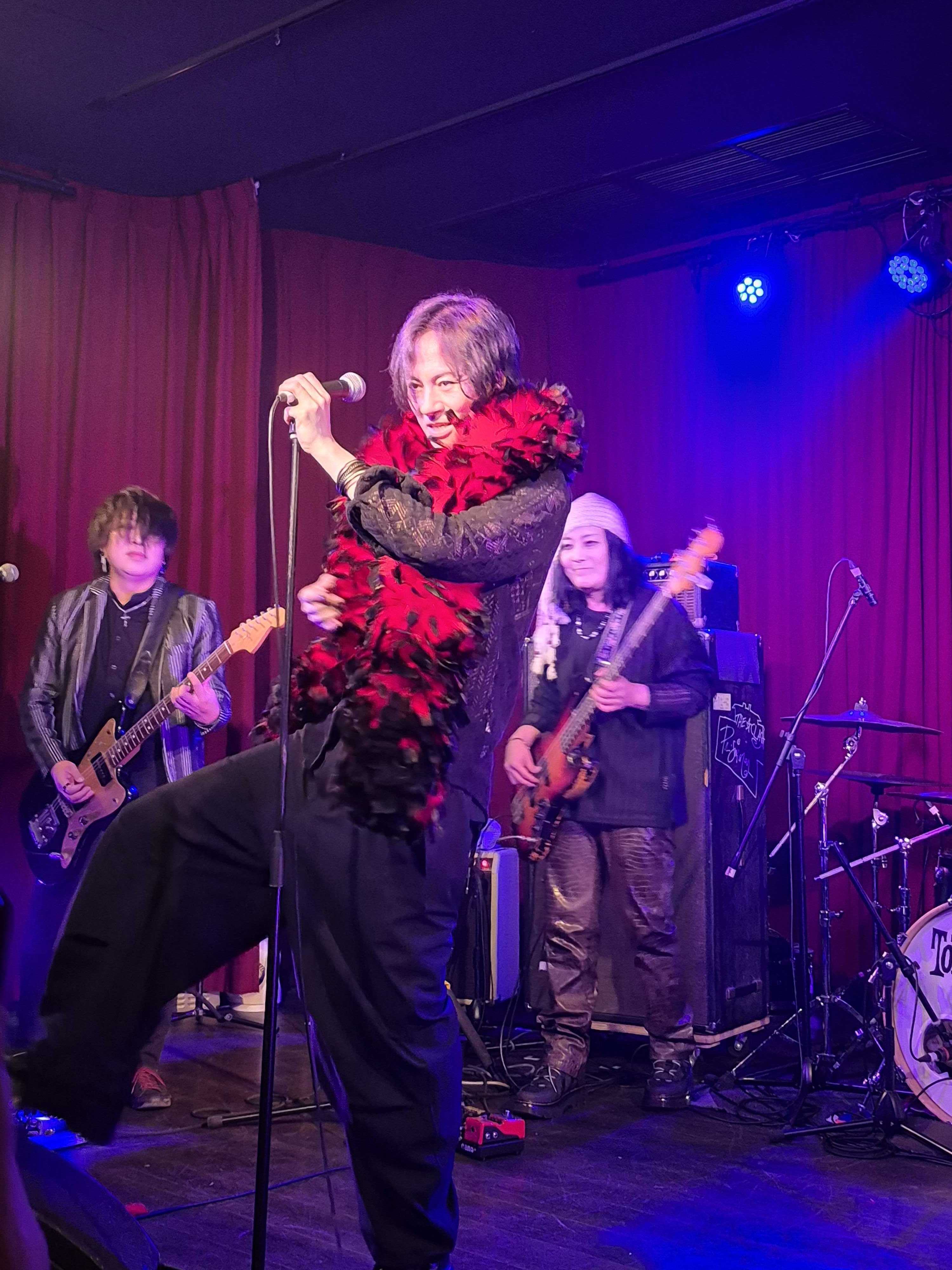 ![]() さあ、次が私の大大大本命・NEARMISSです! こないだの横浜よりも近くで見られるのでドキドキです。私の周りもずいぶん熱気が増してきた感じがしました。 そして暗転。こんなに早くまたNEARMISSが見られるなんて…とすでに私は感無量。早い。 ![]() この日のNEARMISSは「グラム」な感じでということでしたが、YU-KIさんの装いがですね!素敵すぎなんですよ!! 黒と赤の羽根のふわふわマフラー?(ご実家から見つけてきたお高いモノだそうです)をふわりとかけて登場したYU-KIさんは、出てきた瞬間にもうグラムロックスターでした。私の目は釘付けでした。あのふわふわで自分をぎゅっと抱きしめるようなシーンがあったんですが、あれはひとりブレバニにしか見えませんでした。むちゃくちゃカッコ良かった。 ![]() 横浜とはまったくセトリが違いまして。 まさにグラムなNEARMISSを詰め込んだ珠玉のセットリストでした。 最初のLOVE TO MEからセクシーなグルーヴ感であっという間に乗せられ、Darlin'の印象的なイントロに酔う。至福だ。Just Two Of Usでしっとり、Romantic’s Highでさらに妖艶なNEAMISSの世界に浸る。最高だ。 ![]() NOMEANINGPROSEでさらにズブズブに浸る。エロティックです。 次のRock On、大好きなんですよ。エレクトリックなギターサウンドにYU-KIさんの声が乗ると、途端にグラムチックにセクシー度が増す。前回はドラムスがKenさんでしたが、今回はIzumiさん。終始「一打入魂(ご本人より)」のスタイルがド迫力でした。 ![]() 最後はやっぱり「RED HOT LOVE」。これ本当にいいですよね…たまらんですよね… でもこれやると終わりなんですよね…。と、嬉しいくせに寂しい気持ちを同時に抱えつつ、めいっぱい楽しみました。 で、観客の皆さんやっぱりYU-KIさんとSoeさんが絡むとカメラを取り出す(私もまねっこしました。)。笑 SoeさんとMiwaさんのギターは、どっちがどう弾いているのかを見比べるのがけっこう面白くて。あ、こっちなんだ!とか新しい発見をしつつ(横浜では全然見えなかったので)、お二人のギターカッコいいわ…とうっとり。 MASAAKIさんのベースがしっかりとバンドの骨組みとなって、そしてあのほんわかした笑顔がまたバンドを包むような優しさを感じさせて、私はいつもMASAAKIさんを見るとニコッとしちゃいます。 Kouさんがいることでサウンドに彩りと華が増すような気がします。シンセかき鳴らして一回だけ前に出てきてくれましたが、私はもっと出張るKouさんが見たい。笑 セットリスト 1.LOVE TO ME 2.Darlin’ 3.Just Two Of Us 4.Romantic's High 5.NOMEANINGPROSE 6.Rock On 7.RED HOT LOVE 今回のグラムなNEARMISSは、NEARMISSの真骨頂を見せてくれたように感じました。ロックはセクシー、それを地で行くサウンドは、久しぶりに私をドキドキさせましたよ。カッコいい、素敵!と目をハートにして見てた若かりしし自分を思い出し、それと大して今も変わってないことに多少苦笑いしつつも、そんな自分がいてもまあいいかと思いました。一周以上回ってくると、ちょっとはおおらかになるものなのです。 前回はBeautiful Aloneが入ってて勝手にStrangeloveとこじつけて喜び、今回はJust Two Of Usが入っててSuedeとこじつけてまた喜ぶ私。苦笑 HOLICSもSo Youngって曲あったしね!その上、このあとのMILKY SWEETのMILKYさんもSuedeがお好きとのこと。最高じゃないですか! お気に入りの記事を「いいね!」で応援しよう