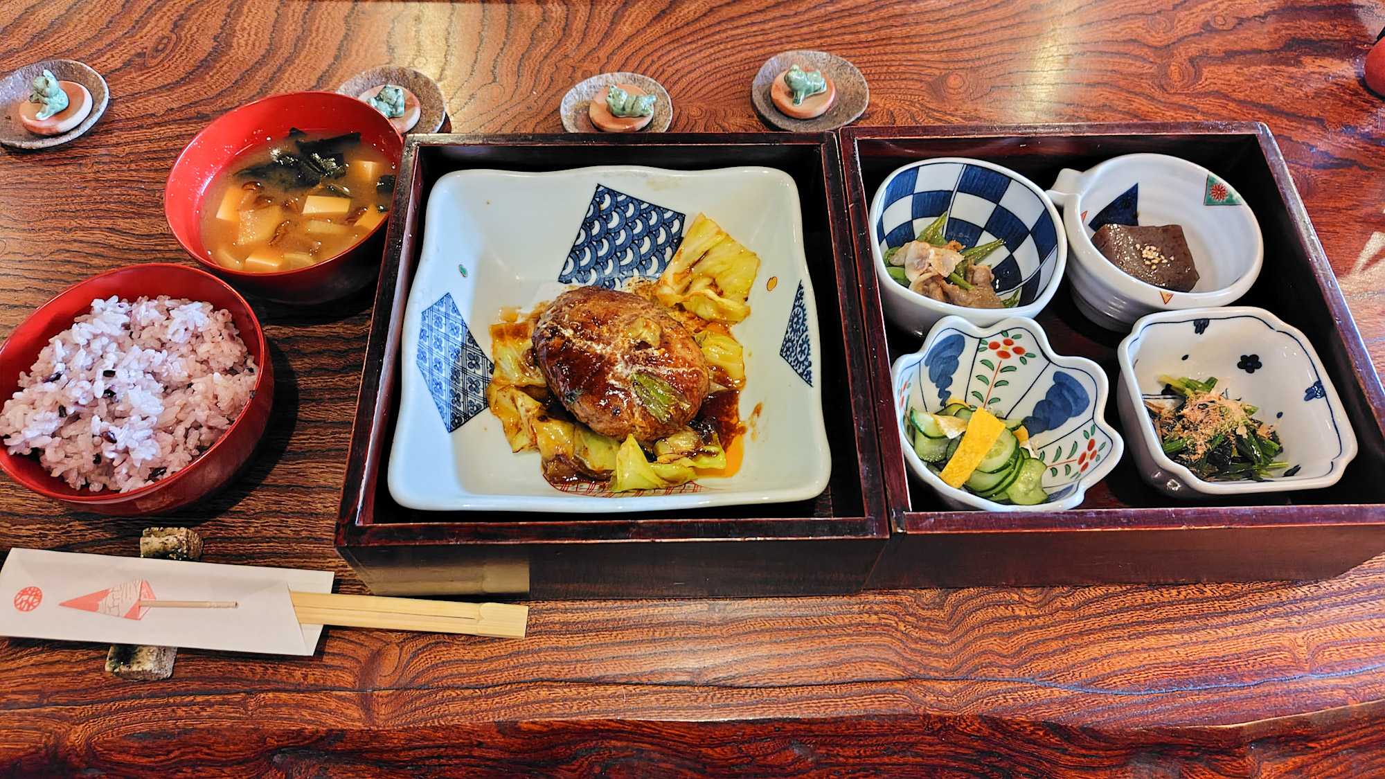 ![]() 飲み物聞かれ、しばらくして重箱が出てくる。 ![]() そしてご飯と汁が出てくる。重箱の中はメインとサブ。メインがハンバーグでラッキー。 ![]() 元々骨董品屋か民芸品店だったのかな。骨董品類が飾ってある。板敷きに座卓、座布団に座る。 ![]() 食後は、コーヒーだけでなくデザートも付いてた。 ![]() お土産に箸もらった〜。 ![]() 駐車場は店の前かな。隣の空いてるとこでもと言われ止めた。そうそう心配な価格は1500円だった(笑)。 お気に入りの記事を「いいね!」で応援しよう