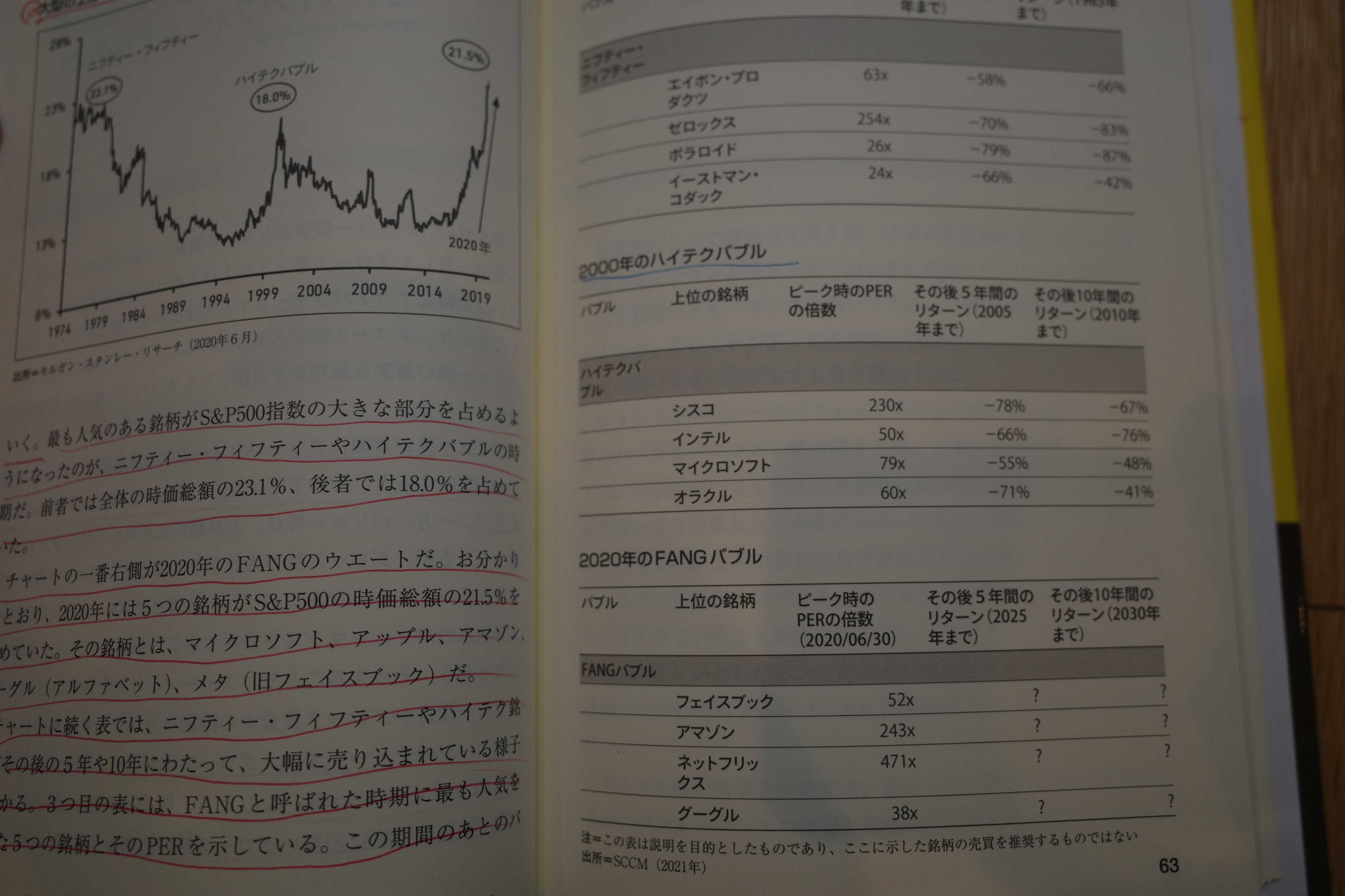 さて今日は株式投資本オールタイムベスト151位 第5章の「バリュー投資対グロース投資」で見てきたが、バリュー株が一貫してグロース株をアウトパフォームするばかりか、たいていは大幅にアウトパフォームするのはにわかに信じがたい。前述したとおり、グロース株が人気を集めると、すべての熱狂と注目がバリュー株の着実な成功をかき消してしまうので、気がつかないだけなのだろう。 最も人気のある銘柄がS&P500指数の大きな部分を占めるようになったのが、ニフティー・フィフティーやハイテクバブルの時期だ。前者では全体の時価総額の23.1%、後者では18.0%を占めていた。 チャートの一番右側が2020年のFANGのチャートだ。お分かりのとおり、2020年には5つの銘柄がS&P500の時価総額の21.5%を占めていた。その銘柄とは、マイクロソフト、アップル、アマゾン、グーグル(アルファベット)、メタ(旧フェイスブック)だ。 チャートに続く表では、ニフティー・フィフティーやハイテク銘柄がその後の5年や10年にわたって、大幅に売り込まれている様子が分かる。3つ目の表には、FANGと呼ばれた時期に最も人気を集めた5つの銘柄とそのPERを示している。この期間のあとのパフォーマンスがどのようになるかは注目に値する。