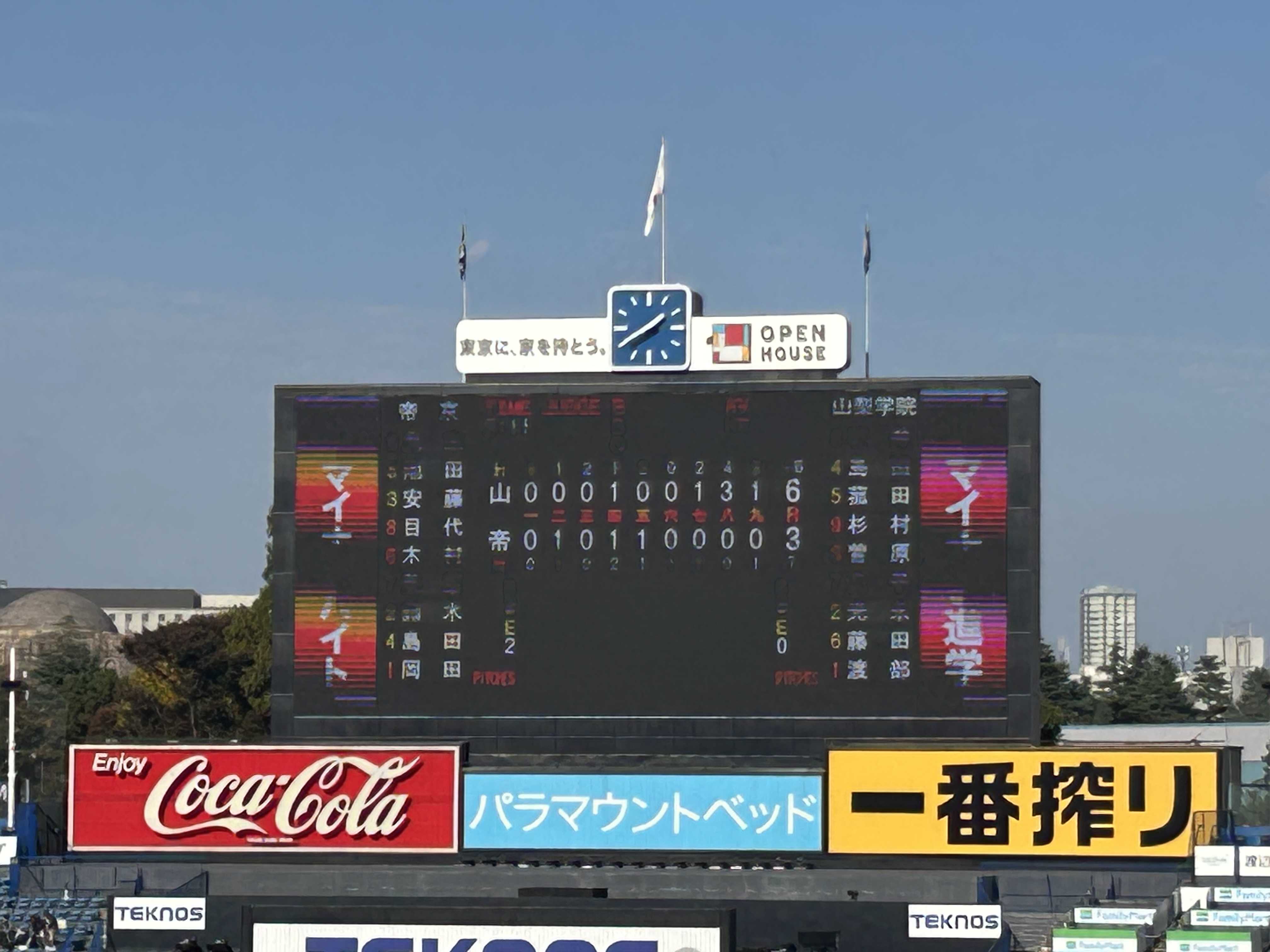 14日の続き ![]() 第二試合「山梨学院−帝京」 「山梨学院」 神宮大会は… 「英明戦」以来3年ぶり 今年の選手権 ベスト4 この時エース番号だった「菰田」 まだ故障や疲れからか?背番号「5」で登録 それでも今大会優勝候補。 「帝京」 16年ぶりの神宮大会! 前田さんが勇退して 「金田」さんにバトンを渡されて 中々、優勝いや甲子園へと結果が出なかったが この秋、ようやく都大会優勝! 念願の甲子園へ 神宮で帝京を観れるよりも 甲子園で観れるのが今から楽しみです。 そしてこの試合は 「関東地区−東京地区」 の対戦! 毎年センバツの選考会で 揉めるというか 賛否が出るのが 「関東、東京の最後の枠」 「東京も関東大会に出るべき」 「関東−東京の該当校の決定戦やるべき」 そして 神宮大会で「関東−東京」を組ませるべき との声がある中での実現したカード ![]() 二回裏「帝京」 一死走者無し 6番「蔦原」 左オーバーホームラン ①点 四回表「山梨学院」 一死1,3塁 8番「藤田」 スクイズ ①点 四回裏「帝京」 一死2,3塁 6番「蔦原」 中犠飛 ①点 五回裏「帝京」 一死2塁 1番「島末」 中安打 ①点 七回表「山梨学院」 二死2塁 3番「菰田」 左中間安打 ①点 八回表「山梨学院」 二死満塁 1番「石井」 中オーバー二塁打 ③点 九回表「山梨学院」 二死2塁 7番「光永」 左線二塁打 ①点 ![]() ○第56回 明治神宮野球大会 【高校 1回戦】 2025年11月14日 神宮球場 山梨学院 000 100 131 | 6 帝京 010 110 000 | 3 山梨学院が先制して直ぐに 帝京が同点、逆転に成功 帝京エース「二禮」の変則投球に 打ちあぐねてたので このまま帝京ペースで行くと思ってた それが 八回二死走者無しから 「4連打」で逆転! いゃ〜〜帝京は惜しい試合だったな。 「山梨学院」四回表同点場面。 1,3塁で 8番「藤田」 送りバンドの構えからのバント 3塁走者は投球と同時にスタートしてたので 「スクイズ」だったのか? それとも1塁走者を2塁へ進ませる為の 「送りバンド」で3走がスタートを切っちゃった のか? 滅多にないプレーだった… 山梨学院=「関東地区」が勝った訳だけど 選考会で この結果を考慮して 『関東>東京』と判断するのか? いゃ〜〜 これで最後の一枠は「関東に」 って訳には … これはこれで賛否が出るでしょう きっと。 高校野球 ブログランキングへ お気に入りの記事を「いいね!」で応援しよう