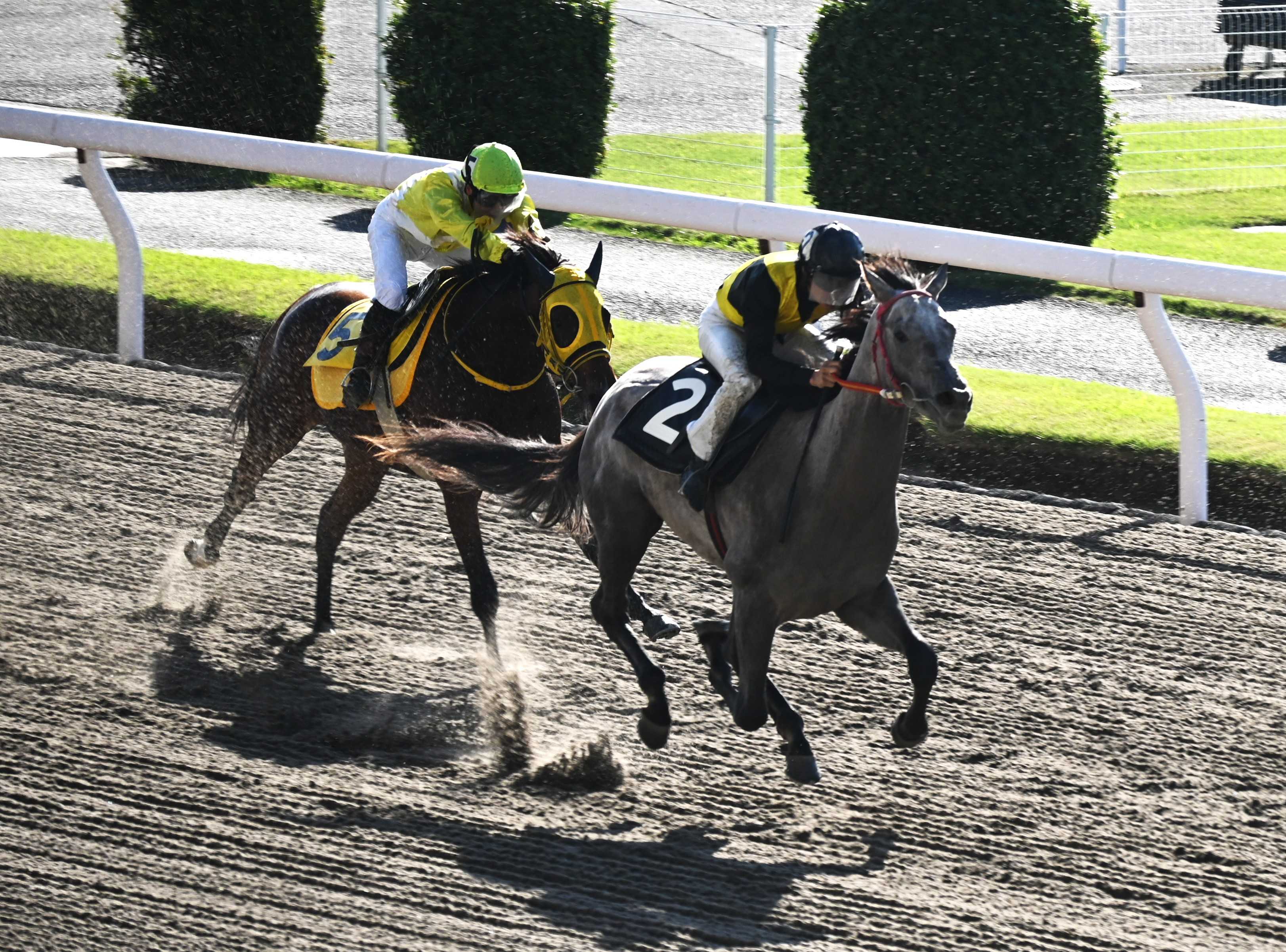 ![]() 試験開始前、パドックを周回するフルミネビアンコ号、かっこいい☆彡 本日、フルミネビアンコ号が川崎競馬場にて行われた能力調教試験を受検、無事合格致しました: 〇 能力調教試験は川崎競馬では、毎回開催の最終日の早朝に行われる。能力調教試験とは南関でデビューを控える競走馬たちが所属場所で受ける試験で、主にゲート内の駐立(Min1分間)、800mを規定タイム(2歳馬は55.0秒)内で走り切ることが求められる。今回能力試験を受ける2歳馬達が多くて、48頭もの登録があり、9組に分かれて試験が行われた。 〇 我らがフルミネビアンコ号は第5組。発走予定時刻は午前8:15ということで先輩と7時半に川崎駅で待ち合わせて、競馬場に向かった。到着するとこの能力試験に出走を予定している馬たちの馬運車が続々と到着しており、フルミネビアンコ号もすぐ確認することが出来た。早朝であったが競馬場は馬と関係者で既に活気があふれていた。 〇 調教師さんと雑談をしながら、いよいよスタートの時間が近づき、我々はパドックへ移動、そして試験自体は観客席スタンド2階から見させてもらえました。フルミネビアンコ号は黒帽(2番)。試験となった800mのレースを写真で紹介します: ![]() 1分間の駐立は何とか我慢した。 でもスタートは出遅れたようだ(逆光で肉眼では全く分からなかった苦笑)。 ![]() 中々エンジンが掛からずに後方のまま直線に。 直線では大きく外に出して騎手もGOサイン、追い込みを始める(左から2頭目)。 ![]() 直線半ばほどからようやくエンジンが掛かったようで鋭い脚を披露。 併走する馬を置き去りにするも、前を行く馬は捉えられずに6頭中4番目でゴール☆彡 〇 レース後跨った櫻井騎手に直接お話を聞きましたが、やはり初めてということでスタートで少し煽ってしまったのとストライドが大きいのでスピードに乗るまでに少々時間がかかってしまったこと。距離は長い方が間違いなく良い(適正は1800mや2000m戦か?)と話していただけました。 〇 2歳の新馬戦は1400m戦しかないので、新馬戦ではスタートして最初はスピードに中々付いていけずに勝ち上がる芸当は難しいかもしれません。しかし、今日直線見せてくれた脚はしっかりとした脚でしたし、慣れてくれば、また距離が伸びてくれば間違いなく期待して良いと思います。 〇 フリオーソ産駒は過去ノルマンディーOCのエントジアスタ号に出資しており、その馬はいつもゲート出て後方に下がっていった記憶がありましたが、フルミネ君は融通性はずっとありそうですね(笑)。 ![]() フルミネビアンコ君、お疲れさまでした。デビュー戦期待しています☆彡 お気に入りの記事を「いいね!」で応援しよう
