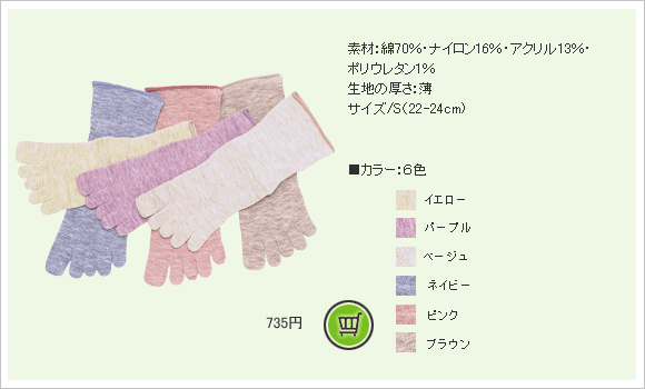 【5倍ポイント】<10/24 12:00まで>★五本ゆびソックス、新アイテム入荷のご案内です http://www.hakimono.info/fs/kenkou/c/gohonyubi_socks おすすめはシルク。とにかくあったかい!■5本指ソックス婦人用・かすり模様(ウール)(1,575円) http://www.hakimono.info/fs/kenkou/gohonyubi_socks/fujinkasurimoyou味わいのあるかすり模様。すてきな色合い3通り。 どれにしよーかなー 悩みますよ■5本指ソックスはき口ゆったりあったか遠赤外線 22cm~26cm(840円) http://www.hakimono.info/fs/kenkou/gohonyubi_socks/ensekigaisen ふんわりした素材で、はき口もゆったり。伸縮性もよいです■ゆったりウール&裏シルク 22cm~26cm(1,575円) http://www.hakimono.info/fs/kenkou/gohonyubi_socks/fujinwoolsilk表は毛100%、裏はシルク入り。1足で冷え取り効果があります!■絹100% 5本指ソックス 22cm~26cm(1,155円) http://www.hakimono.info/fs/kenkou/gohonyubi_socks/fujinkinu100 「冷えとり」の重ね履き用で、一番下に履く 絹100%の5本指ソックス」ができました! ★無縫製の「のびのび」&「あったか」ベスト■無縫製(ホールガーメント) 不思議なベスト(3,675円) http://www.hakimono.info/fs/kenkou/kenyo/fushigivest 軽いから、シャツ・セーターのインナーや就寝時にも最適。 驚くほどの伸縮性!