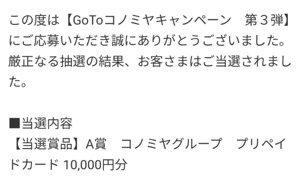 GoToコノミヤキャンペーンでプリペイドカード10,000円分の当選通知が2つ届きました🎉