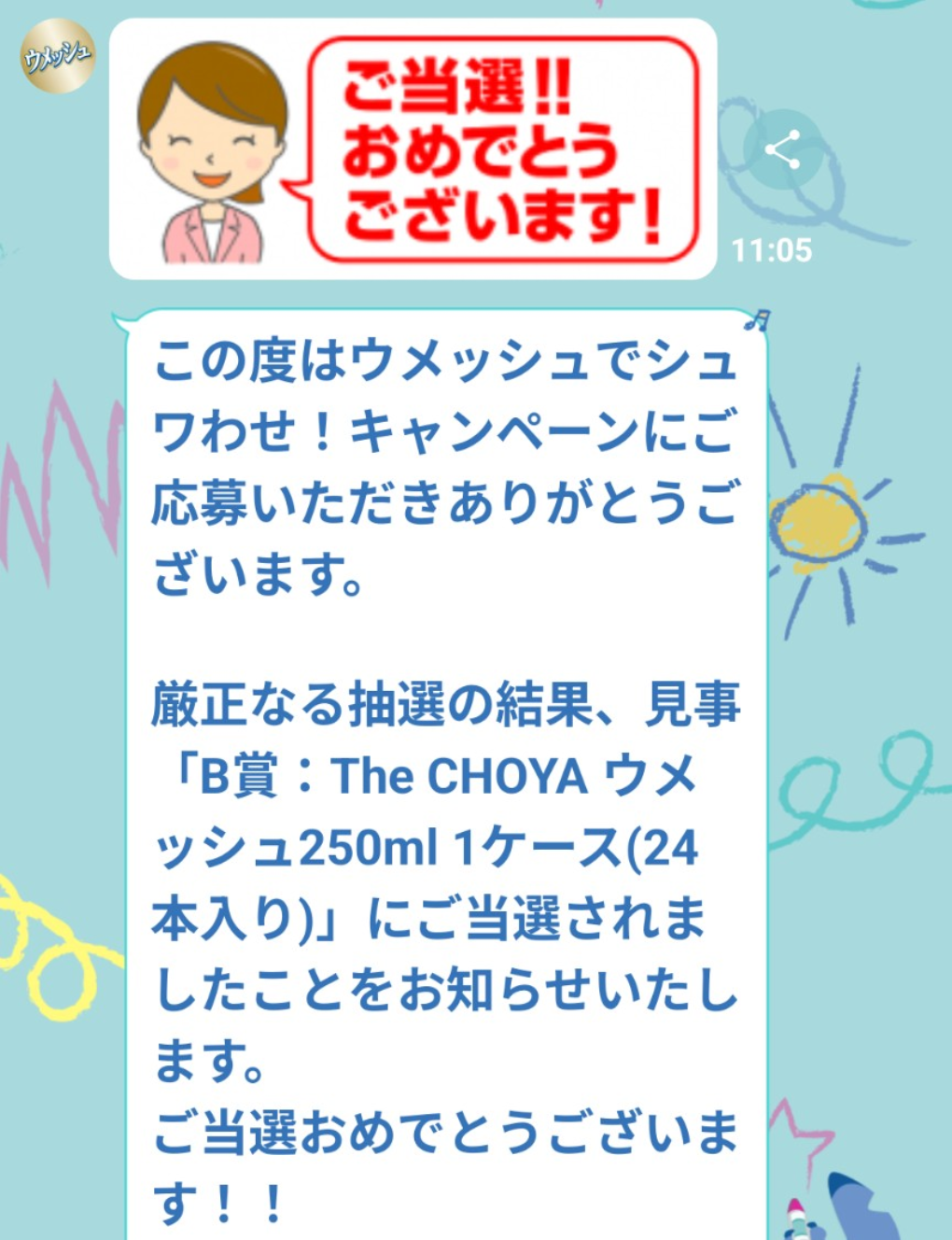 ウメッシュでシュワわせ!キャンペーンでチョーヤのウメッシュ1ケース当選の通知が来ました🎉皆さんの当選報告から10日程遅れて来ました。繰り上げ当選かな〜🤔