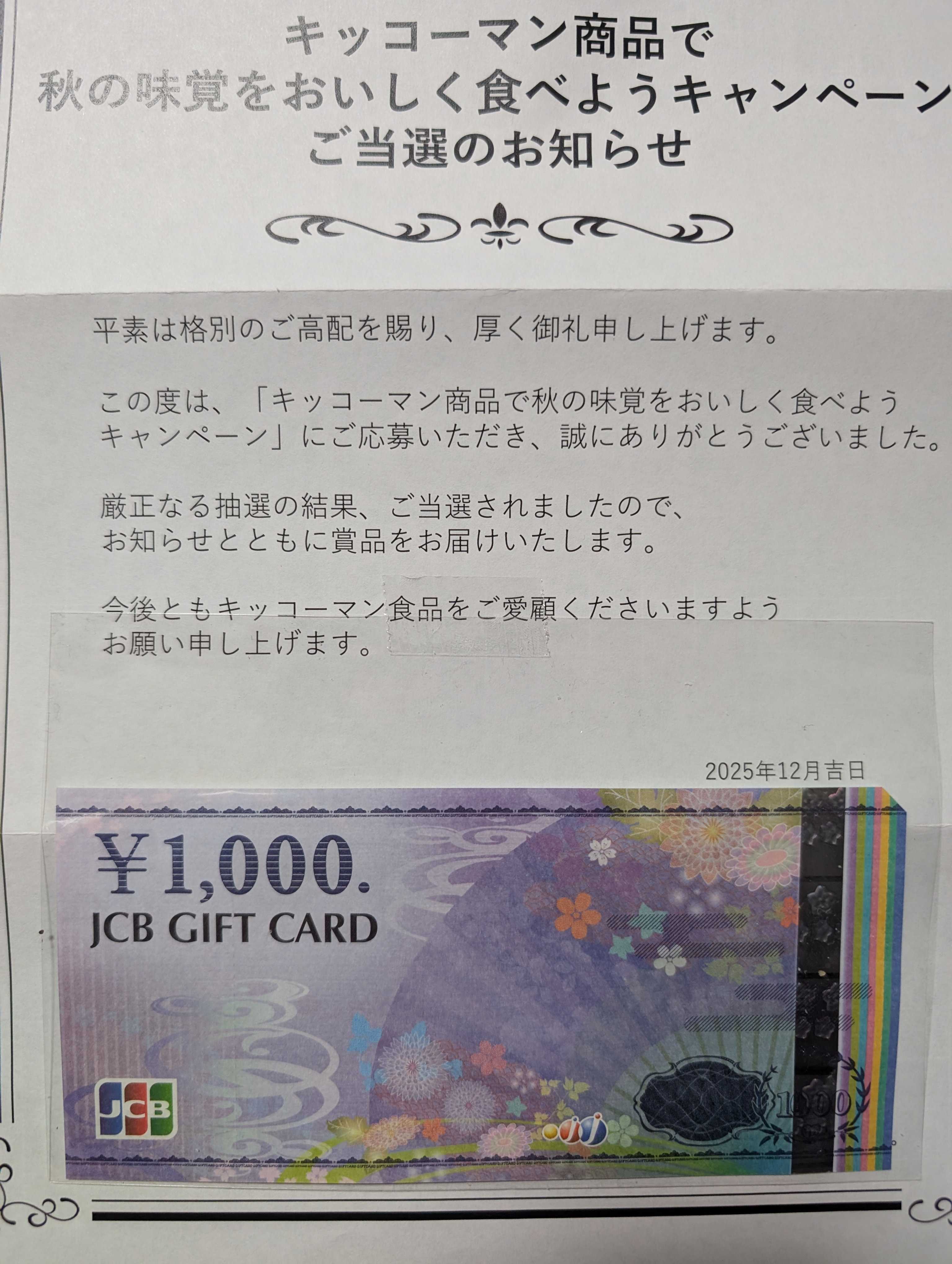 キッコーマンさんとプラントさんのキャンペーンでJCBギフトカード当選しました🎉WEBからとハガキからと当選しました🎉
