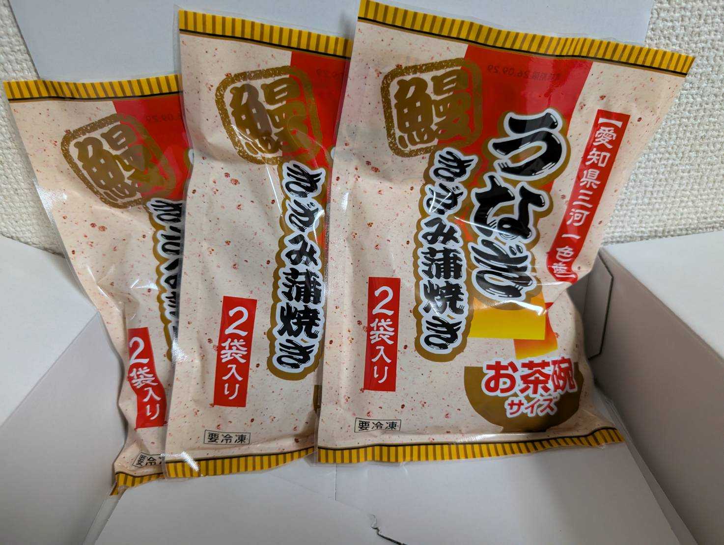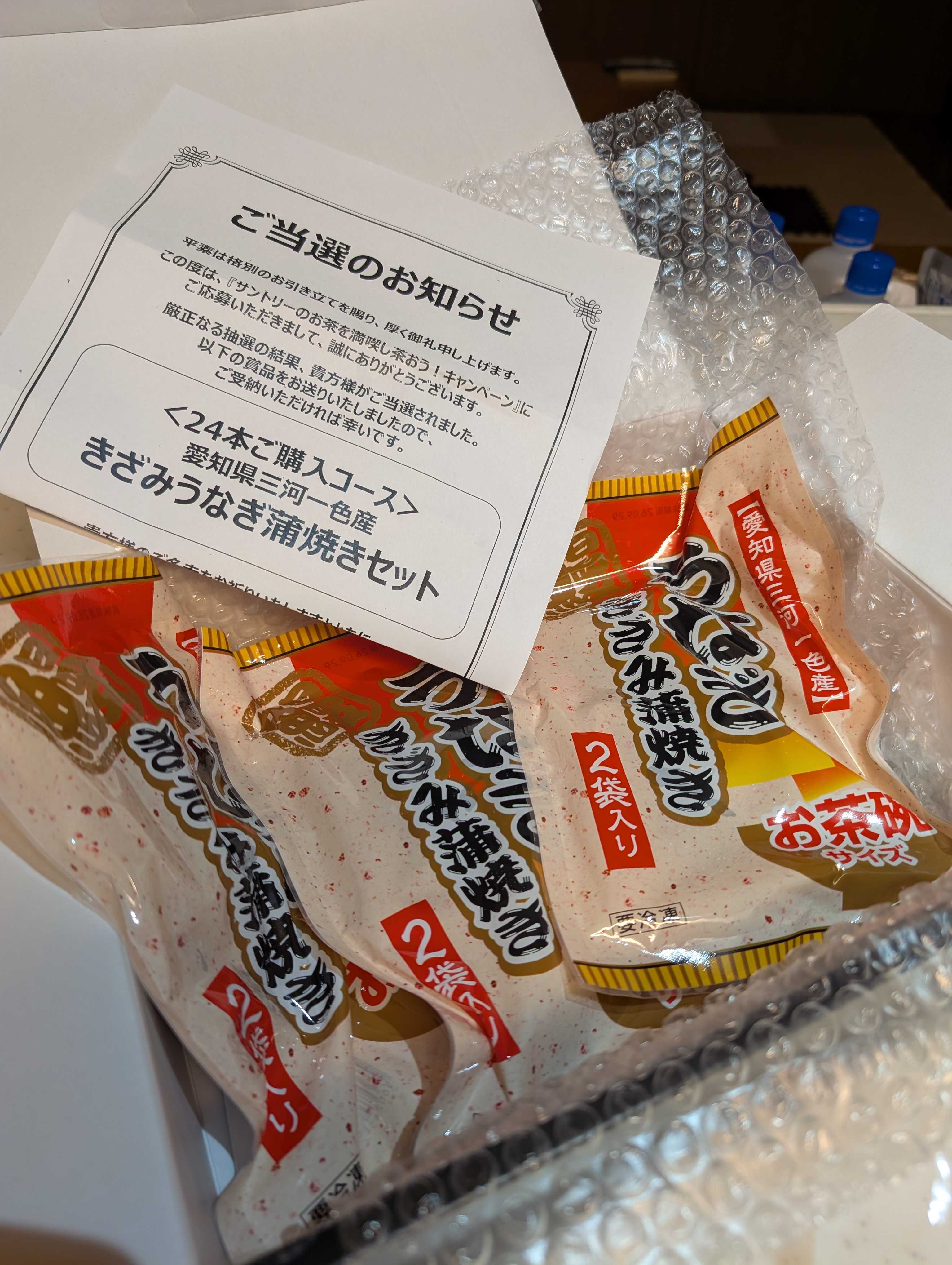 サントリーフーズ東海北陸キャンペーンで当選していた三河一色産きざみうなぎ蒲焼セットが自宅と主人社宅に届きました🎉