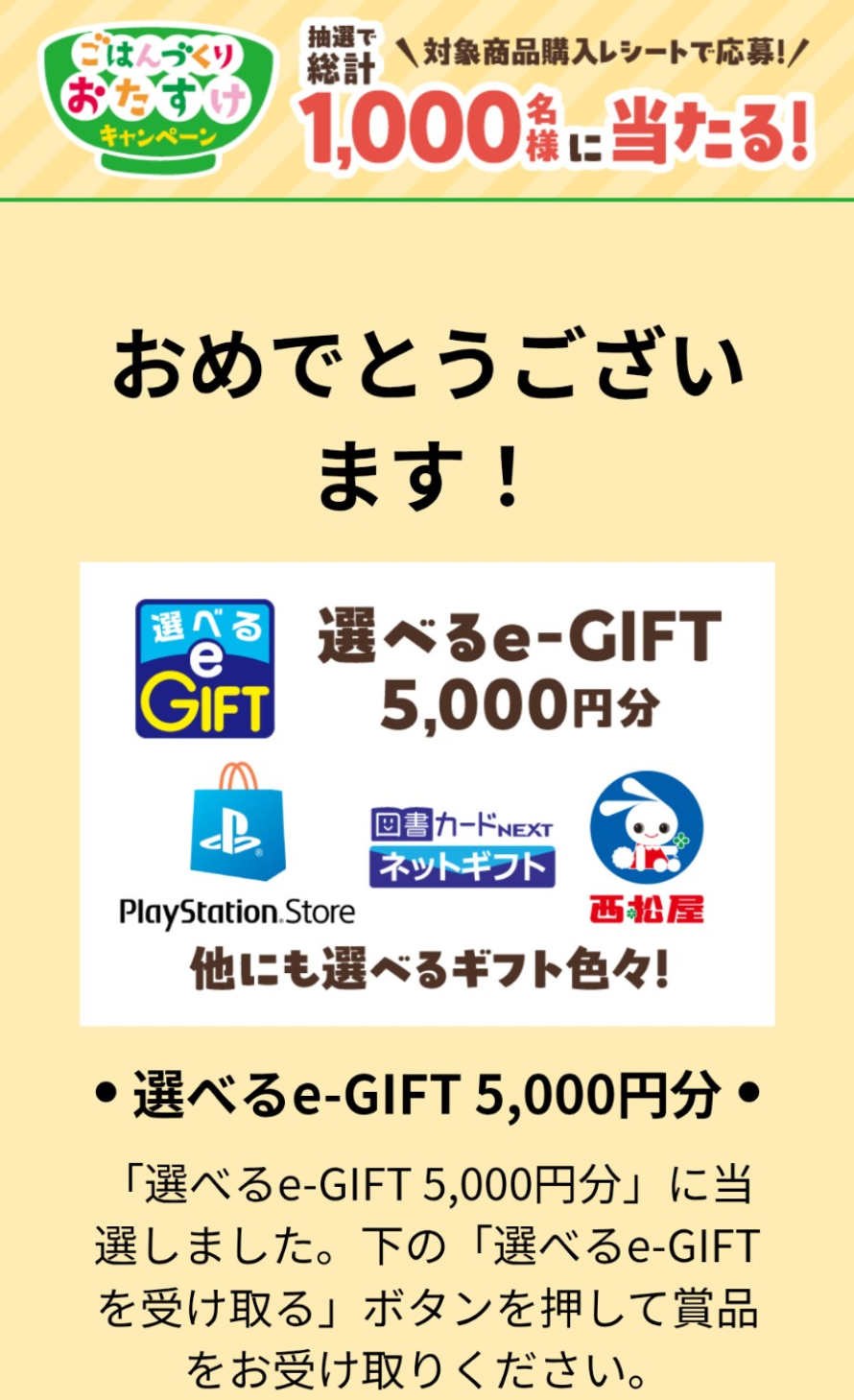 フジッコさんのキャンペーンで選べるe-GIFT5,000円分当選しました🎉