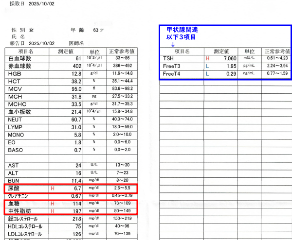 昨夜から降り出した雨は ![]() 今日も一日中、降り続いてます。 気温も22℃くらいまでしか上がらず肌寒い。 朝ごはん。 ![]() トースト、目玉焼き.. 他。 蜂蜜ヨーグルト、アイスコーヒー。 肌寒いけどアイスコーヒー飲んでます(^O^)/ お昼ごはん。 ![]() リンガーハットの冷凍ピリカラ長崎ちゃんぽん。 美味しく頂きました(^O^)/ *** おとといの定期の内科の通院での血液検査結果。 右側の甲状腺の数値3項目は 昨日も書いたように薬を減量することとなりましたが 問題は左側の赤い3項目。 ![]() 尿酸はこの一年くらい正常値の上限を前後していたので とりあえず置いといて・・ 今回、多分生まれて初めて?血糖値と中性脂肪が 正常値を超えてしまいました。 でも、原因は分かっているんです。 5月からの有休消化、退職以降 ほぼ毎晩、夕食後から寝る前までの飲酒。 薄めのレモンサワーを寝る直前まで テレビを見ながら飲んでましたからね(2~4杯) 早朝のウォーキングはしてるけど それ以外は簡単な家事しかせずぐーたらしてたので 多分、こうなるんじゃないかと思ってました(^_-)-☆ 体重も3月以降、約4kg増量。 そのせいもあり腰痛も増したように思います。 寝っ転がると腰痛もラクになるので 有職時に比べてゴロゴロしてる時間も増えました。 ・・・ってことで! 夕食後の飲酒は2日前からやめました! 元々、お菓子類の間食はほとんどしないので 原因はこの飲酒しか考えられないし 何より体重の4kg増加が それを物語ってる気がする。。(^_-)-☆ 1ヶ月後、再検査なので それまでに数値が下がるように努力だわ。。 体重は年内までに▲4kgを目指します。 あと、中性脂肪の数値の下の コレステロール3項目の数値も結構きわどい ただ、血圧は116ー64と普通に正常値だったので これだけは良かったわ。 しかし、甲状腺の数値以外のこと 先生には何も言われなかったけどいいのか?? ![]() 本日も長い記事にお付き合いいただき ありがとうございました 猫ブログも書いてます お気に入りの記事を「いいね!」で応援しよう