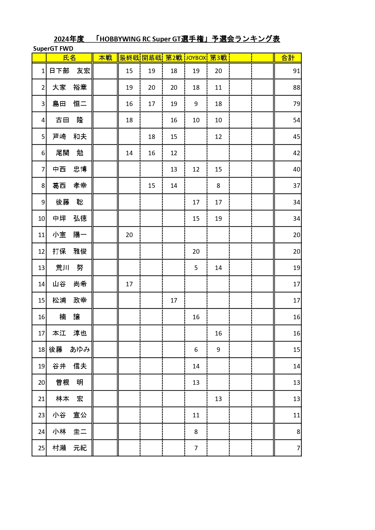 Hobbywing RC SuperGT選手権の全国大会の各サーキットの代表権は4WD・FWDから各3名となっています。