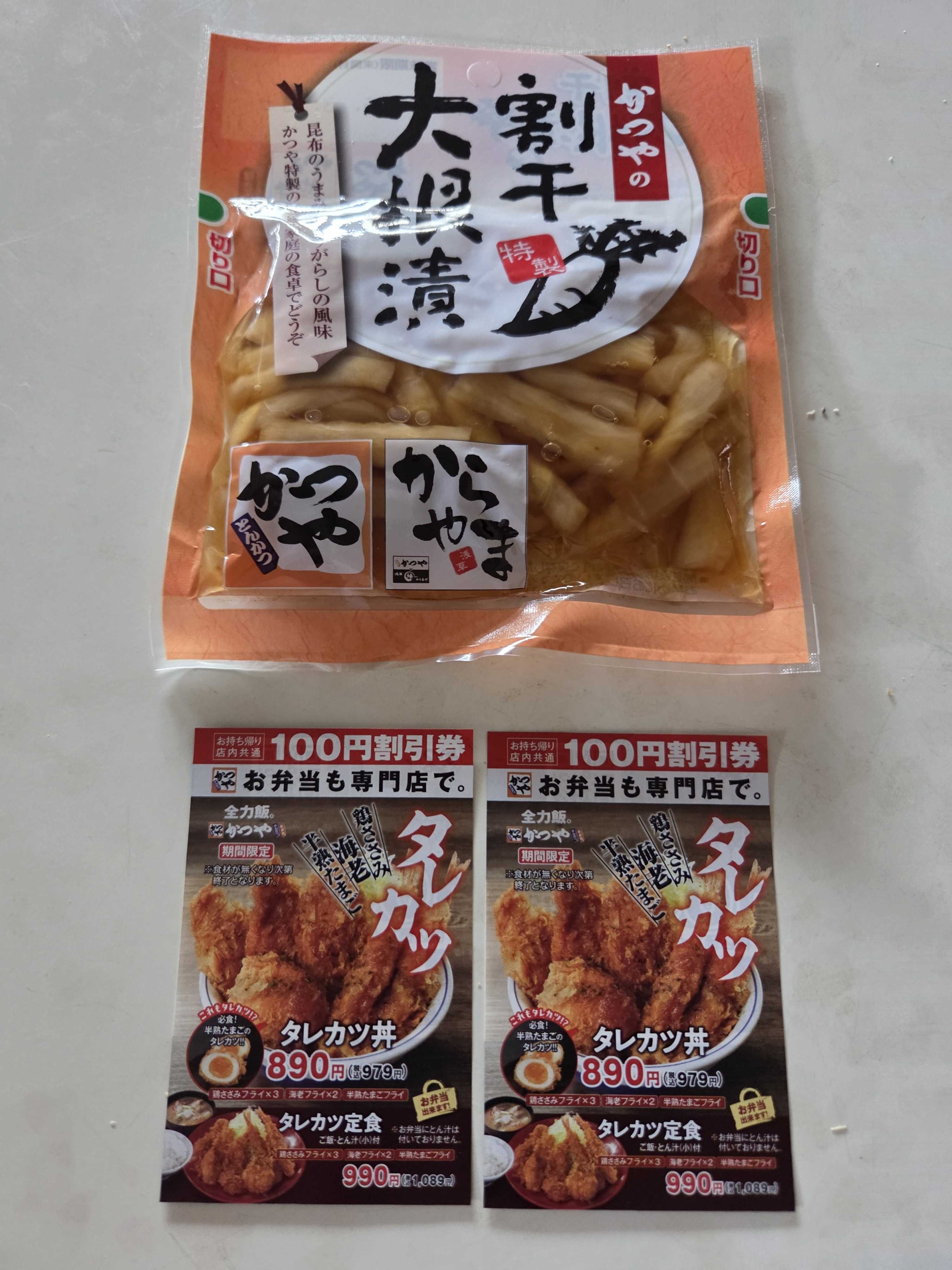 礼香先生と一輝君が、信州大近くの「焼肉きんぐ」で優待券を使ってしまったので、「ゆず庵」(ともに物語コーポレーション運営)には行けません。(現金使うのなら行けます) クオカードが使える「デニーズ」は前回行ったので、今日はその近くの「かつや」に初めて行ってみました。 先月カツ丼¥590ののぼりを見たからでもあります。 カツ丼(梅)・ソースカツ丼(梅)ともに¥620+税ですが、アプリのクーポンでそれぞれ100円引きです。 揚げたてカツが美味しいです。 11時半前ですが、満席+テイクアウト待ちです。 ほとんどの人が、紙のクーポン使用なので、リピーターですね。 席で食事の際無料の美味しい大根漬が100円なので買いました。 紙のクーポン、もらいました。 来月はどうしようかな・・・。 ![]()