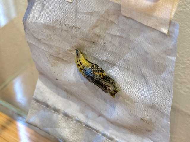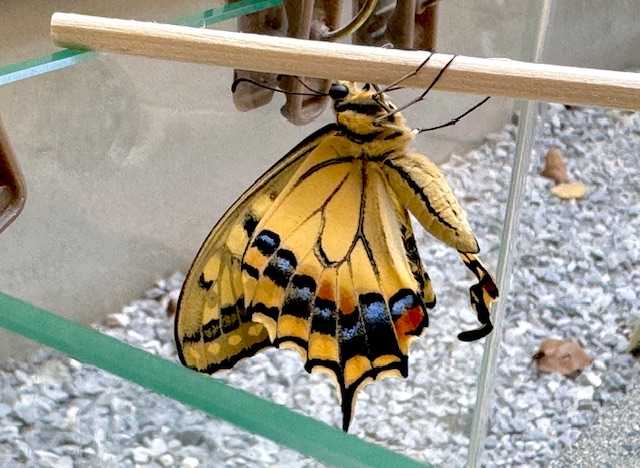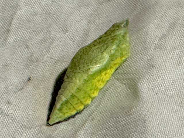 イタリアンパセリにキアゲハの幼虫がいたの。 ![]() むしゃむしゃ食べて、既に大きくなってるので、 見逃して成長を見守ることに。 と、思ったらその翌日には、 葉を食べ尽くしてドロンしちゃった。 何処かでサナギになってるのかな? イタリアンパセリは丸坊主。 この株、復活するかしら。。 今回のキーアイテム★「キアゲハとパセリ」 補足: アゲハは柑橘系の葉を食べるけど、キアゲハはセリ科の葉を食べるのね。知らなかったなぁ。 2025/10/11 自転車カバーの裏でサナギを発見。 ![]() このカバーも、ちょうど買い替え時なので、 サナギの周囲で切り取って丸っと移動。 ![]() 一旦、オリジナルの状態を温存。変な角度ね。 ![]() 外気温に近い、玄関ドアのすぐ内側。 昔、金魚を飼ってた時の水槽が活躍。 2925/10/18 9:00 模様が透けて見えてきたよ ![]() アゲハチョウの柄っぽくなってきたね ![]() 別の角度からの様子 2025/10/19 12:30 羽化。外気温23度。 ![]() ![]() うちのパセリを丸坊主にしちゃった張本人の羽化までを、見守りました。 にほんブログ村