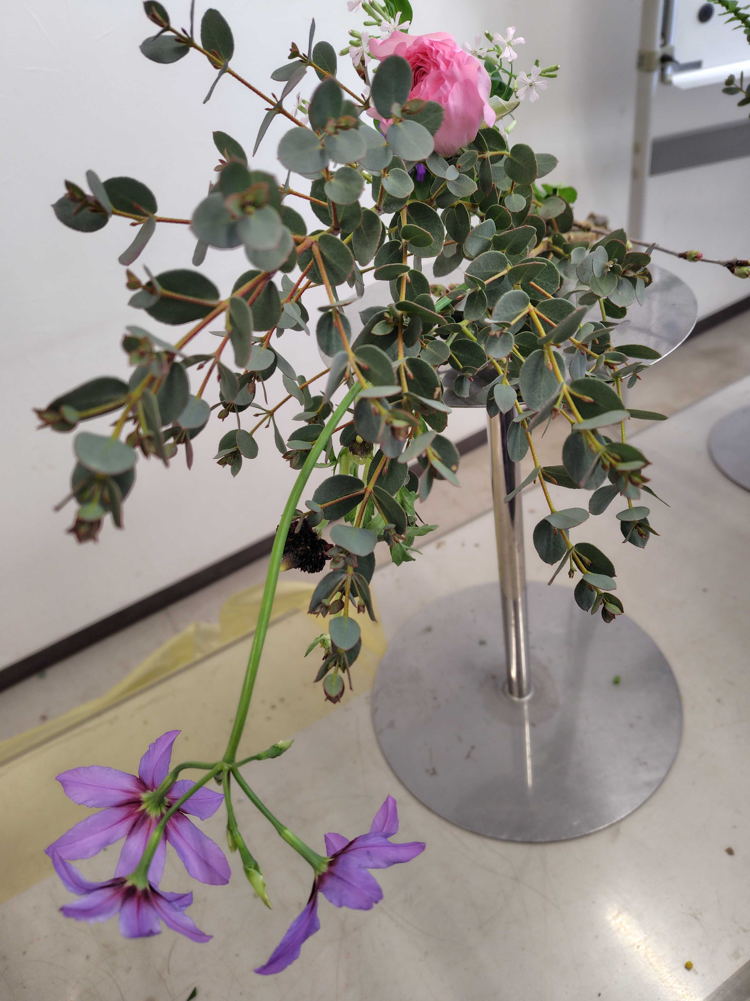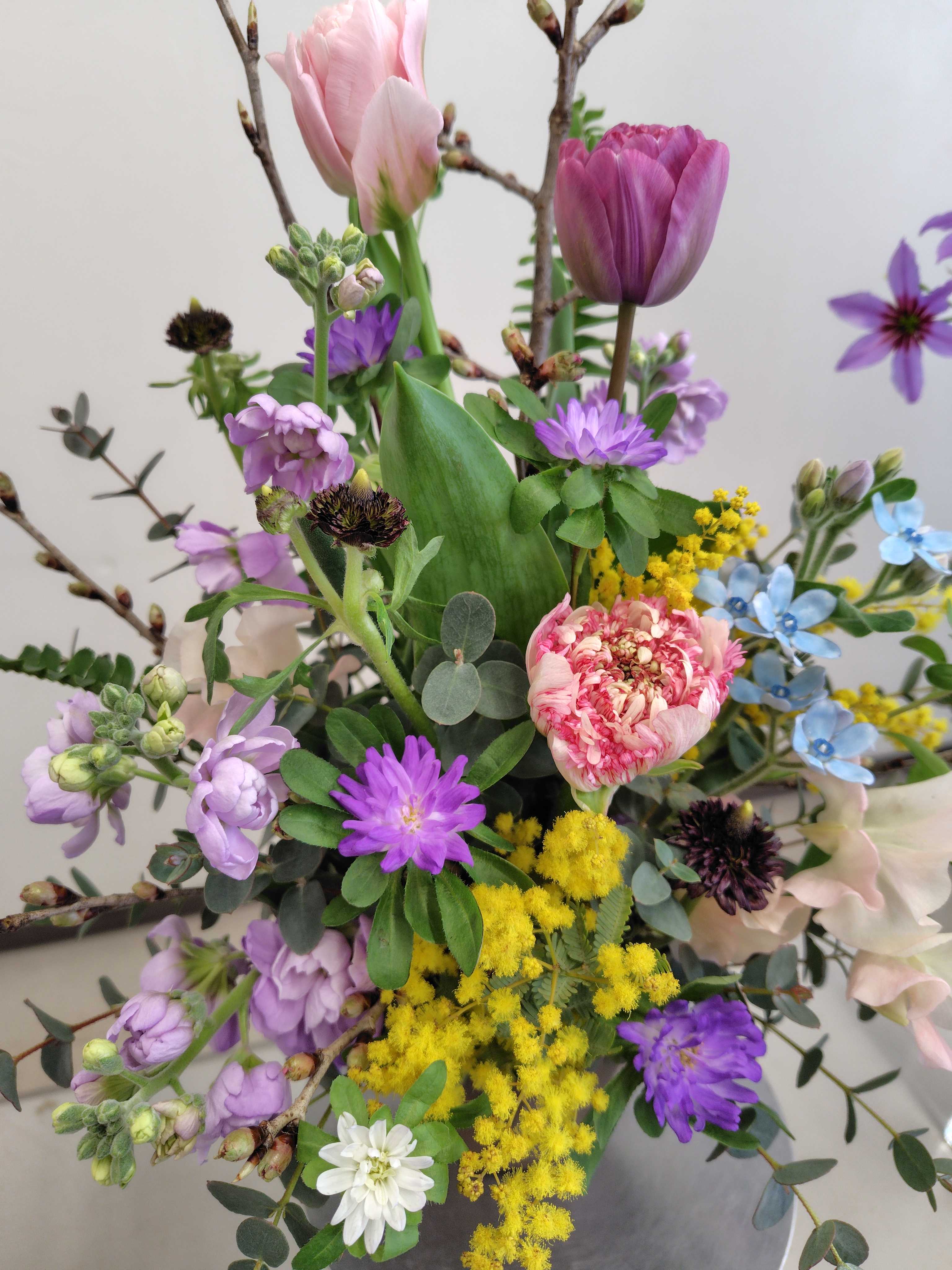 恒例の月一花屋のフラワーアレンジです🌷 ![]() ↑は、私の作品です🌟 今回は、桜🌸をあしらった春色アレンジです。 皆様のおかげで、順位は上昇 ↓ご訪問の記念に、是非ポチっとクリックで応援 シックな色合いの草花と鮮やかなミモザのコントラスト、桜🌸とタマシダで 動きを出し、立体感のある表情に仕上げます。 形は、ワンサイド(三方見)です。 高低差を付け、隣合う花を引き立てます。 ![]() ↑は、講師の見本です。 1 メイン花材、東海桜🌸の枝、タマシダを高めに入れ、広がりを持たせて、あしらいます。 チューリップ🌷2本(ドリーマー、ロージーダイヤモンド)、ラナンキュラス2本 (リナベスティ、リナララーシュ)を高さを変えて、オアシスの中央部に配置します。 2 副花材をあしらい、作品に「広がり」を出します。 アスター(ステラトップブルー)、ラナンキュラスを全体に散らして、 形を整えていきます。 ユーカリ、ストック(マリンカルテット)で、作品のアウトラインを作りますが、横に広がりを持たせて為、サイドは少し長めに。 ブルースター(ピュアブルー)、スイトピー(アプリコット)、ミモザ(ミモザアカシア)を中段から下段に配置し、華やかに彩ります。 3 仕上げに、ユーカリを長短を付けながら、オアシスの足元を隠します。 私は、桜🌸の短い枝も、無駄なく使いました。 全体のバランスを整えたら、出来上がり。 ミニブーケ💐 ![]() ↑は、講師の見本です🩷 1 メインはピンクのラナンキュラス(バリエール)で、サブにアスター、 白い小花のシレネ(サクラコマチ)、アクセントに香りが薫る紫色の リューココリーネ(カラベル)、グリーンはユーカリを使います。 私は、アレンジの余りの桜🌸、アスター等も入れました😀 2 形成 ラナンキュラス→ユーカリ→リューココリーネ→アスター→シレネ 3 結束をし、バインディングポイントを固定し、出来上がりです。 ![]() ↑は私の作品ですが、器に入れず、横にして撮影しました。 今回も、春らしいボリュームあるアレンジとミニブーケ💐が出来上がりました。 玄関が、花の香りとパワーで溢れて、華やかになりました💖 前回と同じく、チューリップ🌷、ラナンキュラス、ユーカリ、ミモザが入り、 とても春らしいです😍 ラナンキュラスは、苗も複数入手したので、自宅プランターに植えたら、 春らしい雰囲気になりました🤞 未だ三寒四温で気温が不安定ですので、ご自愛下さいませ。 お気に入りの記事を「いいね!」で応援しよう