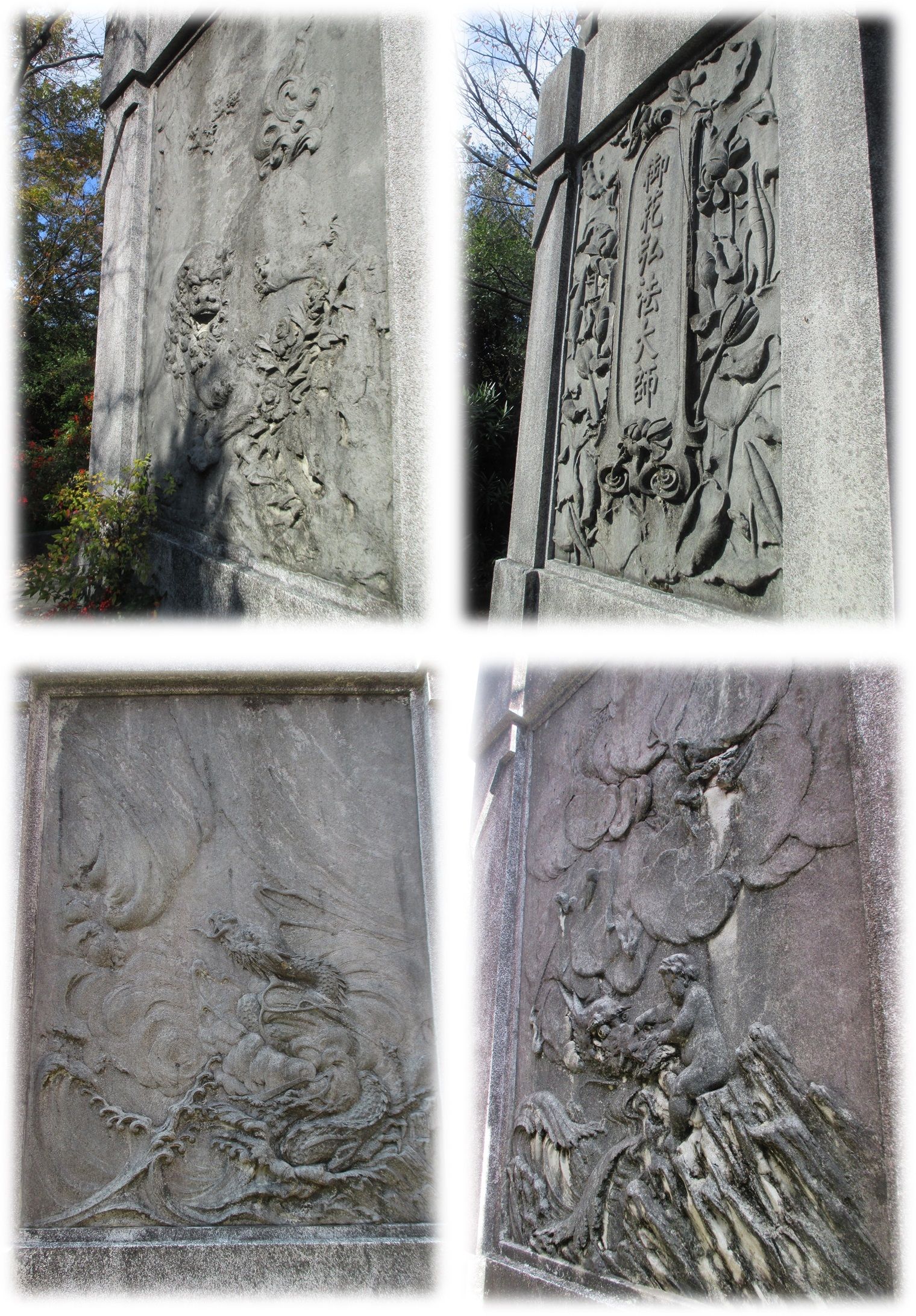 ![]() 「龍泉寺弘法大師堂」から県道15号線を南に渡り、15分程山間に向かうとゴルフ場入口に出ます。 そこから右手(西)の車道に向かうとゲートがあり、そこを先に進みます。 この辺りは小幡緑地本園の北に位置し、丘陵地の尾根に相当します。 ![]() ゲートを過ぎると直ぐ左手に広場があり、その北側に「御花弘法大師」が安置されています。 コンクリートで作られた像は桃太郎神社などでも見かけますが、大きさは台座込みで10㍍くらいでしょうか、大きさもなかなかですがコンクリートとは思えないいい表情をしています。 コンクリート像というと浅野祥雲が知られますが、同様にコンクリート像の御花弘法大師を作った花井探嶺は認知度が低い。 探嶺は三重県出身の菰野町出身の彫塑家で明治から昭和にかけて複数の像を作っていて、中村観音を造ったのも探嶺で、この像は1932年(昭和7)に開眼供養が行われています。 この像は尾張三大弘法の一つで「良福寺」、「退養寺」と御花弘法大師がそれになります。 ![]() 以前は大師像の左に朽ち果てた邪鬼が建っていましたが、崩壊の一途を辿り、修復の道を諦め撤去されたようです。現在は邪鬼の台座のみが残っています。 当時の倒壊寸前の状況から見れば、今は随分とすっきりした印象を持ちます。 ![]() そもそもは現在の名古屋鉄道の前進の一つで、大正から昭和初期、大曽根から瀬戸を結んでいた瀬戸電気鉄道の頃、現在の小幡駅から龍泉寺への鉄道敷設の計画が持ちあがったようです。 白沢公園から小幡緑地、江戸時代から続いた「御花弘法」の御花弘法八十八ヶ所霊場を含めた龍泉寺一帯を観光地化したかった様です。 「御花弘法大師」の座像は観光の目玉となる目論見の元に建てられました。 しかしその計画も頓挫、龍泉寺の管理から離れた弘法大師像も現在は荒廃が進んでしまいました。 ![]() 南の緑ヶ池を見下ろす様に座す大師像、右目の上は剥がれ落ち、このまま邪鬼同様に荒廃の道を辿るのかか・・・・・ ![]() 朽ちていくのを悟ったかのように、もの言う事もなく・・・・・ ![]() 弘法様の正面直下から見上げる、こうして見るとやはり大きい。 ![]() それでも今もこの大師像を慕って訪れる方は絶えません、訪れた際も線香の煙と生花が供えられていました。 周辺は綺麗に清掃され、像の内部も清掃の手が入っているようです。 こうして大事に守ってくれる人もいれば、落書きをしていく者がいるのは残念。 公園の中とはいえ、参拝目的以外にここまで訪れる人は少ないでしょう。 昔も今も弘法像周辺には人馴れした狛猫が弘法様を守護しています。 右の猫なんかは絶対飼い主がいたのでは? ![]() 大師像の右側は既に大きな穴が開いてしまっています。 現状でも周囲の看板に「近づかないように」と警告が貼られています。 ![]() 台座のレリーフはまだしっかりしています、これらも崩落しないうちに補修の手が入るといいのですが。 どこぞの花見経費の一部でも融通すれば、この姿も維持できるのに・・・・・ ![]() 大師像右の小振りな像は大きな痛みは目に付きません。 この一帯の森の中には細い道ができていて、道沿いにに多くの弘法像や石版が安置されています。 ![]() 愛くるしい表情の地蔵 この森で拾われた実った栗だろうか?地蔵に供えられていました。 ![]() 森の小道に安置されている石像群や大師が描かれた石版 ![]() 大黒様なんかもあったりする、結構ワンダーランドでもあります。 ![]() 御花弘法大師から少し南にある、緑ヶ池、すっかり秋の装いです 御花弘法大師 住所 / 名古屋市守山区竜泉寺2丁目-1218 お気に入りの記事を「いいね!」で応援しよう