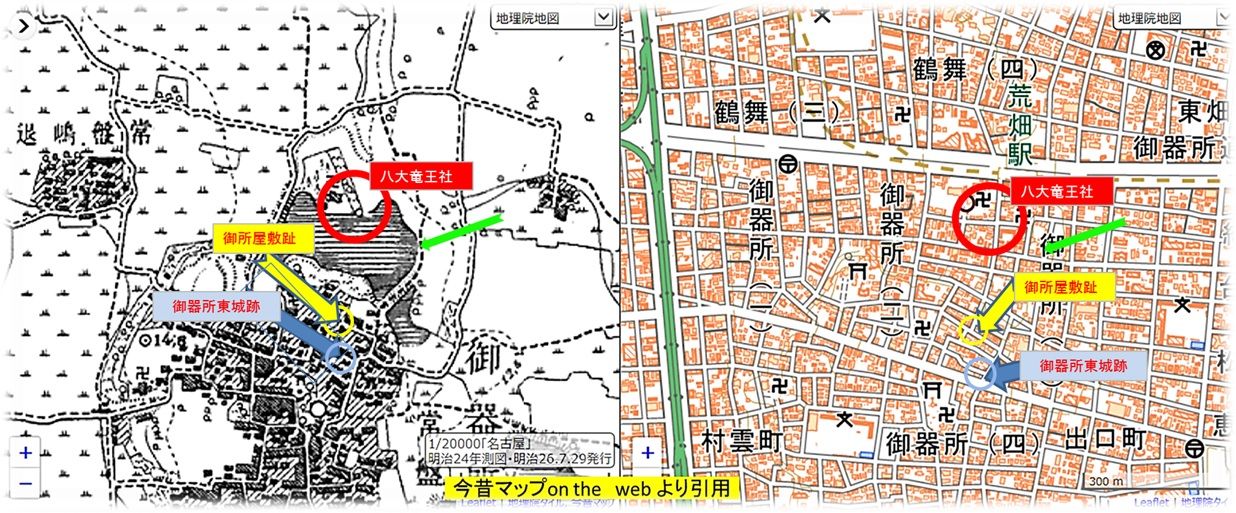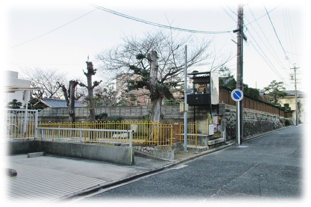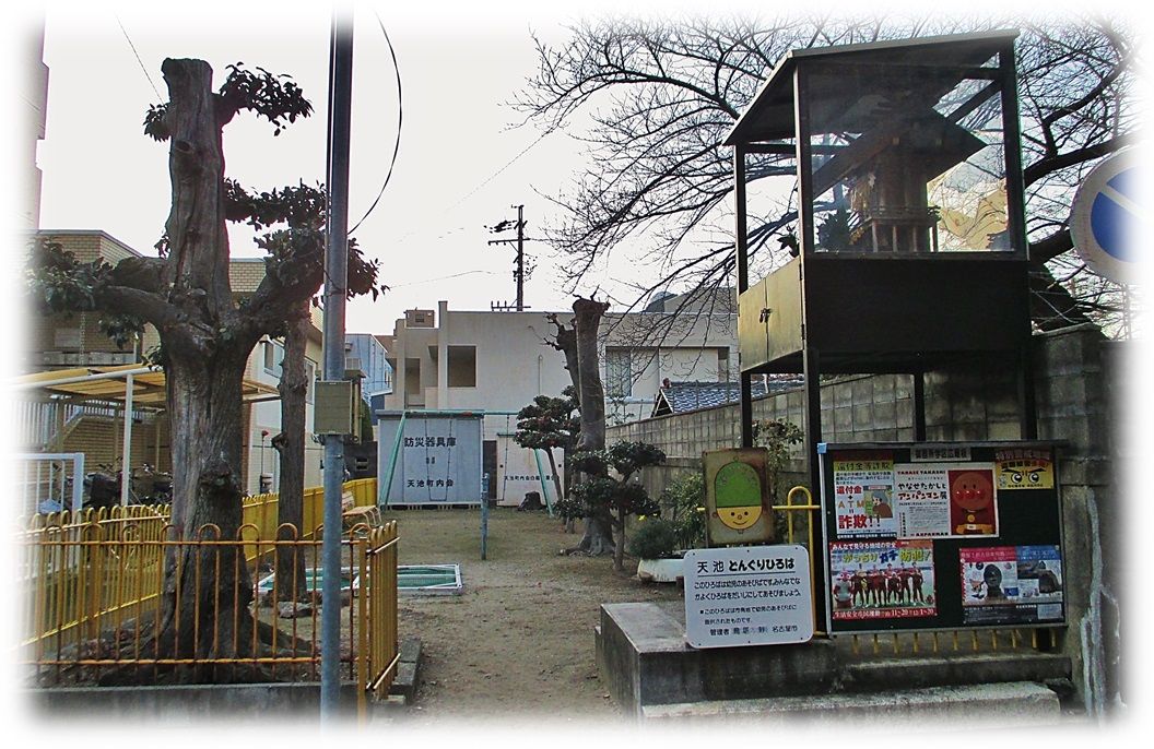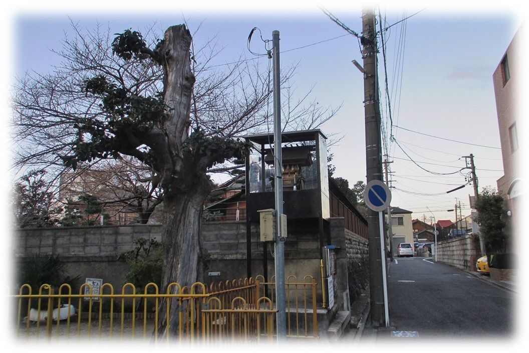 南北に伸びる御器所台地、ここから西側は精進川低地につながり、その先の熱田台地へ続きます。 なので緩やかな下りが続きます。 ![]() どんぐり広場南側の交差点から東の眺め。 この先が台地のピークになるのかな、そこから東は山崎川に向け再び下っていきます。 ![]() このあたりは明治頃には溜池が多く、すぐ西の龍興寺ヶ池を始め、広見池、天池、丸池など複数の農業用溜池があったところ、それらの池は大正から昭和の都市計画に伴い耕地から住宅地に変貌し、池は埋め立てられていきます。 ![]() どんぐり広場のある御器所3丁目の旧町名は天池町、由来は天池で、天池どんぐり広場の名もそこから付いています。 どんぐり広場とは 「地域の幼児の健全育成を図る目的と児童福祉の立場から、30㎡以上で無償提供される土地があり、交通事故のリスクがなく、地域の方々の管理・運営ができる場所に対し設置される子供の遊び場」。 免税対策の一環としてこうした用途に使われる場合があります。 ![]() 東西に長い広場の北隅に、鉄製の櫓が高く組まれ、その上に社が祀られています。 正面を除き、透明な樹脂パネルで社は囲われ風雨?から守られています。 こうした光景は社の大・小にかかわらず時折見受けられます。 覆屋の薄暗い中で祀られている事を思えば、これはこれで有りだと思います。 ![]() 黄色の柵で囲われた、どんぐり広場東方から西方向の眺め。 地域の方により管理された広場です、間口右の社も同様に町内でお世話されているものと思います。 賽銭箱は見当たりませんでした、公共の場と言う事で設置できなかったのかナ。 ![]() それにしてもここまで高くしなくとも。 いえいえ、元は近隣民家の軒下に祀られていた屋根神様、以前と比べればこれでも低いのかもしれません。 軒下で祀られていた社ですが、民家の火災により降ろされたようです。 それを機にどんぐり広場に祀られたもののようです。 天池どんぐり広場がいつ設置されたのか、それは分かりませんでした。 昭和に入ってからなのは間違いないでしょう。 ![]() こんな高い場所にありながら、お供えされている榊は生き生きしています。 専用の梯子でお世話するしかないようです、そうした事も屋根神様に通じるものがあります。 祭神は読者の方から教えを頂き「尾陽神社」「伊勢神宮」「御器所八幡宮」がお祀りされています。 いつ頃この辺りに祀られたのかも分かりませんが、神明造りで千木・鰹木、金色に輝く飾り金具も施され小さいけれど立派な社。 ![]() 今年も残りわずか。 色合いが減っていく中にあって広場には赤い椿の花が彩を添えています。 見通しの効く高い櫓の上で透明の覆屋から、広場で遊ぶ子らや町内を見守っています。 ![]() どんぐり広場前の道筋から南にある社の眺め。 こうして少し離れると、周囲の景観に溶け込んでしまい、存在は分かり難いかも知れません。 天池「屋根神」 アクセス / 市営地下鉄鶴舞線「荒畑」駅下車、南へ徒歩5分程 住所 / 名古屋市昭和区御器所3丁目602 お気に入りの記事を「いいね!」で応援しよう
