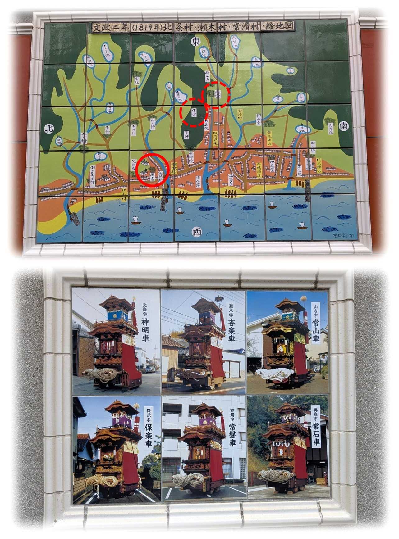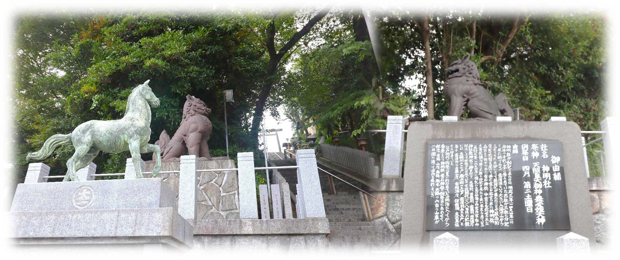 で神明社を見かけ立ち寄ってみました。 ![]() 鎮座地は宝全寺から北に延びる常滑街道沿いにあたり、常滑の街を見下ろす高台に神明社の杜が息づいている。 ![]() 神明社社頭。 右に社標、左に手水舎があり、高台に続く石段の前に神明鳥居を構えている。 ![]() 石造の一ノ鳥居。 両脇には神馬像と陶製の大きな狛犬が参拝客を見届けている。 ![]() 常滑を象徴するこの狛犬は、昭和17年、紀元2600年を記念し奉納されたもので、二人の地元陶彫作家による作品。 角を持つ吽形は柴山清風(1901~1969)氏、阿形は片岡武正(1901~1964)氏の作品で、どちらも子供の背丈ほどの高さの凛々しい姿をしています。 右手の由緒の内容は以下。 『社名 神明社。 祭神 天照皇大御神、豊受姫大神。 例祭日 4月第2日曜日。 由緒 この社は旧郷社で、 神明社が創祀されたのは明応3年(1494)に瀬木の千代の峯に祭られていた古社が三社に分祀された時である。 常滑浦という大きい入海が、山から流れてきた土砂によって陸地化が進んだことや、政治的変化の影響を受けて西之宮とも称せられた神明社、高宮とも称せられた常石神社、中宮とも称せられた大善院鎮守社の三社に分祀されたと云い伝えられている。 元禄7年(1694)の棟札によれば、伊勢の内宮外宮白山神社乾坤宮の神を祀り、北條村、世儀村、市場村、同所浦方保示によって修復がなされている。 文政時代(1818)の記録には、北條村207戸、瀬木村134戸、常滑村533戸とあり、常滑村は市場山方、市場浦方、保爾浦露、支邑奥條とに分かれていた。 江戸時代の例祭は夏に行われていたが明治に入ってから春祭となり、神明社、常石神社の例祭日にあわせて保示、市場、山方、奥條、瀬木、北條の六台の山車が二日間に渡って市内を巡行している。』 地史は見ていませんが、愛知県神社名鑑から由緒で割愛されている部分を下に追記しておきます。 『創建は定かではない。 明治五年、村社に列し、同四十年十月、指定社となる。 大正二年、字丸山八七番の山神社を合祀。 昭和二十六年、六等級社に昇格。 昭和三十一年、字八反田二番無格社山神社を合祀。 同六十一年、本殿、幣殿、拝殿を造営した。』 ![]() 社殿に続く石段、そこそこ急で、踊り場も無いので疲れ切った足にはきついものがある。 石段の先に二ノ鳥居も見えているので、あと少しひと踏ん張り。 ![]() ニノ鳥居から境内正面の拝殿の眺め。 木造の神明鳥居は柱と笠木の一部が銅巻きされています。 ![]() 境内右の日輪遥拝所。 神明社にはこうした遥拝所が複数あります。 ![]() 境内右の社務所。 ![]() 神明社社殿全景。 拝殿の左右に境内社が祀られています。 ![]() 拝殿前で守護する狛犬は、昭和4年に寄進されたものでした。 ![]() 拝殿額。 昭和61年に本殿、幣殿、拝殿が造営されたとあるので、その際に新たに作られたものだろうか。 ![]() 拝殿内から幣殿の眺め。 ![]() 境内左手の伊勢神宮遥拝所。 ![]() その右に神武天皇遥拝所。 ![]() その右隣りの金刀比羅社遥拝所。 ![]() 本殿左の脇参道にある手水舎、子供を背に乗せた鯉の龍口がありますが清水は注がれていなかった。 ![]() 手水舎右の境内社四社相殿には恵比須社、香良須社、猿田彦社、多賀社が祀られています。 ![]() 本殿右の境内社。 左から秋葉社・八幡社の相殿、御鍬社・白山社・津島社相殿、金刀比羅社・山神社相殿と整然と祀られています。 本殿は神明造で内削ぎの千木が付き、鰹木は6本と思われます。 ![]() 参拝を終え下界に戻るとします。 ここから階段を下るか、拝殿右から駐車場に出て車道を歩くかの二択。 迷わず後者を選択。 ![]() 上は駐車場脇に掲げられていた文政2年(1819)の北条村・瀬木村・常滑村村絵図。 由緒に記載されている高宮・中宮の位置を破線、西宮の位置を実線で囲ってみました。 現在と比べると、すぐ目の前まで波打ち際が迫っていたことが分かります。 下は由緒に書かれていた六台の山車、何れも大きな山車なのが良く分かる。 さあ、常滑駅に向かおう。 ![]() 登り窯焚口。 所在地 / 常滑市栄町6-208 ![]() でんでん坂。 所在地 / 常滑市栄町4-75 常滑駅に10:00に降りたち、11kmを歩き、再び駅に戻ったのは16:00を過ぎていました。 なかなか距離もあり、それに伴い立ち寄りポイントの多い楽しめるコースでした。 後開催 第八回歩いて巡拝 知多四国 栄町神明社 創建 / 不詳 祭神 / 天照皇大御神、豊受姫大神 境内社 / 恵比須社、香良須社、猿田彦社、多賀社、秋葉社、八幡社、御鍬社、白山社、津島社、金刀比羅社、山神社 氏子域 / 常滑市栄町、飛香台、市場町、奥夏敷、乙田、かじま台、北古千代、北条、鯉江本町、古千代、栄町、椎池、新開町、瀬木町、セントレア、長間、千代ヶ丘、陶郷町、鳥根、仲井、中千代、錦町、西梨木、白山町、原松町、広内、古社、保示町、本町、南古千代、森西町、山方町、斧口、りんくう町、脇田口 祭礼 / 4月第2日曜日 所在地 / 常滑市栄町6-200 宝全寺から神明社 / 宝全寺から来た道を戻り、突き当りを左折、西へ進む。350m、約5