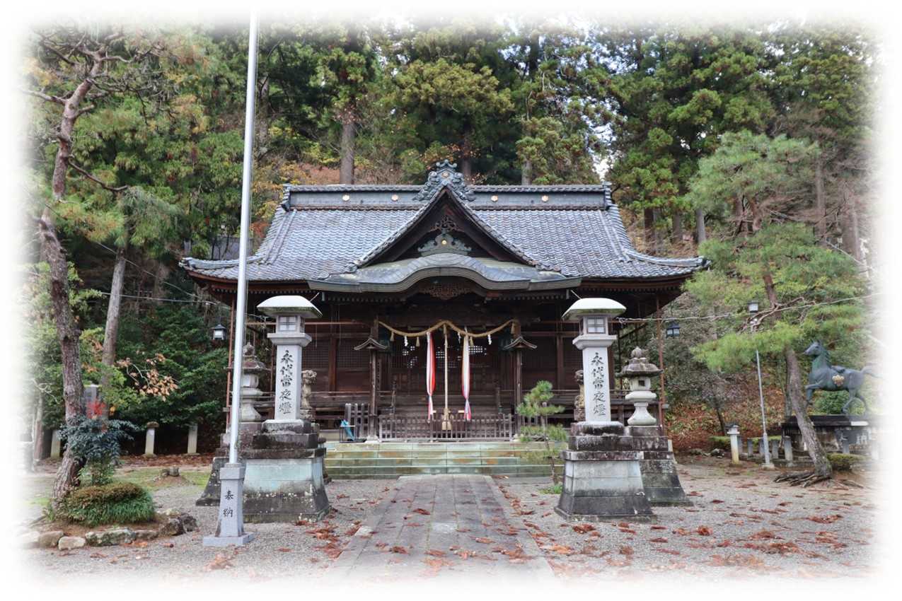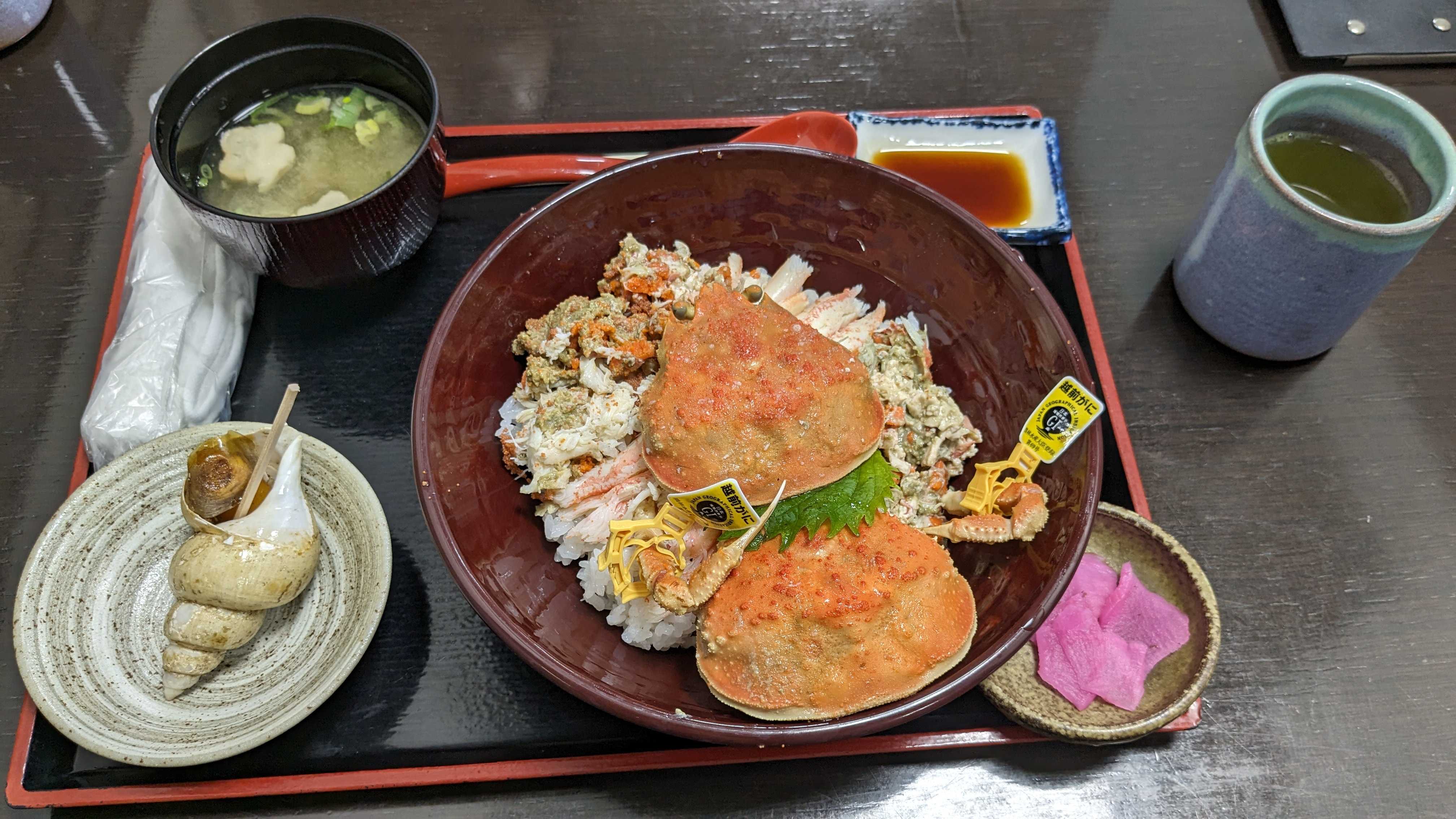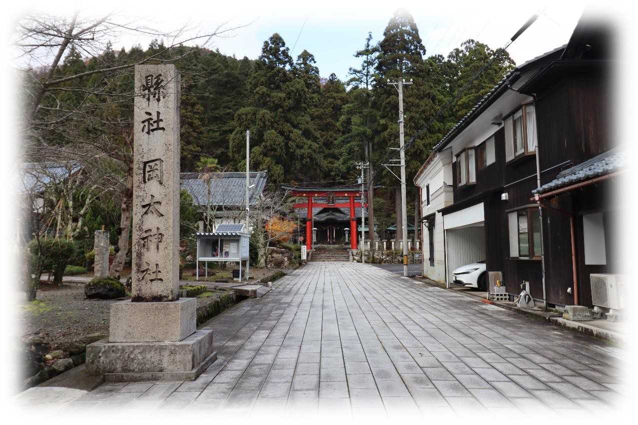 写真は公園に隣接する「紫ゆかりの館」。 2021年に開設されたもので展示ブースや売店がある。 内部展示の一部「紫式部の間」。 紫式部公園内の式部像。 この公園は泉池を取巻く様に作られた寝殿造庭園で1986年に竣工し、紫式部が父・藤原為時とともに越前国府に滞在した史実を記念して整備された。 隣接する「紫ゆかりの館」は、越前市の歴史と紫式部との関わりを紹介する施設として2021年に開館した。 新たに再現された釣殿や紅葉と朱の橋が水面に映る光景は情緒豊かである。 日野川左岸の旧武生市街に平安時代の越前国府が置かれたとされるが、正確な場所は未だ特定されていない。 ボランティアガイドの方の話から、明治2年に「府中」から「武生」と改称されますが、武生の「生」は国府の「府」を用いたかったようですが、時の政府が難色を示し「府」を使うことができず、「生」を当て字として「ふ」と読む事で現在の「たけふ」が誕生したとも聞きます。 これは古代歌謡に「太介不₍たけふ₎の国府」とあることに由来し、古地名「たけふ」を復活させたものであり、地元の方は国府が置かれたことに誇りを持っているようです。 式部像は泉池の先になだらかな稜線を見せる日野山(別称越前富士)に向かい立てられており、越前で過ごした日々のなか、式部はこの光景を愛でたようです。 式部が愛でたという、越前富士の眺め。 紅葉のピークを過ぎた庭園内では、そこまで来ている冬を前に、雪囲いの作業が急ピッチで行われていました。 紫式部公園 所在地 / 福井県越前市東千福町21-12 散策を終え、ここから約一時間程の越前海岸にある「魚屋の喰い処まつ田」でお待ちかねのセイコ丼を食べに向かいます。 12:00、福井市蒲生町の国道305号線、荒々しい表情を見せる日本海の海岸沿いに店を構える「魚屋の喰い処まつ田」到着。 道路側の一階が一般客、地下一階が団体客用の部屋があり、どちらも越廼海水浴場の先の日本海を眺めながら食事ができる。 外観は漁師が営む飲食店の外観、店先では取れたばかりの越前ガニを茹で上げている。 土産用の越前ガニでも、と価格を見るが、簡単に手が出せる価格ではなく、蟹コース一泊ウン十万が頷ける。 少し前は温泉付きのホテルが数万で泊まれたものだが、相場のアップデートができていないようだ。 店舗前のメニュー。 今回頂く「まつだせいこ丼」、子供連れで訪れれば・・・ ツアーで提供された「まつ田せいこ丼」。 セイコガニ(ズワイガニの雌)の漁期は11月・12月の2ヶ月限定、毎年この時期になるとかみさんが騒ぎ出す。 それを二杯使って丼にしたもので、外子の食感と内子のまったり感がカニ身と交わり、ズワイガニより美味しいと感じる向きもある。 蟹と言えば「面倒くさい、無言になりがち」ですが、そんなことがないのがいい。 一年振りに現地で頂くセイコ丼は実に美味しいものがある。 上は2023年「道の駅 越前」内の「お食事処 かねいち」で頂いたセイコ丼(¥5,500)。 2年前で物価も違うが、当時はこの価格でタグ付きの丼が食べられました。 物価の高騰、円安、インバウンド・・・だんだん手が出せないものになっていく気がする。 そうして考えればバスツアーはやはりお得? 海岸から見る店舗外観。 鉛色の雲と海、自分がイメージする日本海になってきた。 魚屋の喰い処まつ田 所在地 / 福井県福井市蒲生町16-7-1 13:00、お腹も満たされ、3つ目の立ち寄りポイント越前市粟田部町にある花筐(かきょう)公園に向かいます。 そちらでもボランティアガイドの方により園内の解説を受けます。 自分は、公園内の西側に鎮座する岡太神社に一度訪れて見たかっただけに、一人列から外れ岡太神社を目指します。 行司山を背にして建つ「縣社 岡太神社」の社号標と参道の眺め。 参道の先の両部鳥居と拝殿。 拝殿全景。 入母屋瓦葺の平入で前後に千鳥破風と、大きな向拝を持つ重厚感のあるもので、継体天皇由来の由緒ある神社。 延喜式神名帳の旧今立郡十四座の中で最も古い社とされる。 祭神は建角身神、大己貴命、国狭槌尊の三柱で、相殿に継体天皇をお祀りします。 当初「岡太の宮」と称し、21代雄略天皇(456~479)以前に鎮座されたものと伝わります。 本殿は拝殿右石段を上った行司山の中腹に鎮座し、周辺には複数の境内社が鎮座します。 岡太神社本殿。 鎮座地の粟田部町は、即位前の継体天皇が暮らしていた言い伝えがあり、花筺公園内に六角形の玉垣に囲まれた「皇子が池」があり、この池で継体天皇の子、安閑・宣化両天皇の産湯に使ったと言われます。 ここから車で10分弱の南東に、滝のように屋根が連なる本殿を持つ岡太神社・大瀧神社の里宮があり、大徳山の奥宮には岡太神社・大瀧神社其々の社殿を持ち、歴史的には大瀧神社より岡太神社が古いとされます。 同じ名前を冠する粟田 岡太神社と岡太神社・大瀧神社の関係性の有無に興味があり、福井県神社庁から調べ始めましたが、リンク先が変わったようで繋がらず、別の資