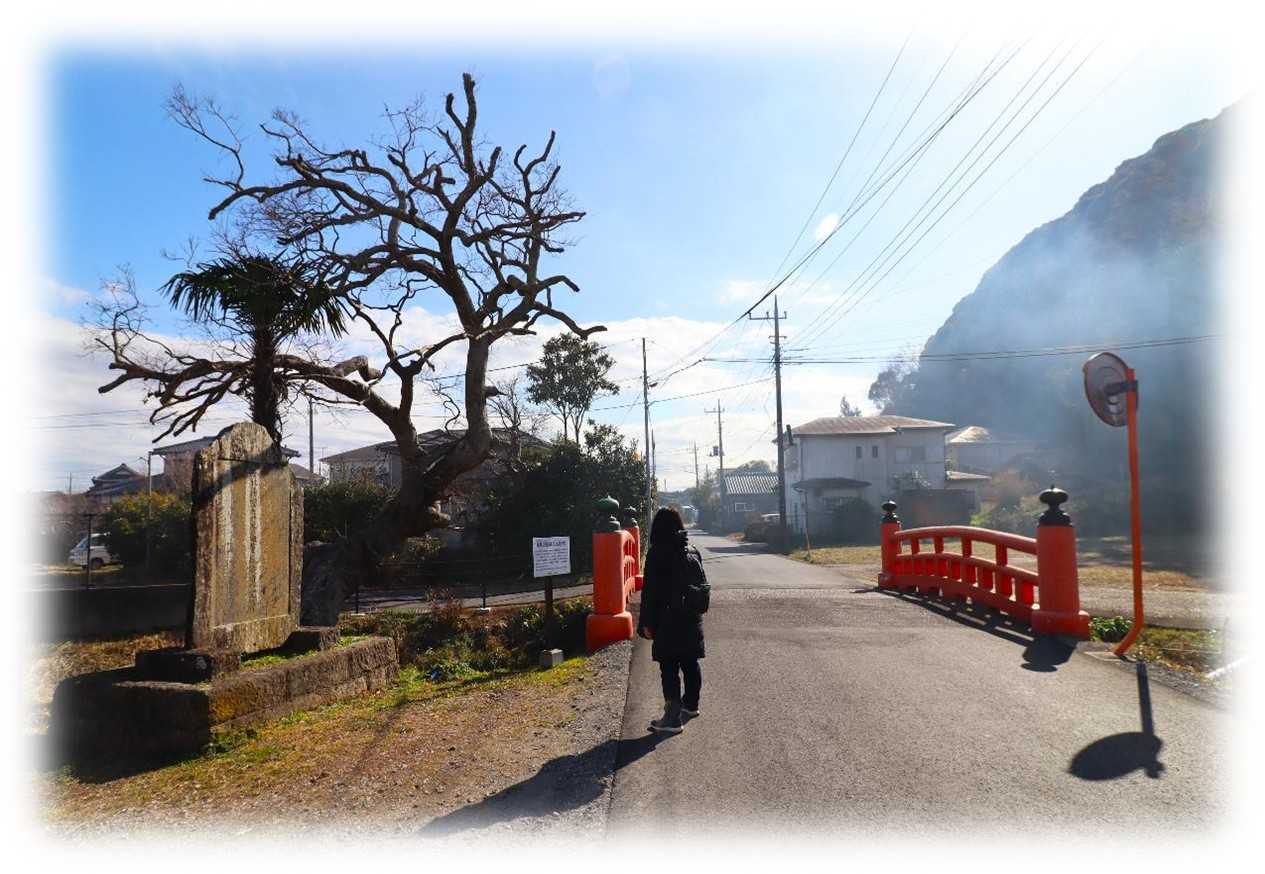 踏切から50mほど先に朱色の神橋と石碑が建てられています。