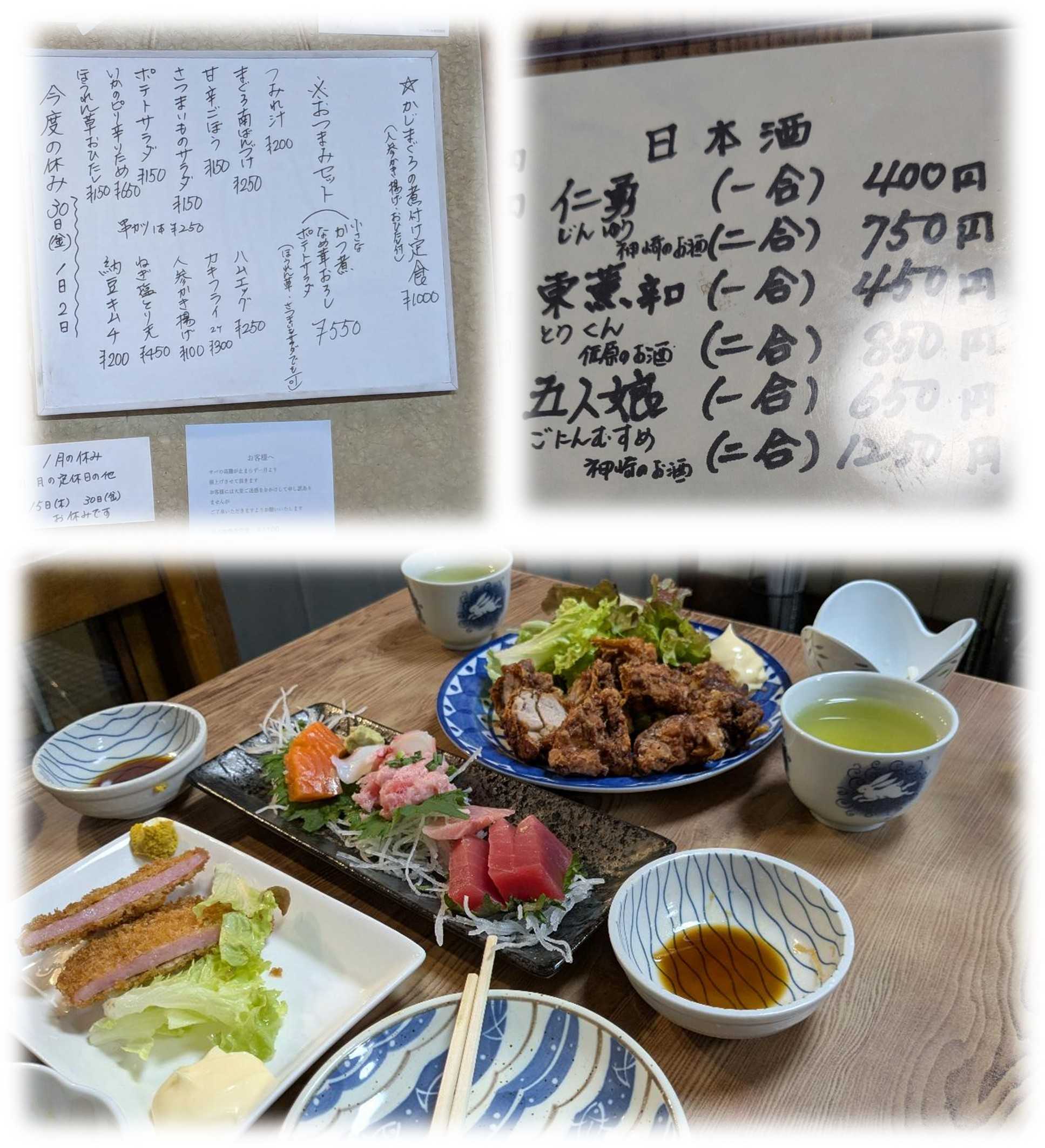 二人でビール二杯と地酒を頼み、学生時代が懐かしいハムカツや家庭の味を思い出す唐揚げの他、刺し盛だのサツマイモサラダや甘辛ごぼうなど食べても4000円でお釣りがきた。