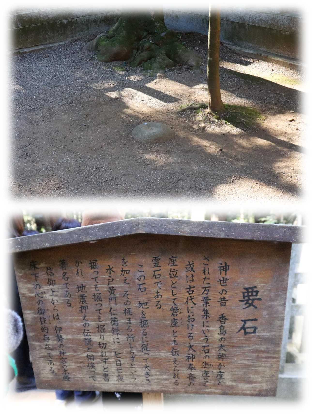 右手の入母屋造の建物が鹿島神宮の拝殿・本殿で、左が社務所になります。 ![]() 拝殿・幣殿・石の間・本殿が連なる社殿は、元和5年(1619)、徳川2代将軍の秀忠公が寄進したもので重要文化財に指定されています。 右側の本殿は檜皮葺の三間社流造で、棟には3本の鰹木と外削ぎの置き千木がのるもので、祭神の武甕槌大神が祀られています。 ![]() 拝殿前から眺めた社殿全景。 鹿島神宮では狛犬を見かけません、幣殿方向にも姿はないようです。 私達の後ろから「これが本殿か」という声が聞こえましたが、楼門の正面に社殿があるものと捉えれば、参道を開けるよう立つ社殿は、印象としては外れていないかもしれない。 ![]() 社殿左の朱塗りの建物は宝庫で、その奥に佇む社は摂社の三笠社で鹿島神宮が鎮座する三笠山の地守の神をお祀りします。 ![]() 上は社務所前に鎮座する摂社の高房社。 武甕槌大神の葦原中国平定に最後まで服従しなかった天香香背男を抑えるのに大きく貢献した建葉槌神をお祀りし、本殿を参拝する前に、まず高房社を参拝するのが習わしとされる。 下は重要文化財の仮殿。 入母屋檜皮葺で向拝が付くもので、元和4年(1618)、社殿造営のため徳川2代将軍秀忠公が奉納したもの。 江戸時代は楼門を入った真正面に鎮座していたが、その後2回の移動で現在の場所に遷された。 『この仮殿は旧本殿を奥宮として遷し、その跡地に新しい社殿を造営するまでの間、神様をお遷していた建物。 現在は摂末社所管社の分霊をお祀りしている。 摂社 奥宮・高房社・三笠社・跡宮・息栖神社・沼尾神社・坂戸神社 末社 須賀社・熊野社・津東西社・祝詞社・稲荷社・潮社・阿津社・熱田社・御厨社・国主社・海边社・鷲社・押手社・年社 所管社 大国社』 ![]() 上は社務所の奥に鎮座する末社の御厨社で御饌津神をお祀りします。 下は御厨社の右鎮座する祖霊社。 終戦後の昭和22年、成蹊学園内の鹿島神社の社殿を移築したもので、氏子中の戦没者・祖霊をお祀りします。現在改修工事中でした。 ![]() 再び本殿前に戻り、左手に続く参道を進み奥宮や要石に向かいます。 ![]() 社叢の中、綺麗に掃き整えられた奥宮に続く参道。 人工物は一切なく、午前中の早い時間であれば、時代劇に迷い込んだかのような光景が続きます。 事実、映画のロケ地として実績があるようです。 ![]() 奥宮に向かう参道の右側に祀られている末社 熱田社(素盞嗚尊・稲田姫命)。 明治以前は七夕社と呼ばれていた社で、須賀社と同じ素盞嗚尊が祀られている。 ![]() 10:45奥宮に到着。 この時間だとまだ参拝者の列がありませんが、昼をも近づくと参拝待ちの列ができていました。 檜皮葺の流造の社殿の大棟には、金色の巴紋や桐紋が光り輝いています。 ![]() 摂社 奥宮(武甕槌大神の荒魂)。 現在の社殿は、慶長10年(1605)に徳川家康が関ヶ原戦勝の御礼に現在の本殿の位置に本宮として奉納されたもの。 後の元和五年(1619)、2代将軍 徳川秀忠により現在の本宮を建てるにあたり、旧本宮はこの位置に遷され、奥宮とされた。 ![]() 10:45要石に到着。 香取神宮同様要石が地震を起こす鯰の頭を抑えていると伝えられている。 ![]() かつて徳川光国が要石はどこまで深く埋まっているか、その根源を見極めるため、人夫をかけて掘り返そうとしたいう記述が水戸黄門仁徳録(1888)の「西山公鹿島の要石を堀給ふ事並霊夢の事」として残されている。 『一日がかりで二町ほど掘り返したが日暮れとなり「今日はこれにて、また早朝より堀べー」と翌日再び要石に戻ると、何事もなかったかのように元に戻っていたという。 それから百姓・町人も動員し昼夜問わず掘り進めたが根源まで辿り着くどころか、疲労困憊休息を入れると再び元に戻ってしまい、掘ることを諦めた』と記されています。 一町は約110mなので当時としては一大プロジェクトだったが目的は果たせなかった。 水戸黄門仁徳録は国立国会図書館のwebでも公開されており、読んでみると面白い。 地表に現れている要石は只の石ころにしか見えないが、実は奥深い不思議な力を秘めている。 ![]() 要石の周辺の芭蕉句碑と寛永5年(1628)に寄進された燈籠や銘の読めない古い手水石が置かれている。 ![]() 11:15御手洗池へ。 HPによれば『1日に40万リットル以上の湧水があり、水底が一面見渡せるほど澄みわたった池です。 昔は参拝する前にここで禊をしました。 現在では、年始に200人もの人々が大寒禊を行います。』 毎分280literか、それくらいの勢いはあったかな。 鹿島台地の頂に鎮座しながら、後ろの山肌からこれだけの水が湧き出ることも不思議だ。 ![]() 御手洗池から湧水茶屋一休の眺め。 少し早いが次の目的地までの移動もありこちらで昼食。 ![]() 御手洗池の湧水で仕込まれた蕎麦と三色団子。 ![]() 御手洗池に対面するように末社の大黒社(大国主命)が鎮座します。 明治以降に鎮座された新しい社で、夏越祓の日、西瓜を供えて参拝するのが習わしのようです。 ![]() 12:20、参拝を終え鹿島神宮駅に向か