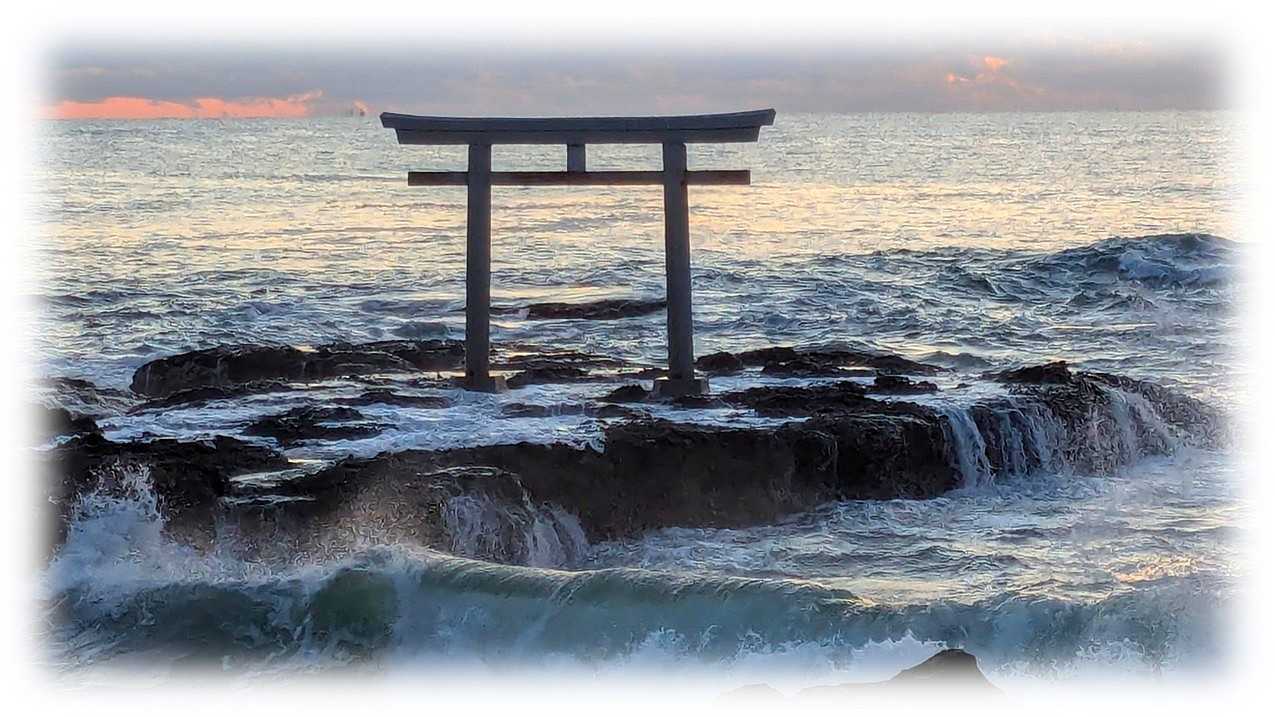 朝焼けに照らされ、大洗磯前神社のニノ鳥居と三ノ鳥居が神々しく輝く。