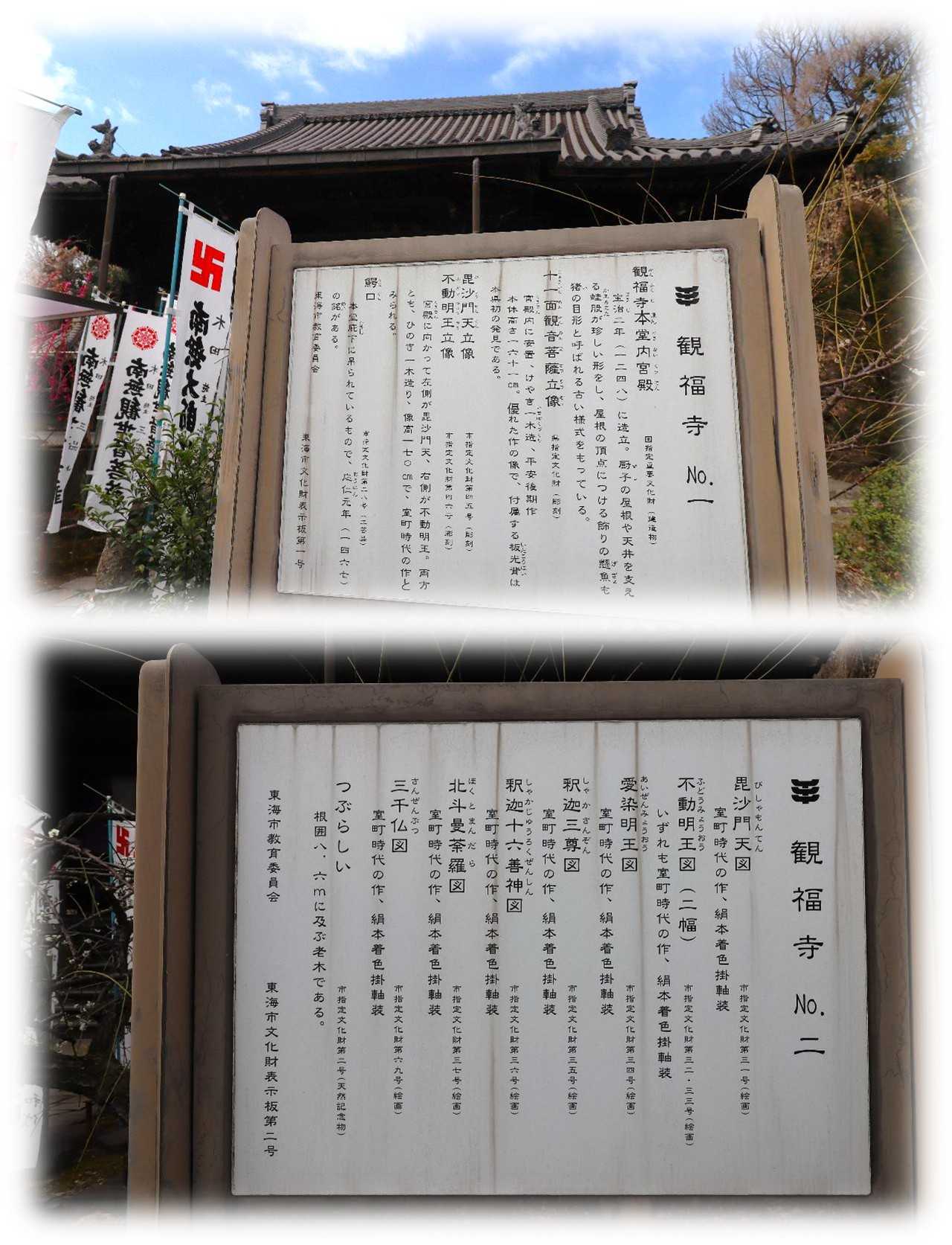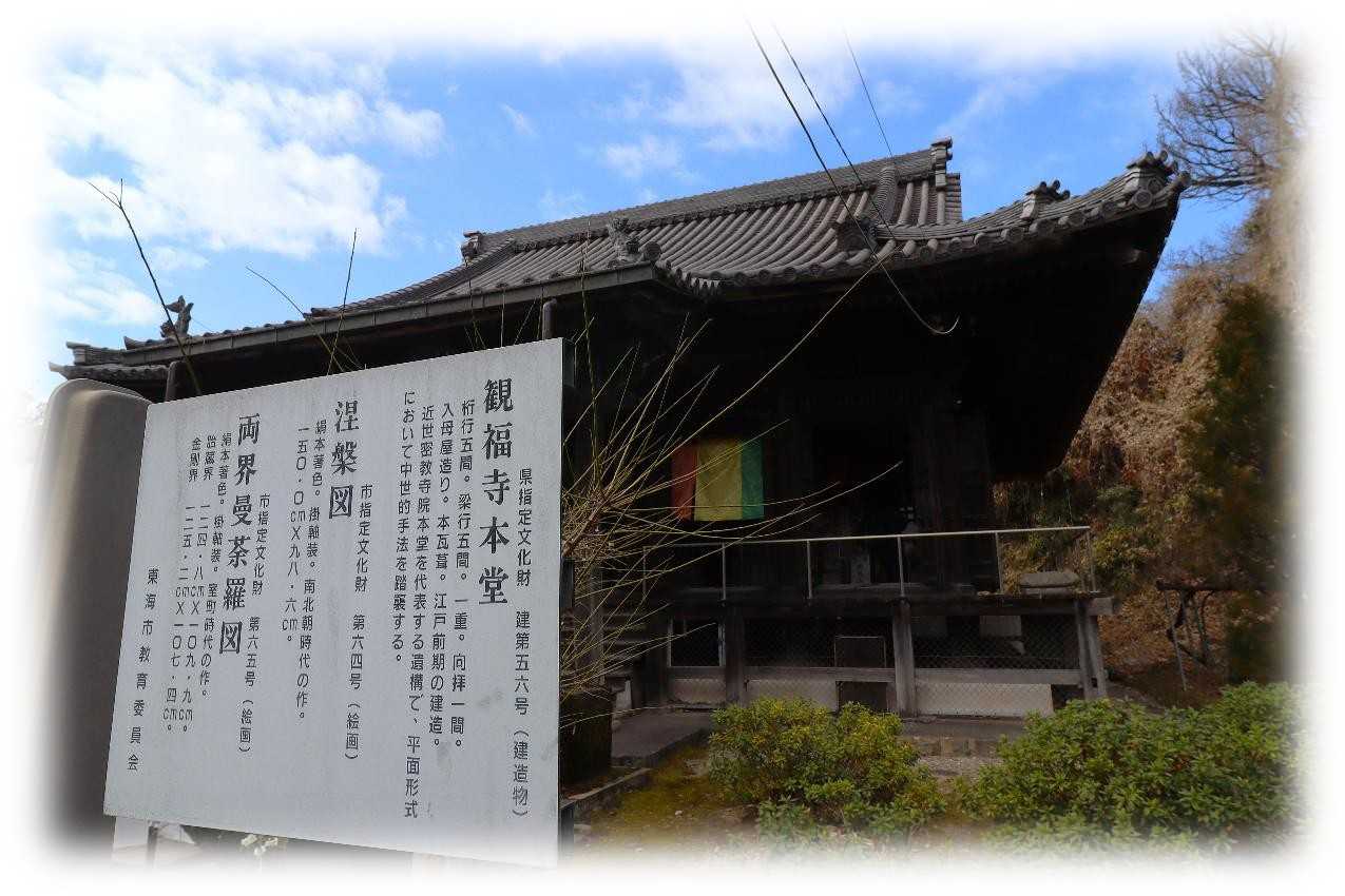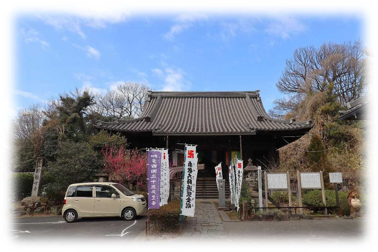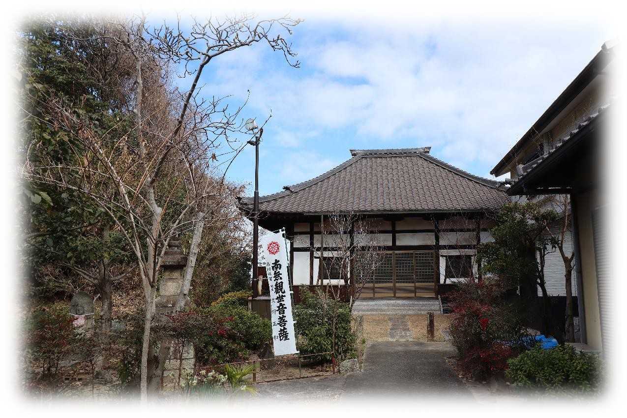 2月17日(火)、後開催で第十ニ回 歩いて巡拝 知多四国を巡ってきました。 ![]() 上が第十ニ回後開催のコースマップ。 スタートは名鉄常滑線太田川駅。 駅前から東に向かい➡82番札所観福寺➡83番札所弥勒寺➡84番札所玄猷寺➡85番札所清水寺➡86番札所観音寺➡名鉄常滑線聚楽園駅をゴールとするもの。 コースは全体に比較的フラットで全長9km、五つの札所を巡拝するもの。 まずは駅から南東へ1.2kmほど先の小高い丘に鎮座する82番札所観福寺を目指す。 ![]() 丘の南側に仁王門を構える八十二番札所・雨尾山観福寺の門前の眺め。 車の場合、この門前の少し左手前の上り坂を進むと本堂前に至ります。 鎮座地の大田町天神下ノ上は、周囲よりわずかに高い標高10m前後の微高地に位置しています。 この高まりは、知多丘陵の裾野が大田川の浸食と堆積によって舌状に残った地形で、古くから洪水に強い安全な場所として人々が集落を営み、寺院が建立される基盤となりました。 ![]() 知多四国の札所の中でも、観福寺はとくに立派な仁王門を備えている寺院として知られています。 以下は『東海市史 通史編』(1990)をもとに加筆した由緒の概要です。 雨尾山観福寺は、大宝二年(701)に行基が知多三山(南知多の岩屋寺・常滑の高讃寺)を開いた際の一山と伝えられており、この地方の古刹とされています。 開山後しばらくは荒廃していたようですが、宝徳二年(1450)に慶山によって再興され、十二坊を備える大伽藍が整えられたと伝わっています。 その後、慶長年間(1596〜1615)に火災に遭いましたが、慶安年間(1648〜1652)に再建され、寛文五年(1665)には尾張藩主・徳川光友の寄進により現在の本堂が再建されたとされています。 仁王門は、棟札によると延宝二年(1674)の建立とされ、入母屋造・本瓦葺きの堂々とした門です。 金剛力士像の前後には金剛柵が設けられ、上部を竹格子で囲む構造になっており、寺の格式を示すものと考えられます。 本堂内陣には、国・県指定文化財の厨子と須弥壇が安置されています。 厨子は鎌倉時代の手法を伝える柱間一間四方の入母屋造とされ、本尊の十一面観世音菩薩立像は藤原期の作と伝えられています。 脇侍の毘沙門天立像・不動明王立像は市指定文化財で、十七年に一度御開帳が行われます。 このほか、両界曼荼羅、涅槃図、三千仏図など十四点が文化財に指定されています。 昭和三十四年の伊勢湾台風では中門が倒壊し、客殿・本堂・庫裡にも大きな被害が出ましたが、昭和四十年に現在の姿へと復旧したとされています。 ![]() 仁王門前には、文化六年(1809)亮山阿闍梨が知多四国開創の記念にお手植えされたとされる紅白の椿があり、その後共に桧の芽が出てくるという奇跡が起こり、現在も枝を広げています。 ![]() 仁王門の両の間に安置されている金剛力士像。 作者や年代は定かではないが、凛々しさのなかに力強さが漂う均整の取れた像で、門が延宝二年(1674)ということから、その時代のものだろうか。 ![]() 仁王門から緩やかに上る参道は、両脇に生垣が続き正面の本堂に至ります。 本堂は入母屋瓦葺で桁行・梁行共に五間のもので正面に一間向拝が付くもの。 ![]() 八十二番札所 雨尾山 観福寺本堂脇の文化財解説。 ![]() 本堂は江戸前期に建造されたもので、県の文化財に指定されており、多くの文化財を所蔵している。 ![]() 本堂外陣入口の眺め、額は・・・観音堂と読めばいいのかな。 ![]() 外陣と内陣は格子戸で仕切られ、外陣天井には多くの奉納額が掛けられています。 内陣は良く見通せませんが外陣に木札が掛かっており、中央に本尊の十一面観音、脇侍の右が不動明王、左が毘沙門天、本尊右に六観音、一番右に弘法大師、本尊の左に六地蔵、その左に行基菩薩が安置されているようです。 ![]() 薄暗い内陣中央の一枚、ピントも甘いがお前立の十一面観音像らしき姿が現れました。 17年に一度の御開帳、前回がいつだったか調べがつかず、次回御開帳は問い合わせるのが一番確かかもしれない。 ![]() 軒先が優雅に広がる本堂の眺め。 ![]() 本堂右側のこの建物は、幟からすると観音堂と思われます。 ![]() 手水舎。 ![]() 本堂左側に三十三観音と方形の堂。 ![]() 内部には中央に愛染明王、左右には像はコントラストを変えると火炎光背が見えるので不動明王だろう。 ![]() ぼたいしん おこりてきたの かんふくじ にせのあんらく このほかになし (菩提心 起りて木田の観福寺 二世の安楽 この外になし) 第十ニ回後開催 歩いて巡拝 知多四国 八十二番札所 雨尾山 観福寺 宗派 / 天台宗 本尊 / 十一面観世音菩薩 創建 / 大宝二(702) 開基 / 行基菩薩 札所 / 知多四国霊場82番札所、知多西国三十三所霊場21番札所 所在地 / 東海市大田町天神下ノ上5 参拝日 / 2026/02/17 太田川駅から観福寺 / 名鉄常滑線太田川駅から南東へ1.2km、徒歩20分ほど。 関連記事 お気に入りの記事を「いいね!」で応援しよう