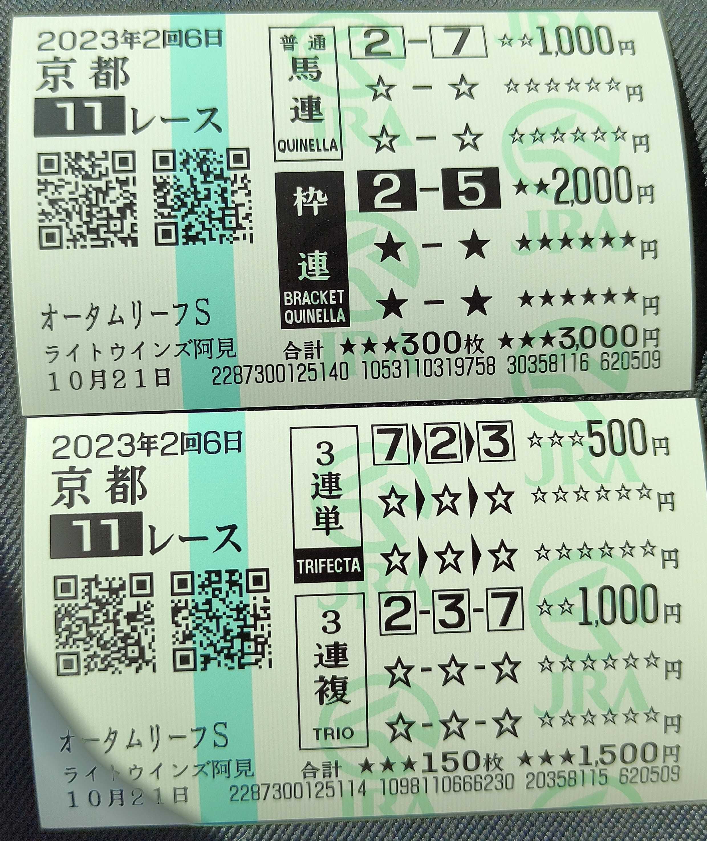 阪神はこのまま広島に勝つでしょうね そんなタイガース、いましたよ。 タイガーではなくて、正真正銘のタイガース ![]() 5枠7番 そして今回 ![]() 5枠7番がありました。 対抗は黒の2番かな。 しかもこの2番が、岡田監督の背番号80番目の馬。 黄色と黒は勇気のしるし、虎カラー タイガース馬券は菊花賞ではなくて、土曜日関西メインで出そうですね。 3着には虎の舌の赤。3番を指名します ![]() 《結果》 ![]() 問題外(泣) お気に入りの記事を「いいね!」で応援しよう