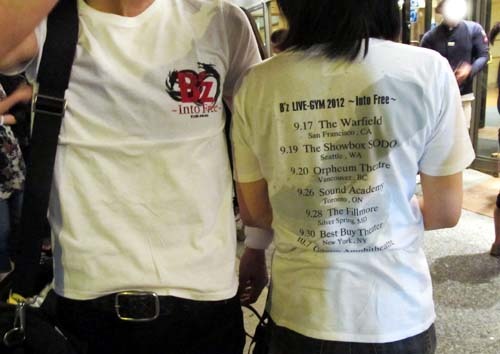 B'z LIVE-GYM 2012 -Into Free- ニューヨークライブレポート衣装、MCです。ライブの構成自体はシルバースプリングと全く同じでしたが、ライブが始まる前のアナウンスが他の会場とはちょっと違いました。その前に、先週ご紹介した、ベスト・バイ・シアターの看板の映像について。Best Buy Theater看板 B'z映像 (日程入り)Best Buy Theater看板 B'z映像これはライブ前日に流れていたもので10秒ちょっとですが、ライブ当日の夕方から、1分近くあるB'zの映像が流れはじめました。素材は同じ 「GO FOR IT, BABY -キオクの山脈-」 のミュージックビデオなので映像そのものは変わらないんですが、長くて、「SOLD OUT」 したことを強調した映像が、開場までの間、頻繁に流れたんです。ただ、そのとき私はもう、カメラも携帯も部屋に置いてきてしまった後だったので、撮影できませんでした。ものすごく多くの方が撮っていたので、どなたか動画をアップしてくれているかもしれません。気になる方は探してみてください。また、開場直前にはスタッフの撮影担当の方が動画で撮っていたので、いつか、オフィシャルの映像として観られるかもしれません。それではネタバレです。 ―――――▼ この先ネタバレ ▼―――――《衣装》松本さん変化なしです。稲葉さん本編ベースが赤で、白、黒などが入っているチェックのシャツ (腕まくり)あとは他の会場と同じです。シャツは、トロントと同じものかもしれません。「ねがい」 の途中からフロントにプリントが入った白Tシャツシルバースプリングと同じTシャツです。アンコールツアーグッズのボーダーTシャツ《MCを含めた全体の流れ》ニューヨークのMCも英語中心で、構成は、本編最後のアメリカ国家がなかったこと以外はシルバースプリングと同じです。開演前のアナウンスですが、男性の声で英語で、「B'z LIVE-GYM 2012 -Into Free- にようこそ!」 と言った後、会場内での録音・録画機器の使用は禁止であることの説明と、電源をすぐ切るようにという注意があったあと、「では、ライブを楽しんでください」 という言葉で終わります。これは各会場同じですが、ニューヨークだけ日本語で女性の声で、「録音・撮影は禁止されています。 万一、それらの行為が発覚した場合は、退場される場合もあります」 といった内容のアナウンスがありました。私は、「退場させられる」 の言い間違いかなーと思いながら聞いていました。名前の付いていない青字部分は稲葉さんの発言です。01. Love Bomb02. GO FOR IT, BABY -キオクの山脈-英語で何があったんだ、ニューヨーク! (大歓声)日本語でB'zのLIVE-GYMにようこそーー! (大歓声)03. Ultra Soul04. Splash05. Brighter Day稲葉さんがアコースティックギターを持つと、メンバー全員でのセッション開始。そして、他のメンバーのセッションが続くなか稲葉さんがマイクに向かい、一語一語を区切るようなゆっくりとした英語で初めての、ニューヨークでの、ライブです。 (歓声)ものすごく興奮してます。 皆さんは? (大歓声)ここから日本語でじゃあ、知ってる曲があったら歌ってちょうだい。 (歓声)NA NA NA NA~NA…06. Easy Come, Easy Go!稲葉さんがギターを置いたり汗をふいたりしている間、松本さんと増田さんのセッション07. MOTEL08. もう一度キスしたかったエンディングで 「恋はみずいろ」TAKと僕の2人で、25年近くやってきました。ニューヨークには1989年にレコーディングと撮影で初めて来て、それからも何度か来てますけど、ようやくライブができます! (歓声)路上で撮影しましたよ。 自転車乗ったりして(笑) (笑い)稲葉さん、この後、英語と日本語が混ざってしまいました。ナインティーン・ナインティ……、トウェンティ・スリー・イヤーズですよ! (笑い)23年!(笑) (歓声)レコーディングもいい!ビデオ撮影もいい!写真を撮るのもいい!(笑) (笑い)でもやっぱり、こうやってステージで演奏できることが、僕たちにとってはベストです。 (大歓声)今日は来てくれて本当にありがとうございます。じゃあ、ちょっと威勢よくいきましょうか。 (歓声)09. ZERO10. ミエナイチカラ ~INVISIBLE ONE~ここで、メンバーを紹介します。 (歓声)On guitar, Tak Matsumoto~! (大歓声)松本さん (日本語で) こんばんはー、ニューヨーク!お客さん、日本語だったのでちょっととどいながらも(こんばんはー!) (笑い)この後は英語で松本さん 楽しんでますか? (歓声)僕も楽しいです。今日は来てくれてありがとう。 エンジョイしていってください。 (大歓声)その後、シェーン、大賀さん、バリー、増田さんの順に紹介。11. ねがい松本さん、間奏のギターソロで速弾きを披露。その松本さんを、もう一度、「On guitar, Tak Matsumoto~!」 と紹介して、稲葉さん、ステージ下手に退場。松本さん、バリーをメインとしたメンバーセッション。稲葉さん、着替えて再登場し、「どこでも行ける きっと行ける」 から歌を再開。12. Into Free -Dangan-ラストの部分で、軽くオーディエンスに声を出させる。13. Juice間奏でいまがどんな時か分かってるか!!? (歓声)叫