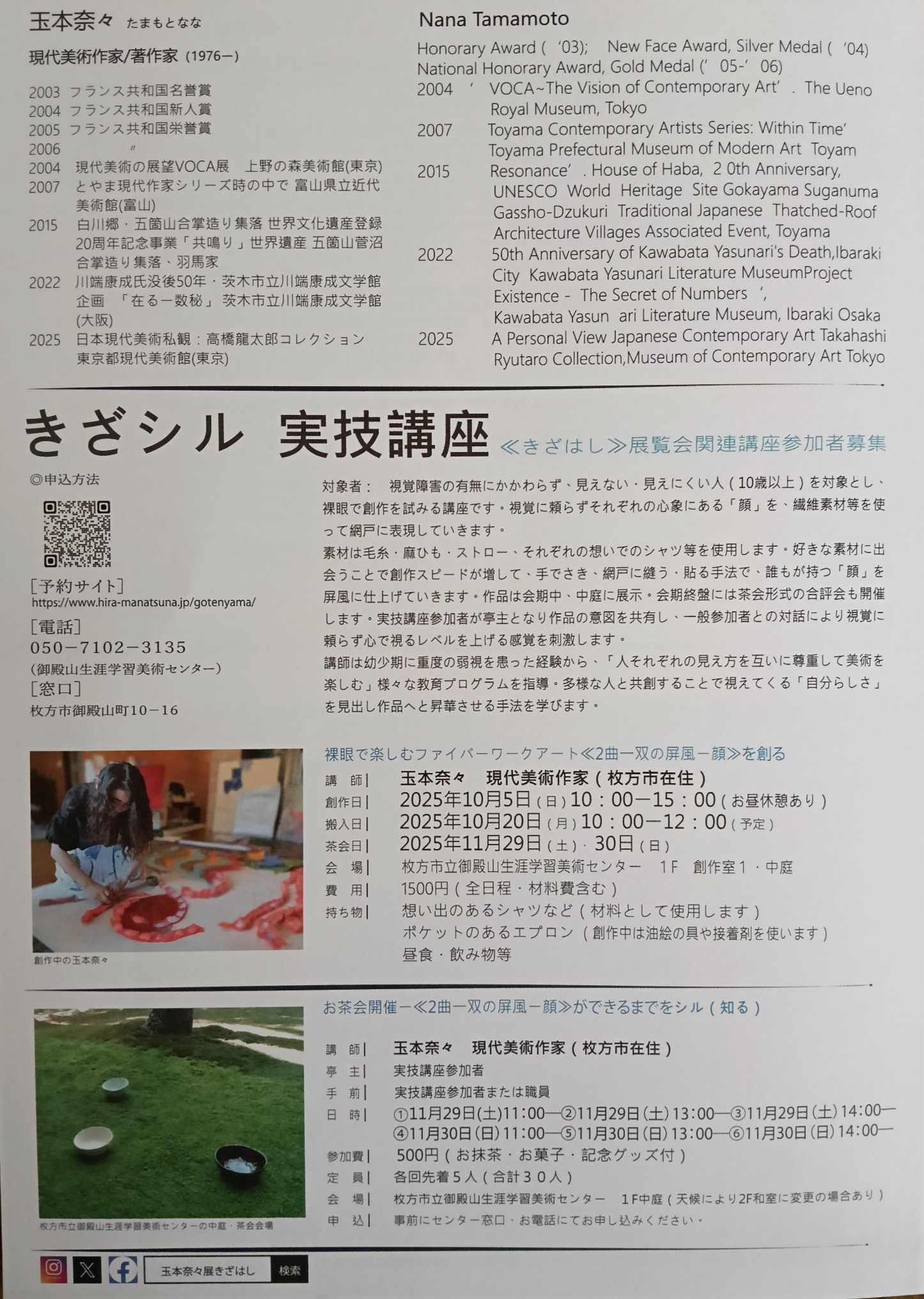玉本奈々は、繊維造形物によるレリーフ状絵画と立体、インスタレーションで知られる気鋭の現代美術家/著者。ミシン糸が縫い込まれ、古木の樹皮か珊瑚のような質感のオブジェと化した布等塊と、飛沫状の着彩、樹脂による凸状波紋など、豊穣な物質的マチエールが特徴。近年では、色彩評価が高まる。ワークショップを随時開催。 《企画事業ならびに作品に関するお問い合わせ》 エヌティエム.イント ntm.int7@gmail.com