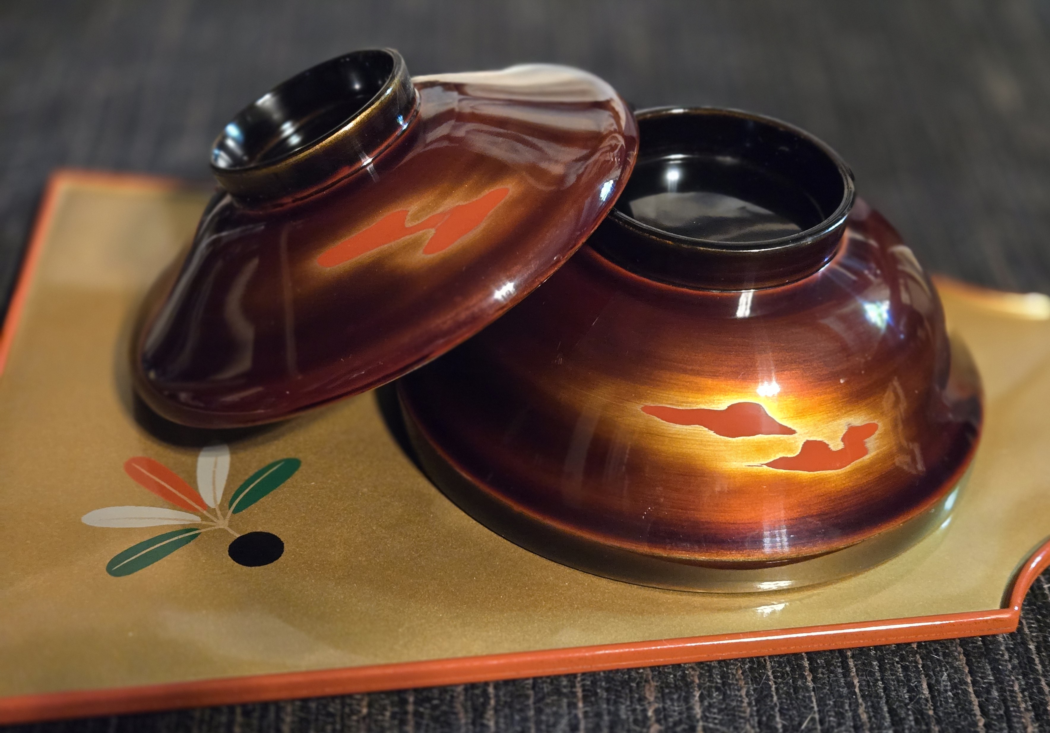 年末、実家の食器を整理してもう使わないものはキッチンde給食 に送りました。その時、開けていなかった箱をいくつか確認すると母が購入したままの漆器が色々出てきて・・・その中で、一目見て美しさに息を呑み自分で使いたくなったのが「曙」という銘の汁椀。照明をきちんとすればもっと綺麗に撮れると思いますが研出という手法が使われ枕草子の「春はあけぼの」の一節を思い起こさせます。箱には「栃材 曙研出漆櫻駒汁椀」と書かれています。昭和47年6月購入。壱万円した模様・・当時としては結構なお値段だったはず。私までが使わないでいたらこの器、ただの場所塞ぎになっちゃいます。というわけで、お正月に使うことに決めました。使わないままは、もったいない。自分でも買ったまま使えずにいるお気に入りがあるので今年はどんどん使うことにします。にほんブログ村にほんブログ村