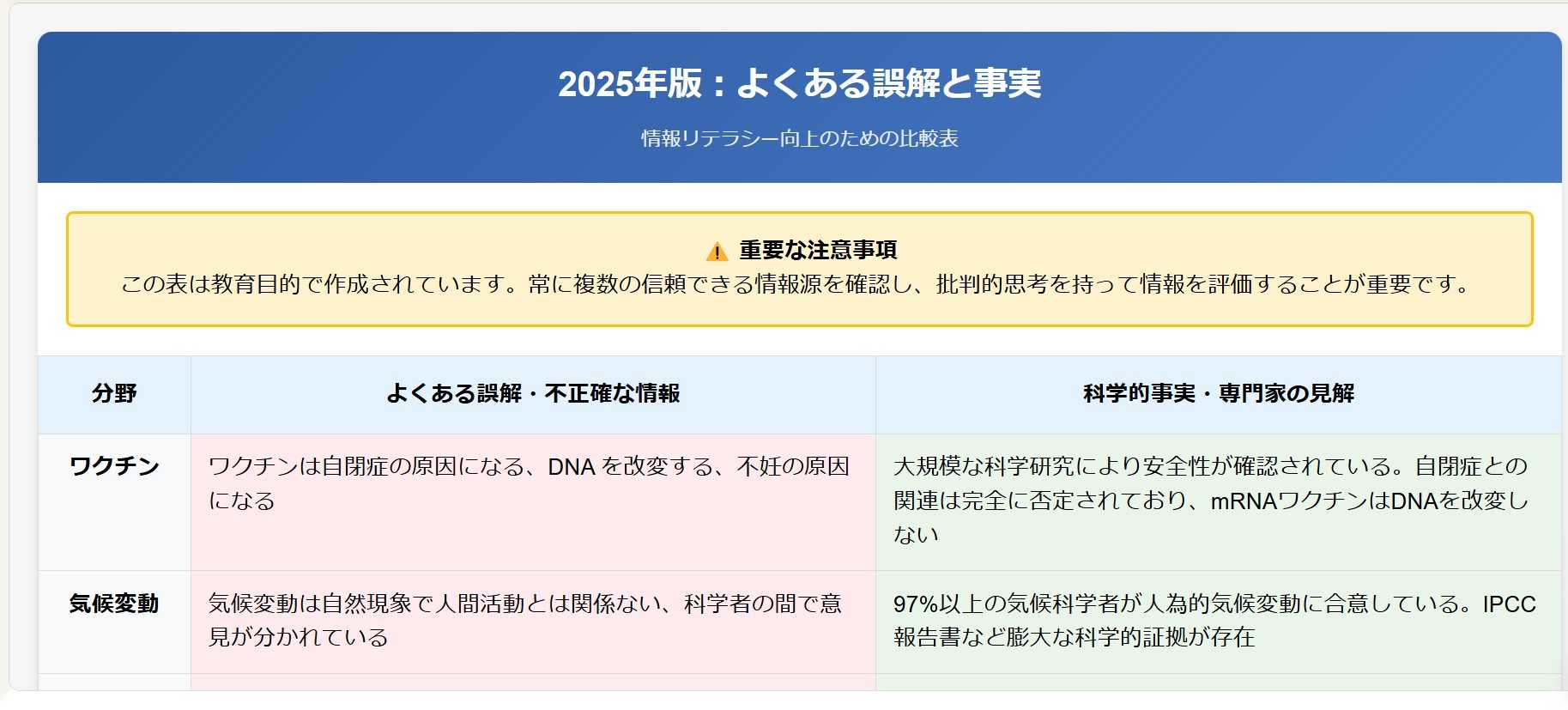 現在の情報をもとに、誤解と事実を対比した表を作成します。ただし、これは教育目的で、批判的思考と情報リテラシーを促進するためのものです。2025年現在の情報をもとに、よくある誤解や不正確な情報と、科学的事実や専門家の見解を対比した表を作成しました。この表の特徴:1. **現代的なトピック**: 5G、AI、ワクチン、気候変動など、現在特に議論されている分野を含めました2. **科学的根拠重視**: 専門家の研究や科学的証拠に基づいた情報を「事実」として記載しています3. **教育目的**: 単純に「嘘」と「真実」を決めつけるのではなく、情報リテラシーの向上を目的としています4. **批判的思考の促進**: 表の下部に情報評価の方法を記載し、読者自身が情報を検証することの重要性を強調しましたこの表は、複数の信頼できる情報源を確認し、偽情報を見抜くための参考資料として活用できます。ただし、常に新しい情報や研究結果をチェックし、批判的思考を持って情報を評価することが重要です。