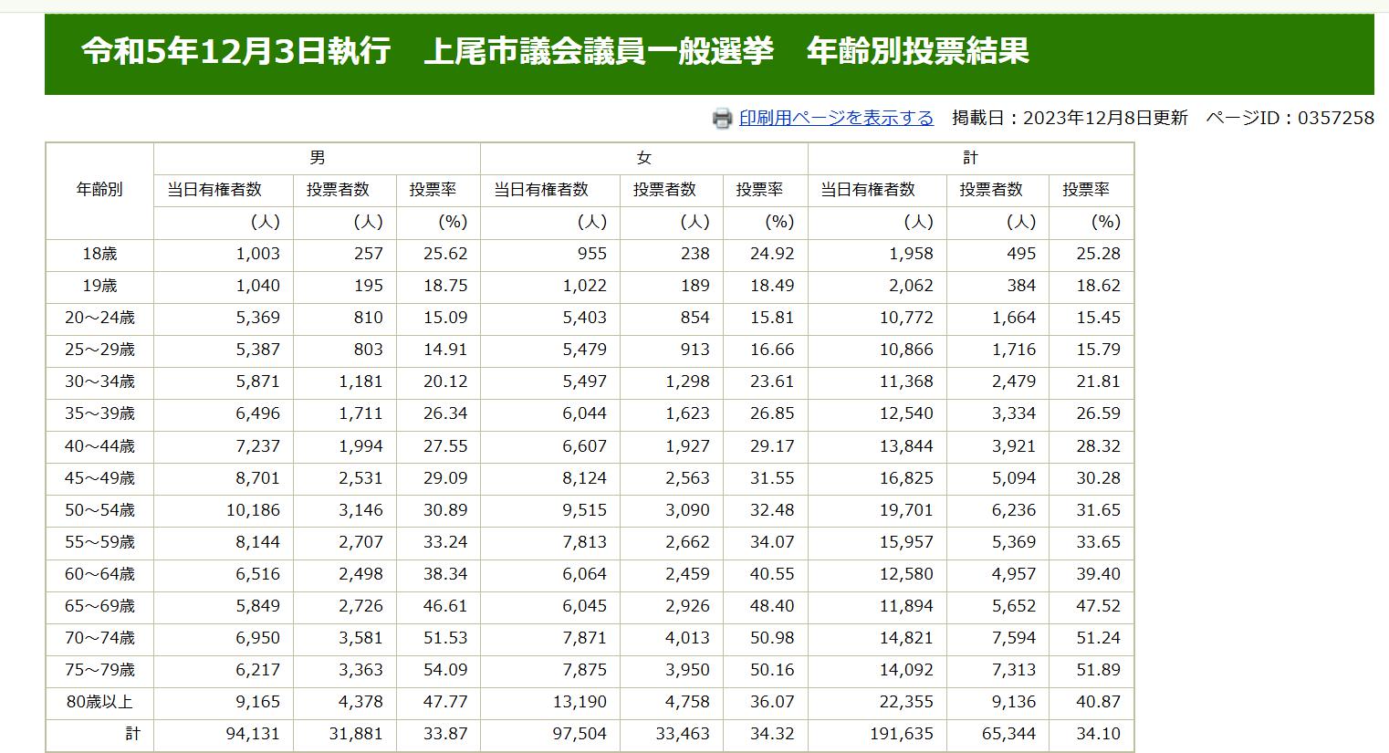令和5年12月3日執行 上尾市議会議員一般選挙 開票結果(得票順)