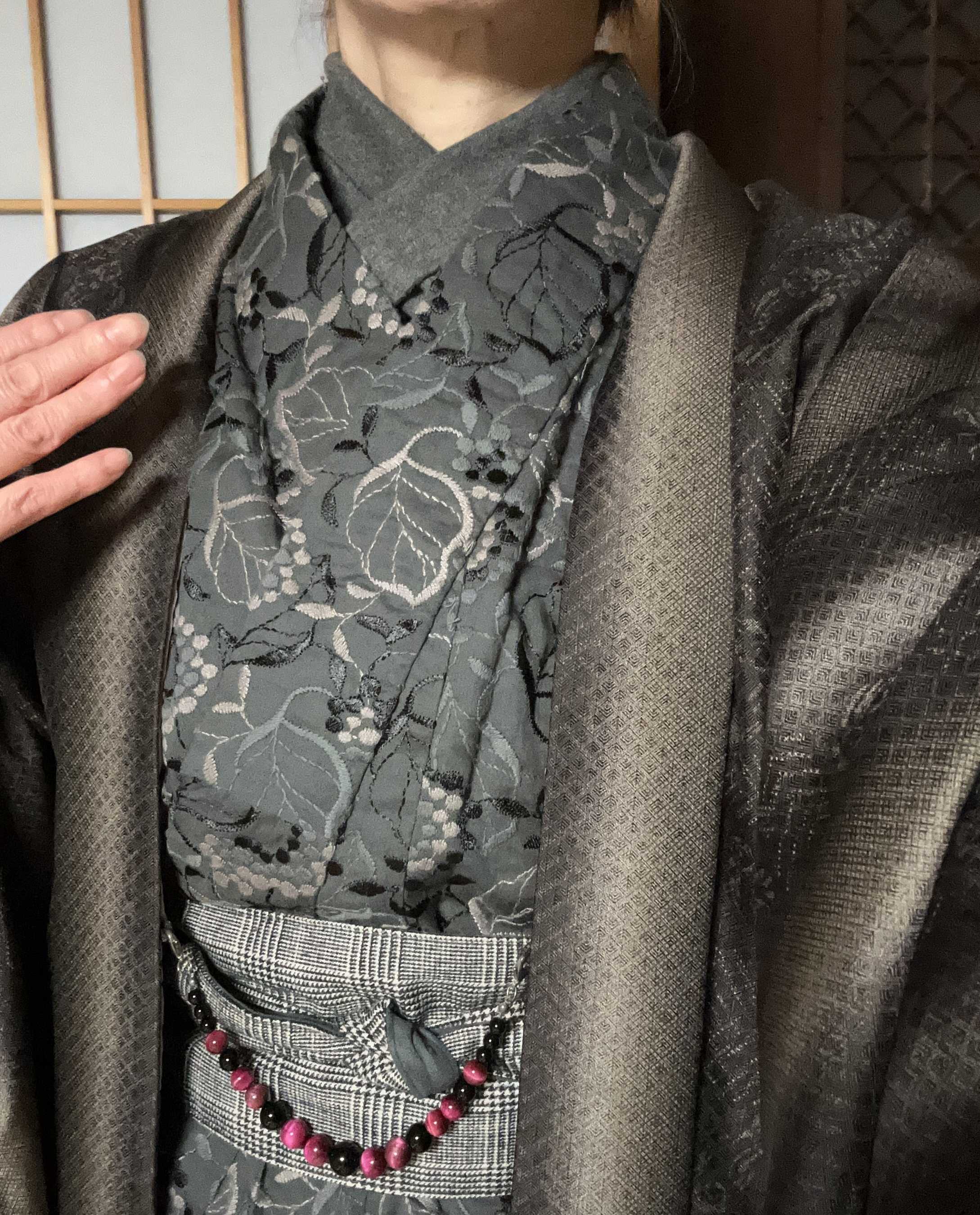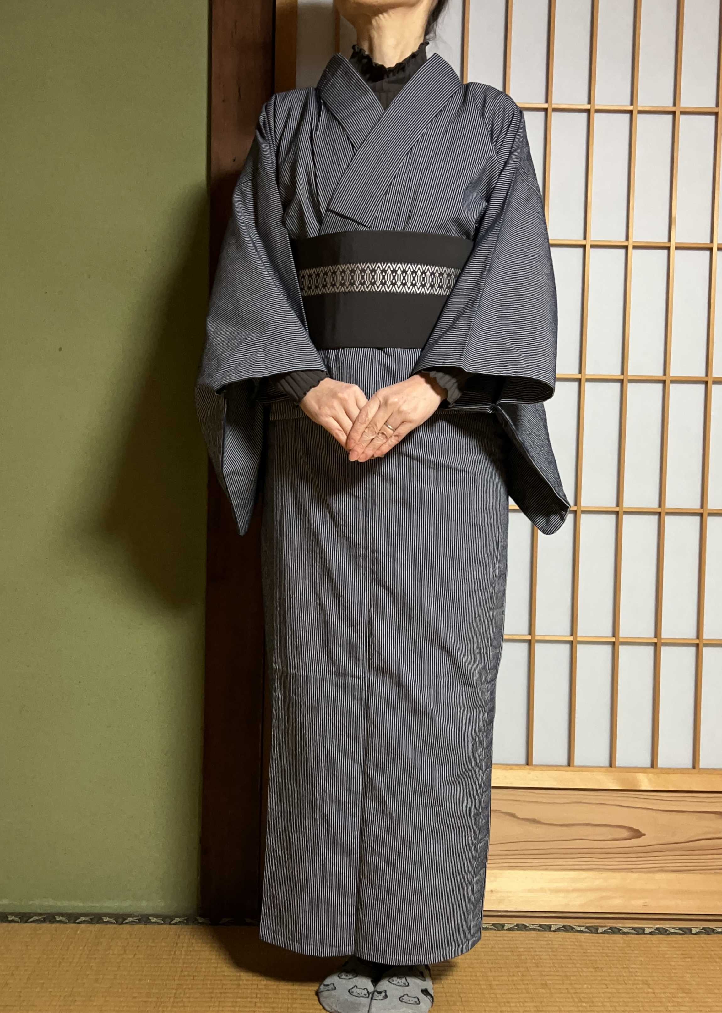 懐かしい藍グレー縞木綿着物を着ました