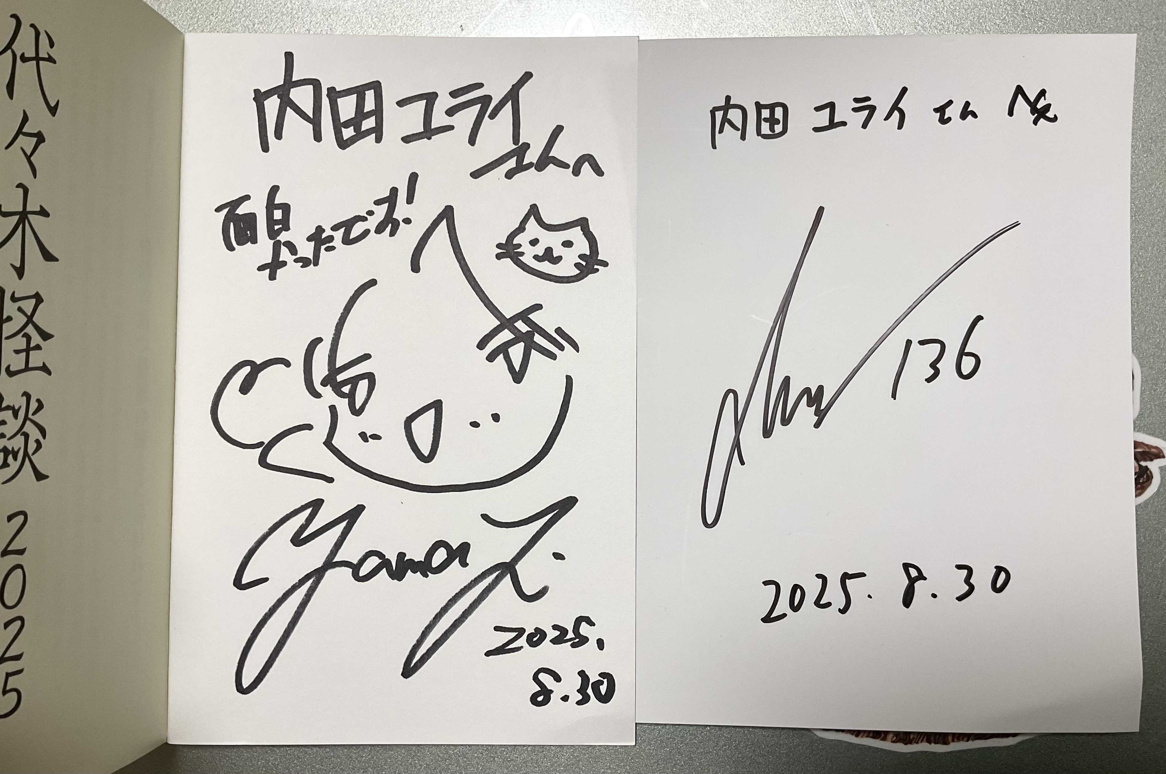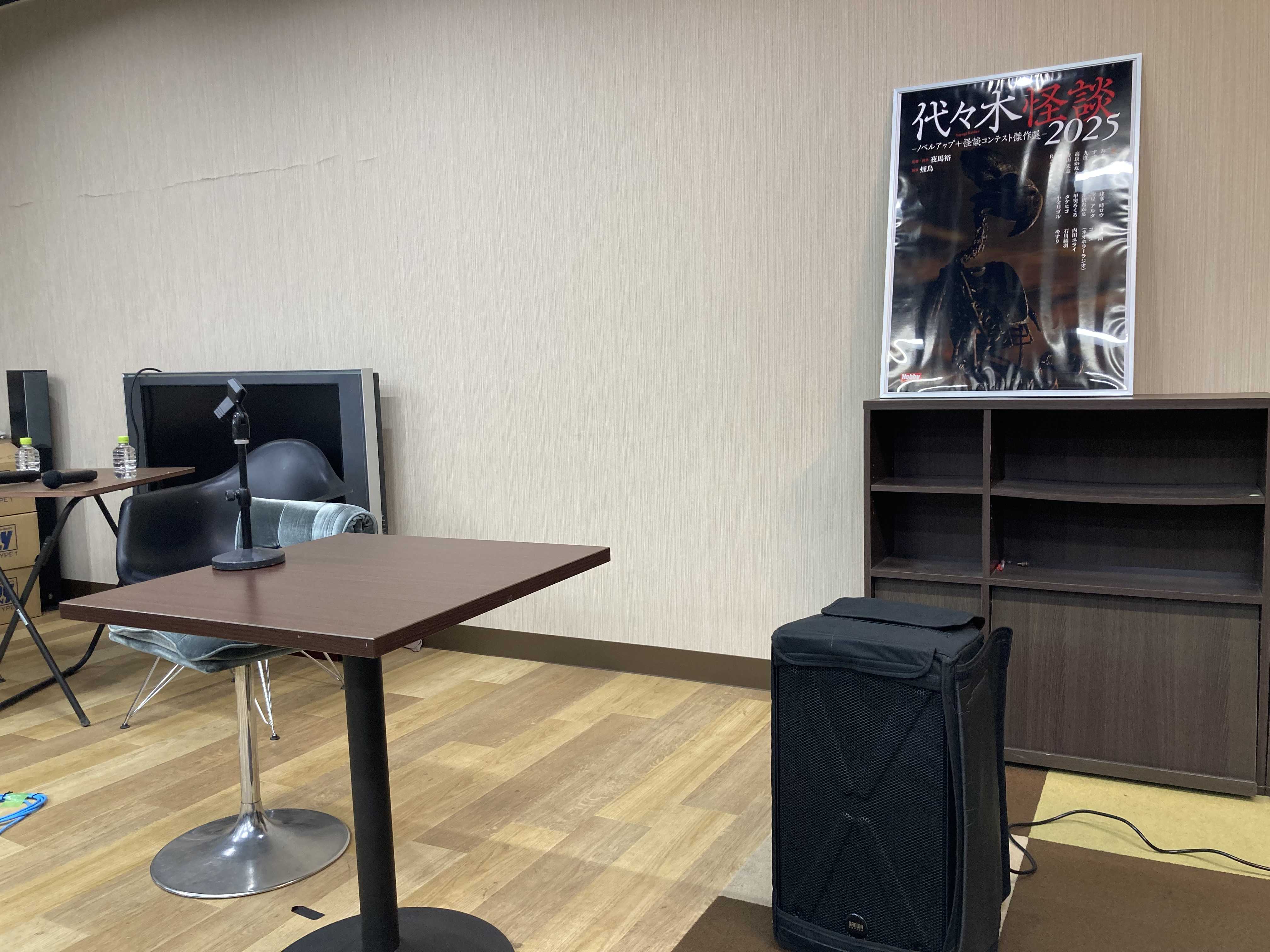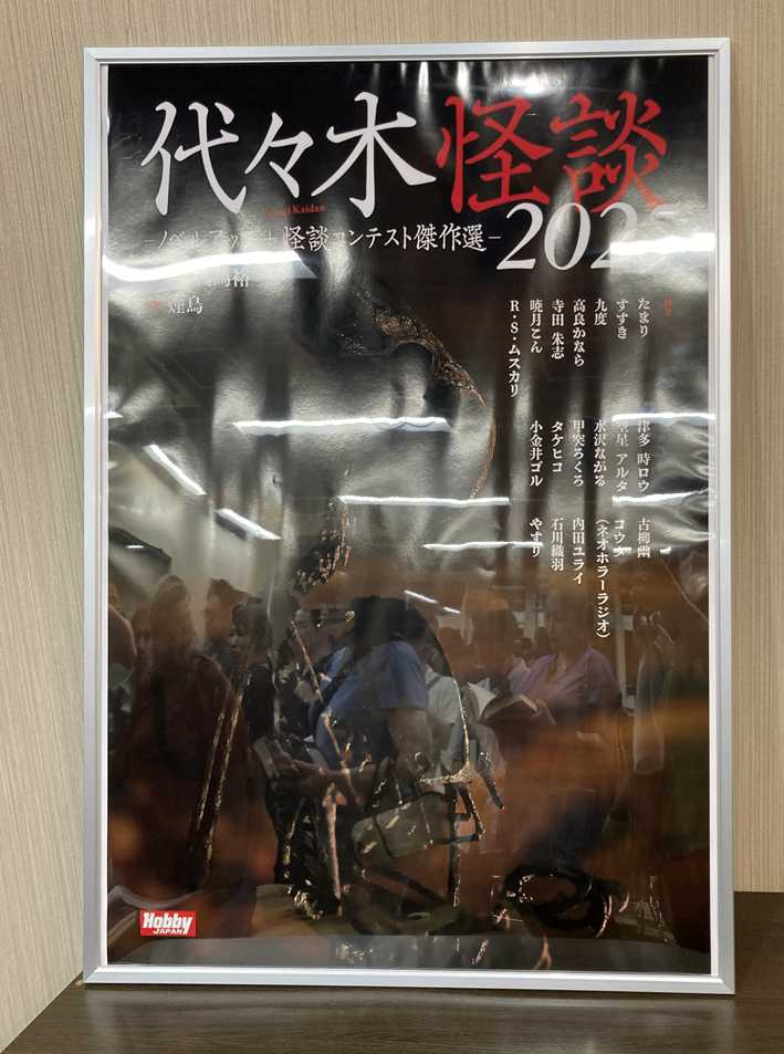 この日がやって来ましたよ!🤩✨ ということで、レポート書きます!😊 代々木怪談とあるけど、ホビージャパンのビルは代々木駅より新宿のほうが近いよなぁ……。 なんで「代々木」を冠しているのかしらと思って調べてみたら、創業当時が代々木だったらしい。 お目当ての建物前に到着すると、スーツを着た社員さんと思わしき方々に「怪談会に来られた方ですか」とお声をかけていただく。 「そうです!」と電子チケットを表示しようとするも、うまくサイトのQRコードが表示できず、モタモタする💦 そうしたら、「お名前を言っていただければだいじょうぶです!」と言われ、本名を伝えると確認が取れてそのまま入れてもらえました。 あとから確認したら、チケットはちゃんと使用済みになってました。 もしスマホの電源が落ちていても、チケット購入者の氏名確認が取れれば入場できるんですね……よかった……。 廊下の左手に、大きくプロジェクターで表示されてました。 ![]() 入場料1,600円。 最近の展示会や映画よりもお値打ち。 行かなくてどうするよ、って感じ。 開催地はホビージャパン本社の一階、ロビーとあったんですけども、ビル内に入ってみたら応接室、というか学校の教室くらいの広さの会議室でした。 そこに左右5席?のパイプ椅子が並べられていて、全体で──たぶん……50人超えくらいのキャパだったんじゃないかな……実際に数えてないから、記憶の中の印象だけど。 着席したとき、17時20分くらいだったと思う。 最初は二列目に座ったんだけど、一列目がひとつだけ空いていたので、そちらに移動させていただきました。 ![]() ステージ? 近い。 めっちゃ近い。 ライブハウスだとしたら、かぶりつきの良席。🤭✨ ![]() 書籍表紙の拡大ポスターですね。 わーい、ポスターに自分のペンネームがあるよ🤩✨ 表面にプラスチック保護板がつけてあるので、反射で室内の光景が写り込んでます。(ちょっと不穏に見えるけど😅) はじめて怪談会に来てみたので、この界隈がそうなのか、それとも今回がたまたまそうだったのか判別つきませんが、会場の9割方が女性でした。 自分が最高齢かなー? と覚悟してたのですが、見たところお姉様もおられましたね。 そのかわり、10代以下は皆無、20代はあまりいなかったような気がする。30〜40代がメインターゲット、という印象を受けました。 公演中は写真撮影、及び動画禁止のアナウンスがありました。 公演の進行としては夜馬裕さんの怪談一話と136(イサム)さんの一朗読、休憩を挟んでふたたびおふたりが一話ずつ披露して終了の流れ。 講演後には、購入した本にサインしてもらったり記念写真撮影が可能とのこと。 開始して10分ほど、「代々木怪談」の書籍について、監修された夜馬裕さんが説明されました。 怪談ながら、ノベルアッププラスに投稿された作品は通常の怪談話と印象が違うものがあるそうで、それはデジタルメディアが横書きを主流にしているせいではないか、とおっしゃられていました。 話のリズム感(と称されていたかは記憶に定かではない💦)と疾走感が違う、という話をされてました。 たしかに、ネットサイト上で文章公開すると、全文内の改行が多くなりがち。 利用している年齢層もあるのかもしれないけど、小難しい読み物は敬遠されるし、内容が平易で、何行にも渡る長文が少ない。 タブレットやPCではなく、大半がスマホで横書きの文章をスクロールしながら流し読みをする。当然、表示上の文字自体が印刷物より小さくなるため、詰まった文字配列は視認性が悪い。 ベタ打ちで文字を羅列しまくった文章では、スクロール読みをしていると視点移動がうまくいかなくなってしまうんですよ。 いわゆる、無意識の流し読みをする傾向が強くなると感じてます。 結果、短い文面で理解しやすい表現に言い換えるのを意識して、改行を多用することになる。 いまどこを読んでいるのか、容易に認識させたいから。 近年のネット公開のライトノベルが紙面化された本を見ると、ネット用の空改行を削っても、昔の小説と比べて紙面の空白が多く、文面がばらけてる印象を受けます。 136さんは、気分良く読める作品が多いとおっしゃってました。 ネット小説は、ダラダラした長文が好まれないから、かもしれませんね。 このあたりがテンポのよさを生んでいるのかも。 さて、怪談会開始です。 1話目は、初出しのちょっとロマンティック?な怪談。 内容は……二転三転の予想外展開でした。 わたし、怪談会というのは初参加でしたが、このリアルタイム展開は面白かったです。 しかも何度も笑いが起きたり、「怖っ!」って思ったり。 非常に語りが上手い。緩急つけて飽きさせず、会場を見渡しながら話されるので、何度か目があったように感じました。(自意識過剰なだけで、気のせいかもしれない) 話術に引き込まれました。感激しましたね。 あれだけの長文内容をよく、間違えず、つっかえず、話し続けることができる。 す