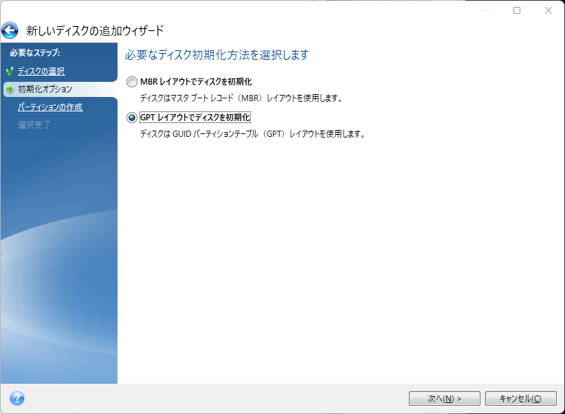 メモリーの需要増加に伴いハードディスクも需要が上がっているようです。 WD80EAAZ [3.5インチ内蔵HDD / 8TB / 5640rpm / 256MBキャッシュ / WD Blueシリーズ / 国内正規代理店品] 久しぶりだったので、すっかり設定方法忘れてました。 先ずは、PCのマザーボードからハードディスク用の電源ケーブルとインターフェイスケーブル(SATA)を差し込みます。 これでけで大丈夫なので本当に楽ですね。 次にBIOSは自動認識なので、PCを立ち上げて、Western Digital社が配布しているハードディスク設定用の アプリケーションを立ち上げます。 立ち上がるとこのような画面になります。 「新しいハードディスクの追加」を選択 ディスク3が今回増設したハードディスクになるのでこれを選択。 選択して次へを押す。 MBRとGPTの選択がありますが、ここは最近のWin11ならGPTを選択します。 古いWindowsだとMBRですが、最新のはGPTです。 ハードディスクのラベルの付けの作業のキャプチャー撮り忘れました。