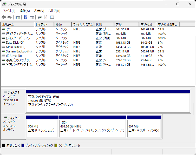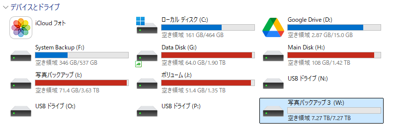 ラベルは「写真バックアップ」としました。 これでフォーマットと領域確保までは完了したので、次はWindowsの設定です。 Windowsマークにカーソルを合わせて、右クリックすると「ディスク管理」の画面が出てきます。 増加したハードディスクを選び、右クリックを押すと「シンプル ボリュームの作成」と出てくるので それを選択します。 「次へ」を選択 ここで、私は全容量を1つのドライブに割り当てるので容量全部をボリュームサイズに入れて「次へ」を選択 ここではWを選択しました。基本は空いているドライブが表記されているのですが、他のハードディスクも使っているのでWにしました。 これで正常に認識されたはず! ちゃんと認識されました! おー、16TBもある! すごーい。 これでハードディスクの増設が完了しました。 これで暫くは安心です!