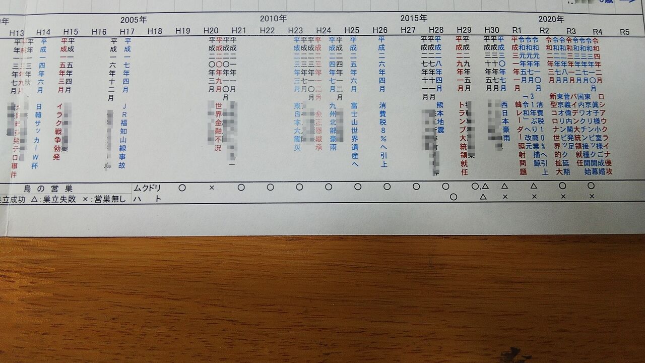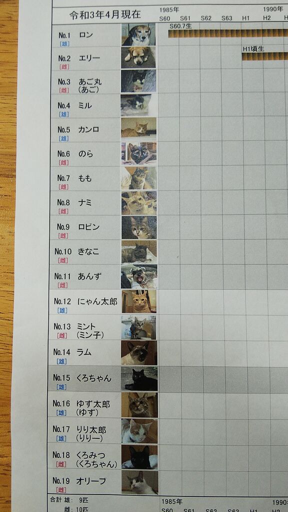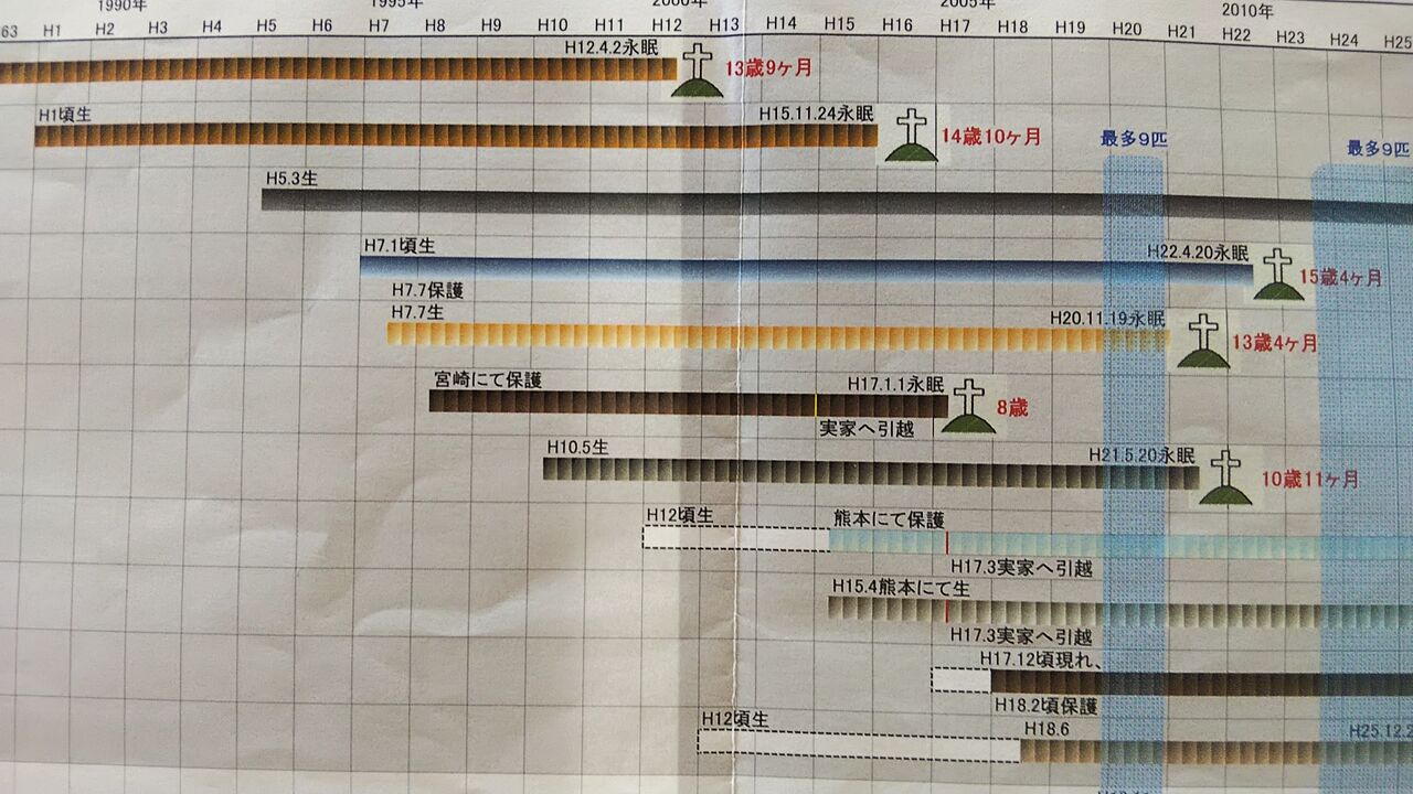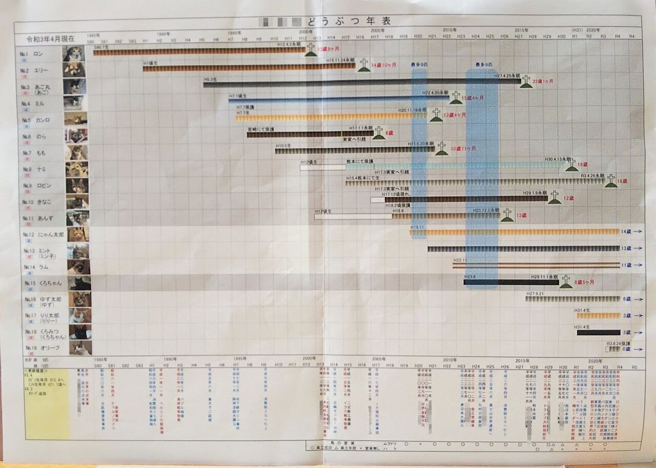 我が家には、私が生まれる以前からもたくさんの動物たちがいたそうで 代々動物好きの家系のようです。 私が生まれてからも常に、愛犬や愛猫が傍にいてくれていて ここ数十年に至っては、人よりも動物の数の方が圧倒しています。 以前紹介したように現在、私の実家には愛猫が8匹います。 今日紹介したいのは、私たち一家のように犬や猫など沢山の動物たちと暮らす 人達に特に強くおすすめしたいものです。 それがこちら↓(ちょっと見にくいかもしれませんが、すいません) 私の一番上の兄が約10年前ぐらいから作成した「どうぶつ年表」です。 これは本当に画期的なものとなりました。 データ化しているので、我が家のように定期的に保護猫がやってきても 毎年毎年、簡単に更新していくことが出来ます。 どうぶつ年表グラフ各表記説明 ①縦軸 我が家にこれまで在籍してきた愛犬・愛猫を 名前と写真付きで在籍した順番に並べています。 また雌雄も区別することで、最下部にそれぞれの合計を出せます。 亡くなっいる子にはグレーで色付けをし、存命の子との区別ができるようにしています。 ➁横軸 その子の出生、保護、逝去した年が分かるように 元号(西暦)になっています。 ③最下部記載の項目 こちらにも元号(西暦)を表記し 黒字 我が家(近しい親戚含む)の出来事 青地 国内の大きな出来事 赤字 世界の大きな出来事 以上3つを記載しています。 また、我が家には10年以上前ぐらいから 毎年ムクドリやハトが巣作りをしに来るようになり、巣箱を設置しています。 その為さらに一番下には、ムクドリ・ハトそれぞれの巣立成功、営巣無し、巣立失敗 を〇×△で表記しています。 年表グラフから見えてくるものとは? では作成した年表を見ていきます。 まず棒グラフから見ていくと・・・ 亡くなっている子も含めた全ての子たちの存命期間を知り、 その長さを簡単に比較することが出来ます。 病気で短命だった子や長寿だった子も改めて視覚的に分かります。 ちなみに最長寿は22歳1か月で旅立ったあご丸(♀)です。 次に棒グラフの重なりに注目して見ると、その当時家にいた動物たちの最多・最小数 が見えてきます。 最多で9匹の犬・猫が、家にいたんですよねぇ。 また重なりを見ていくことで、この子とこの子は一緒にいる期間があったんだというのを 再確認でき、存命の子の歴史をしみじみと感じますし 旅立った子たちのことも身近に感じることが出来ます。 全体を通して見ていくと・・・ 私たち家族が、ストレスをなるべく与えないように気を付けていても 一緒に暮らす小さな動物たちは、色んな場面でストレスを大なり小なり感じているものです。 その負担は、人と比べて短命で喋ることの出来ない動物の身になると 計り知れないものがあると常々思います。 最下部に記載した3種の出来事を記載することによって 全体を見たときに、それぞれの子たちにどういう影響(良くも悪くも)やストレス を与えていたのかを振り返ることが出来ます。 天候・災害にストレスを受けやすかった子、 家族の入院・不幸などで同時に体調を壊してしまった子 家のリホームや工事などにより体調を壊してしまった子など・・・ 様々な関係性を考察し、反省することが出来ます。 また鳥の営巣も含めて、全体をひとつの出来事として捉えて見てみると その年年で運気のようなものもあるように思います。 年表作成に至った経緯 私たち家族には、恒例のようになっている事があります。 愛犬・愛猫が虹の橋へと旅立った後、お通夜・火葬までの最期のお別れ をした夜に家族みんなで集まって食事をしに行くことです。 精進あげのようなものですね。 家族それぞれの視点で見てきたその子の一面や思い出などを話し、 共有して偲びます(その場はみんなして泣いてます(笑)) 動物が多い私たち家族は、こうした大事な子たちとの別れをたくさん してきました。 そして、決して亡くなった子たちの事を忘れるわけではありませんが、 新たな出会いがあったり、今いる子たちが多いこともあり 月日とともに記憶も薄れてきます。 そこで兄は、家族みんなで集まった偲ぶ場などでいつでも振り返れるようにと どうぶつ年表を作成してくれたんです。 まとめ 振り返ってみると、本当にその子その子によって違った別れ方を経験してきました。 そして、選択を迫られる場面が何度も訪れるので 必ず、生前「こうしておけば・・・」とそれぞれの子に対して後悔してしまいます。 これは、短命で言葉を話すことの出来ない動物を愛おしく、大事に思うが故・・・ これから先も続いていく仕方のないことなのかもしれません。 しかし、ゼロにするのは難しいですが、この先も必ず訪れる別れの後の 後悔を少しでも減らしていくことが・・・ 私は、動物と家族として暮らしていく上での永遠のテーマだと考えています。 その為にも、兄が作ってくれたこのどうぶつ年表を利用し、 歴代の子たちが与えてくれた沢山のこと、教えられ