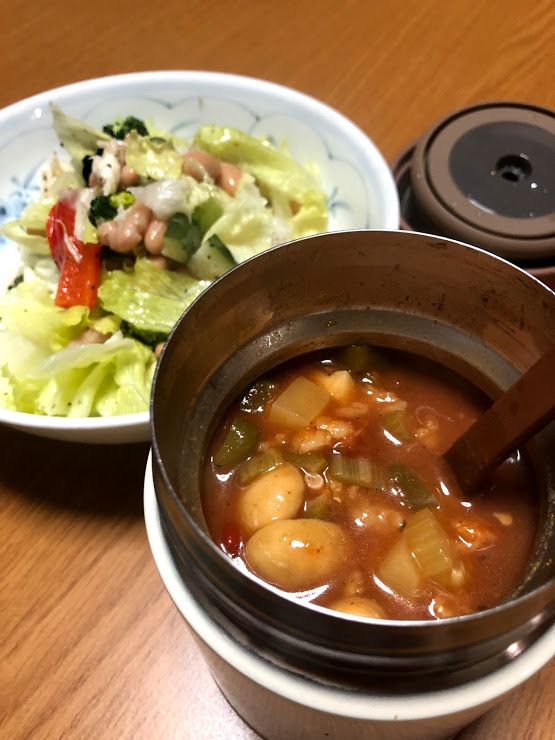 曇り空の今夜、明日は東京でも局地的に雪が降るかも知れないですね。うちの猫は暖房の効いた部屋でお腹出して寝てますが、会社からの帰り道、外は風も強くてかなり寒かったです。片道徒歩25分の通勤なので、家に帰るとまず薬缶でお湯を沸かし沸騰するまでの間に、ストーブの前で縮こまるのが習慣です(笑)なんとなく疲れていて、甘みのあるものが食べたかったので、今夜は栗かぼちゃと、昨日サラダに使った余りのミックスビーンズのオートミールにしました。こっくりした甘みがなんとも幸せな味で、インスタントスープを使って超簡単に作れます。市販のインスタントスープは150~180ccのお湯で作ることを想定してパックになってるので、少しだけ塩を足して味を調節しています。ミックスビーンズを冷凍かぼちゃに置き換えると、より甘みも増してかぼちゃ感満載の仕上がりになります。冷凍食材を使う時は、電子レンジで解凍してから使ってくださいね。それから、このレシピでは鍋に塩を入れてからジャーに仕込んでいますが、初めて使うスープの素の時は食べるときに塩を足したりしています。その辺は、臨機応変に。食べるのは自分だしね。それでは、レシピです。<栗かぼちゃとミックスビーンズスープ オートミール 約250kcal>※サーモス400mlのスープジャーで作る分量ですロールドオーツ 30gクノール くりかぼちゃのポタージュスープ 1袋ミックスビーンズの缶詰(ひよこ豆・白いんげん・赤いんげん・白おたふく豆) 30g玉ねぎ(1cm角切り) 1/4個水 300cc塩 ひとつまみはじめに予熱のために熱湯をスープジャーに入れて蓋をして放っておきます。次に鍋にミックスビーンズと玉ねぎ、水を入れて沸騰させます。火を止めて、塩とスープの素とロールドオーツを入れて、よく混ぜながらもう一度沸かします。スープが再度沸騰したら、ジャーの中の予熱用のお湯を捨ててジャーに入れて1時間半放置で完成!スプーンでよく混ぜて食べるとウマー!!ミックスビーンズがふんわりと温まり、かぼちゃと柔らかく煮えた玉ねぎの優しい味が冷えた体を包み込んでくれます。もちもちのオーツが甘みを吸って美味しいです。オーツが30g入っているので、食べ応え抜群で幸せいっぱい!このスープの素にはかぼちゃの皮も少し入っていて、それもまた美味しいです。疲れ切って面倒臭い!って思う時はスープの素だけで仕込んでもOKです。とにかくお手軽に、オートミールでほっこりしたいです。お米で作る時は、オートミールを生米大さじ3に置き換えて3時間以上放置する必要があります。オートミールの良いところは、調理時間が短縮できるってとこですね。ごちそうさまでした(^_^)補足リンク(当ブログ内記事へのリンクです)オートミールってなに?ミューズリーってなに?スープジャーってなに?