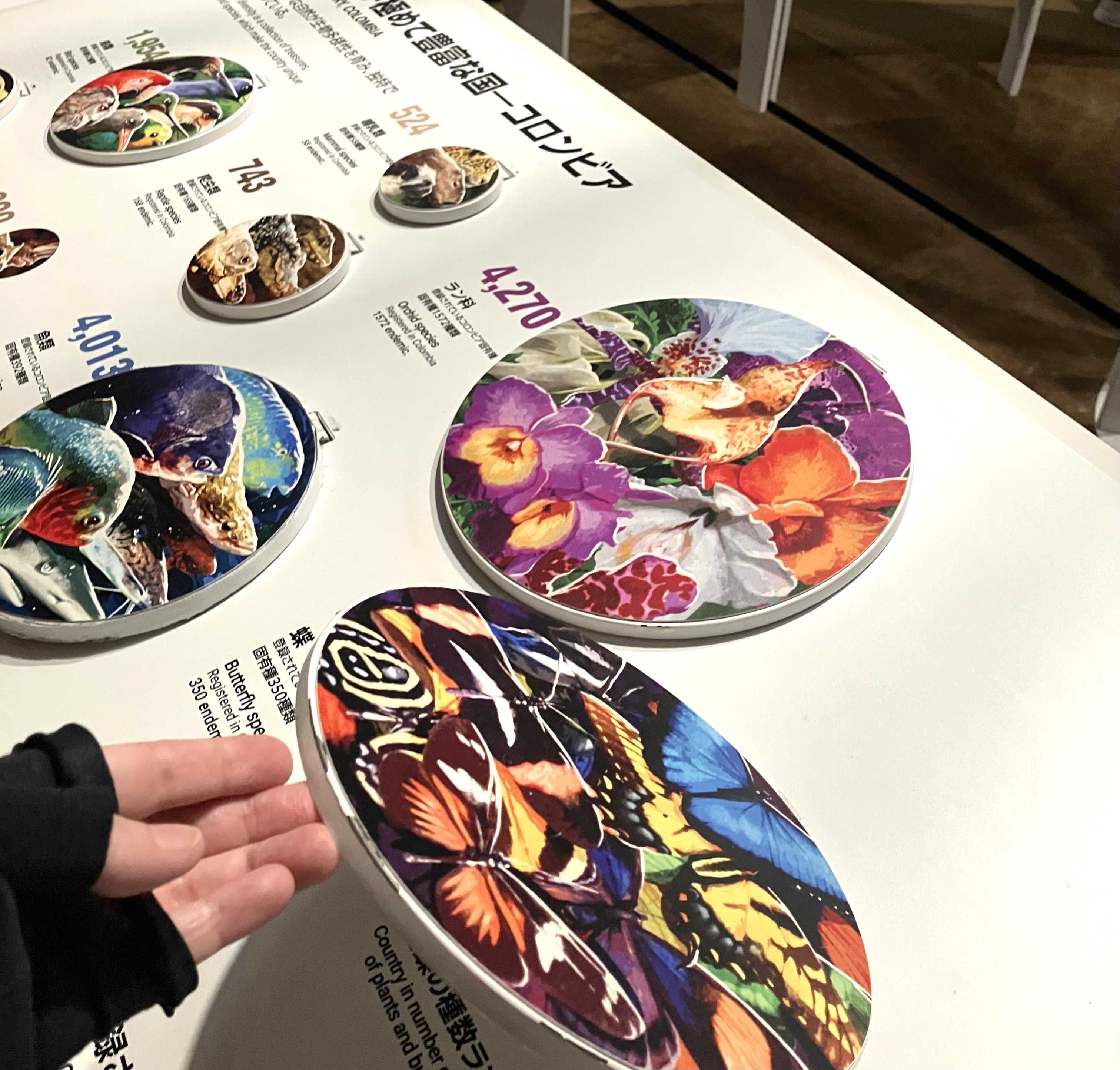 こちらは展示後半エリアの写真。 ![]() ここがスタートだったと思う。 ![]() このタイプライターは実際に使われたものとのことで、すごいんですよ、と紹介されていて、じっくり見たかったんですが立ち位置が悪かったです。ガルシア・マルケスさん、存じ上げませんでしたので、帰ってきてから調べました。 ![]() 次のエリアに行くと、床も壁も映像。鮮やかできれいでした。円柱型のものがぐるっと円形になっていて、コロンビアの産物が紹介されています。 ![]() コロンビアと言ったらコーヒー、と思ってしまう。 ![]() おおっ宝石!取れないようにがっつりと固められておりました。 ![]() コロンビアにはたくさんの種類の蝶がいるそうです。 ![]() どこまでも色合いが派手です。 ![]() 床に映る映像の一部。花や海の生き物など、いろいろなものが映し出されていました。 ![]() 生物や植物が色鮮やかに表現されていて、絨毯のような床に映る映像はとてもきれいでした。 パビリオンに入らなくても、外にあるカフェとショップは利用できます。 ショップでモアナに出てくるヘイヘイに似てるの見つけました。これは7月に行った時の写真ですが、8月に行った時はこの商品はもうなかったです。 ![]() #EXPO2025大阪・関西万博 お気に入りの記事を「いいね!」で応援しよう