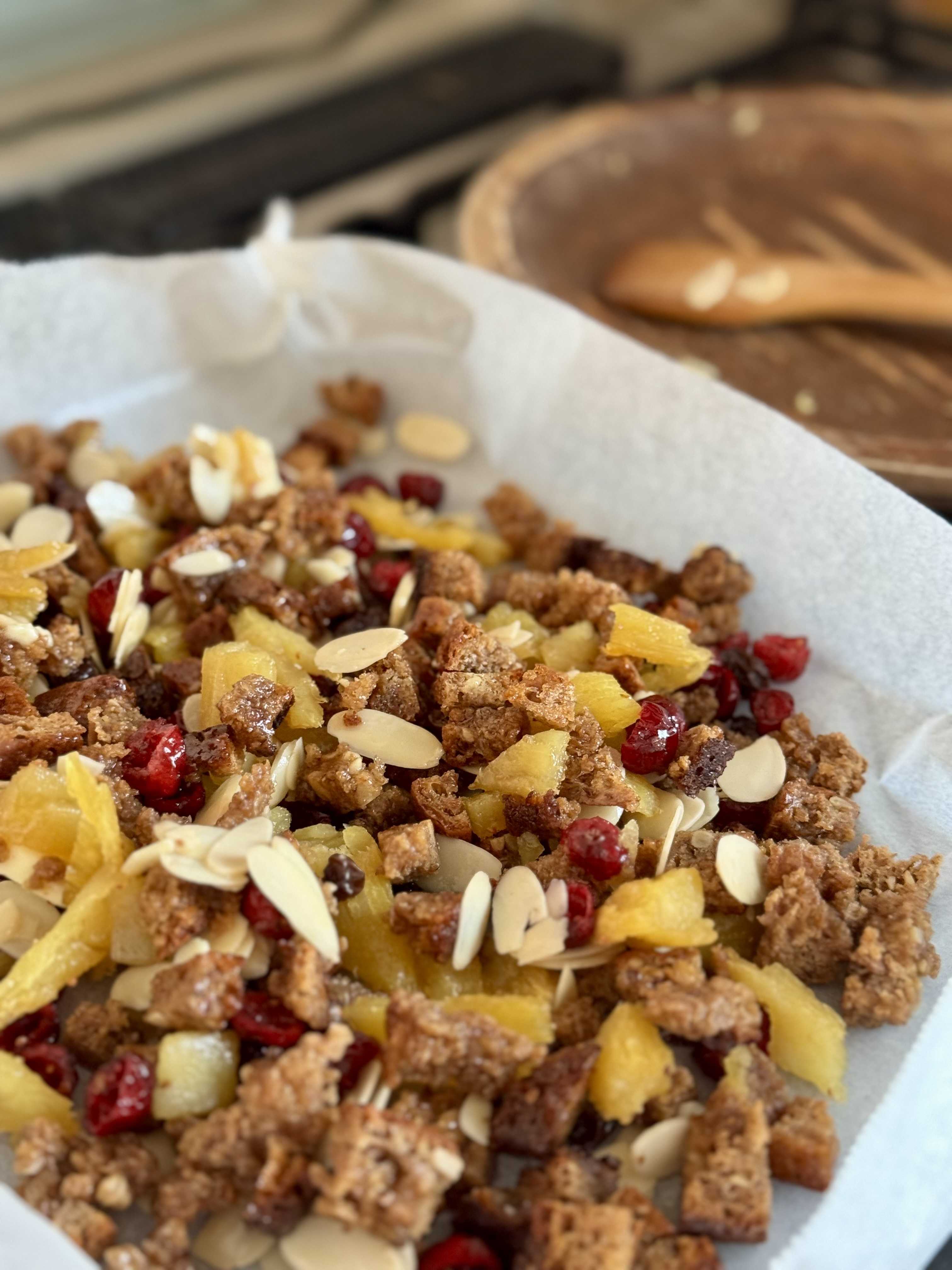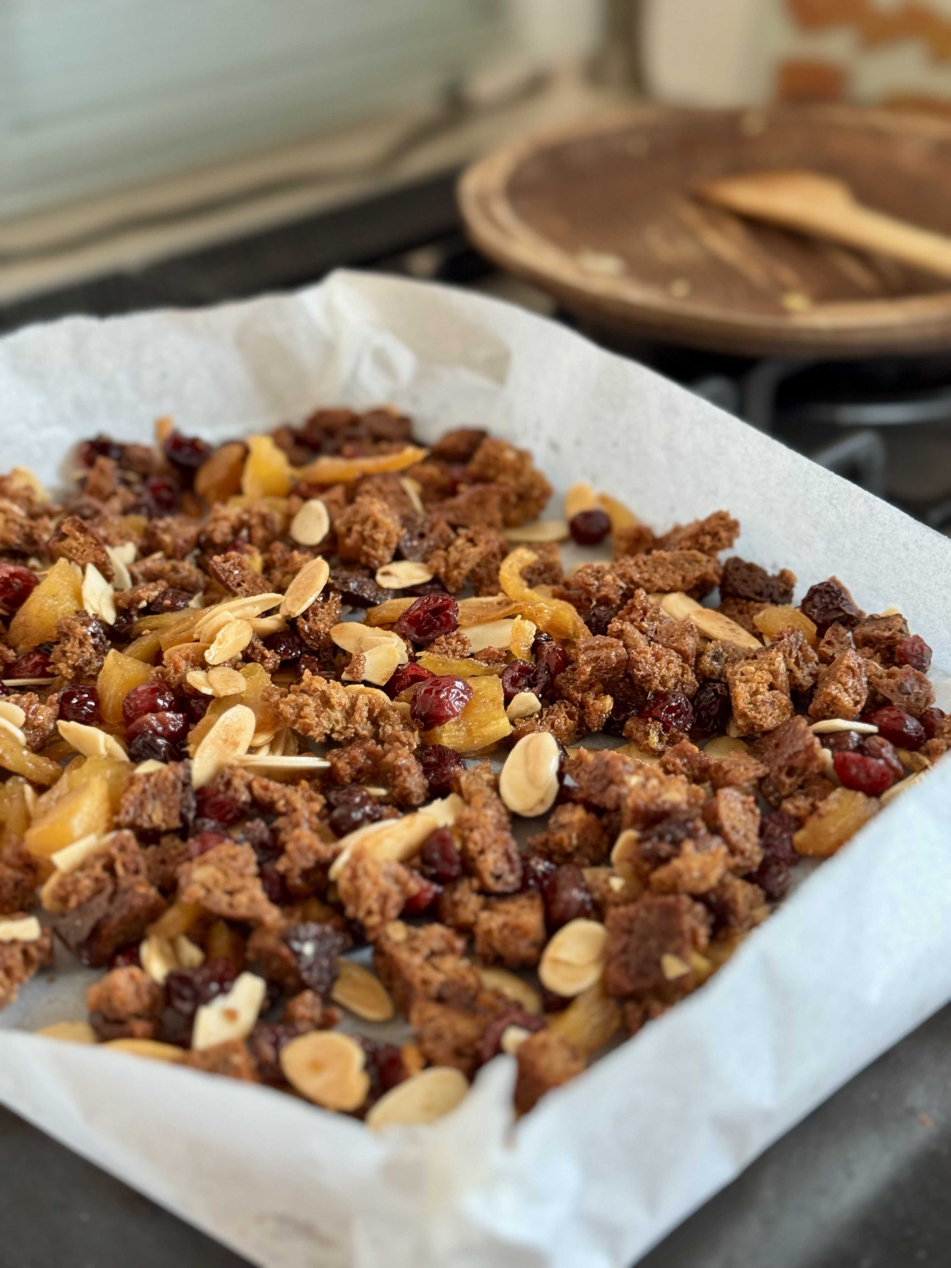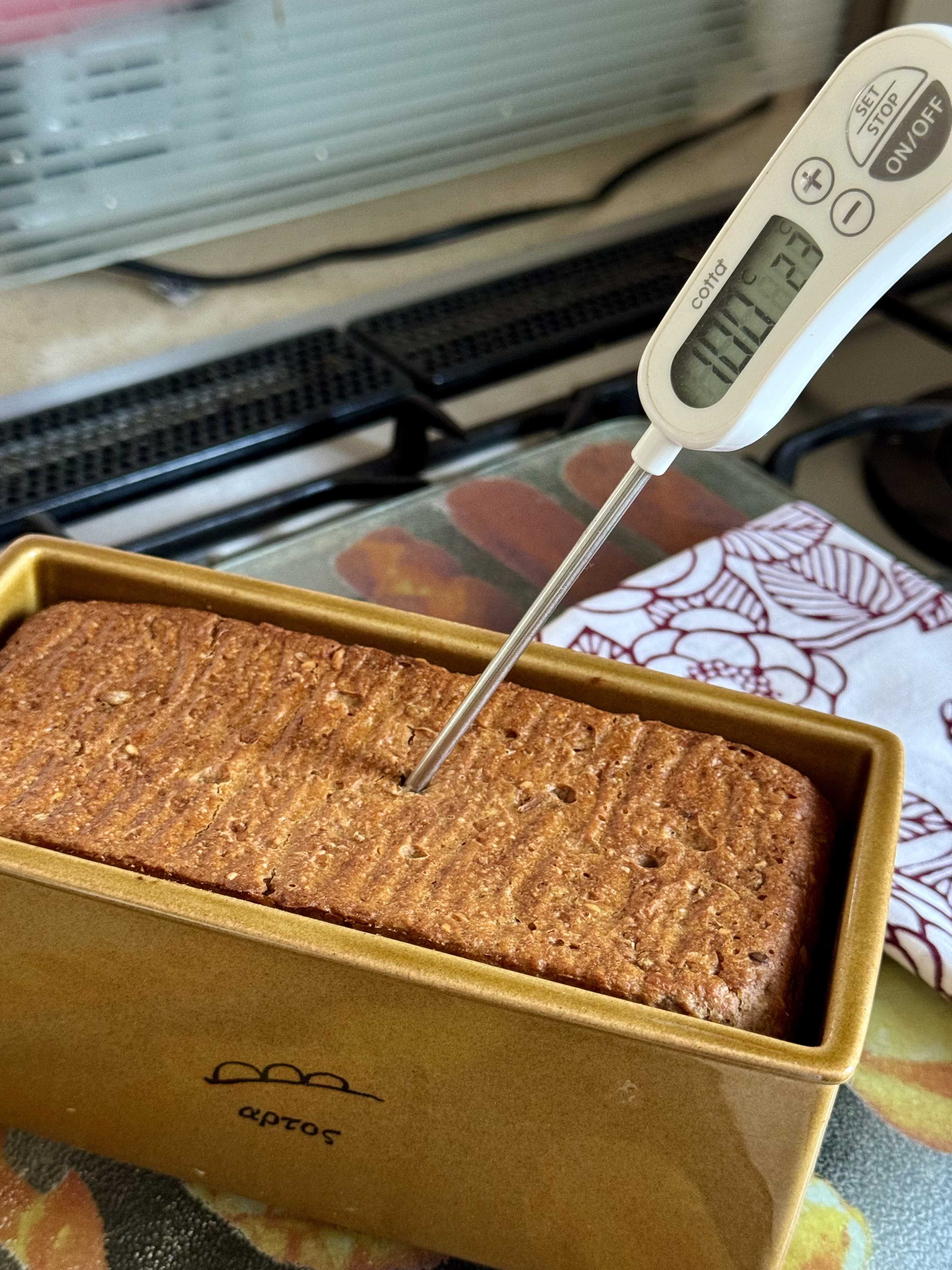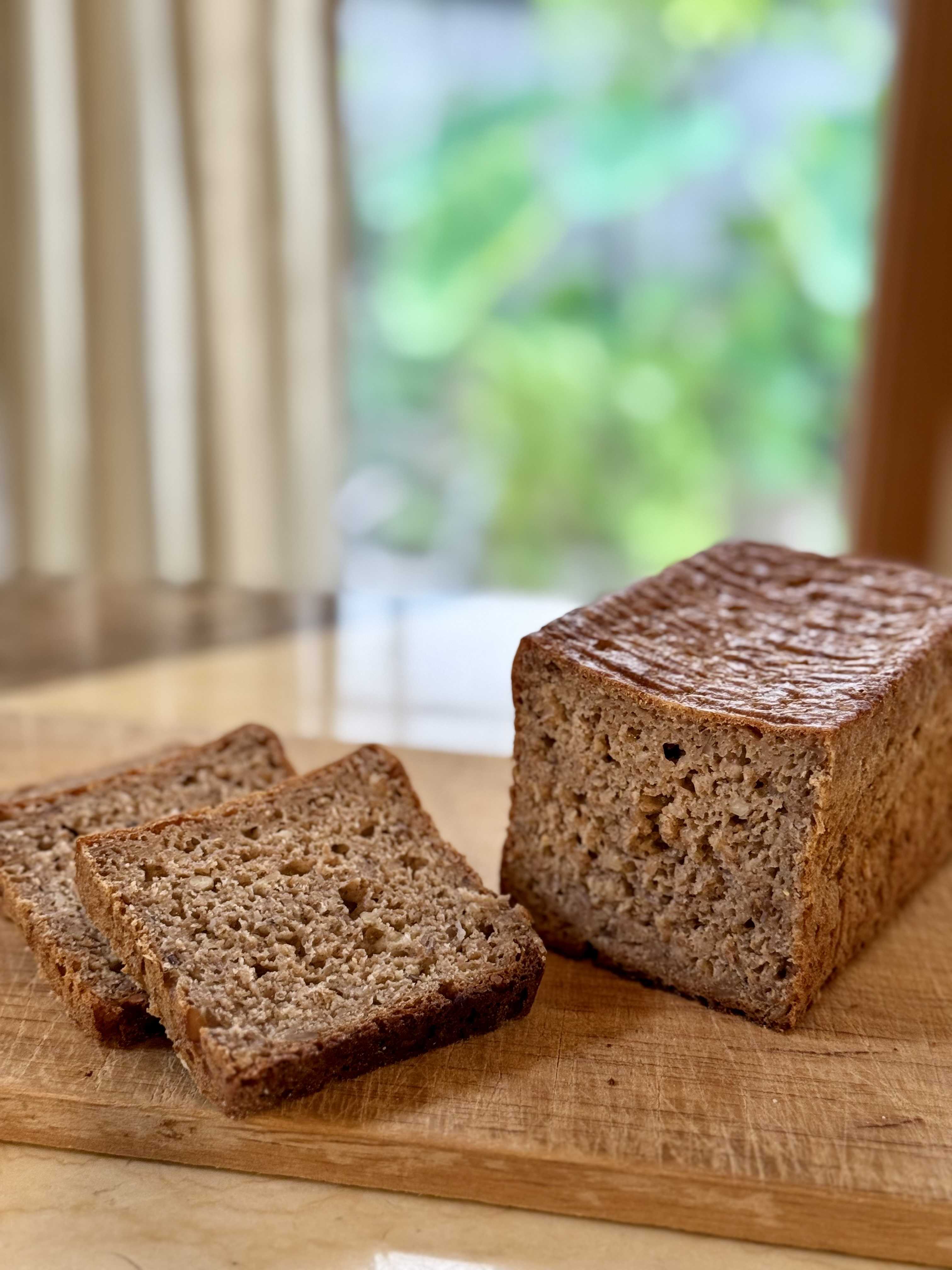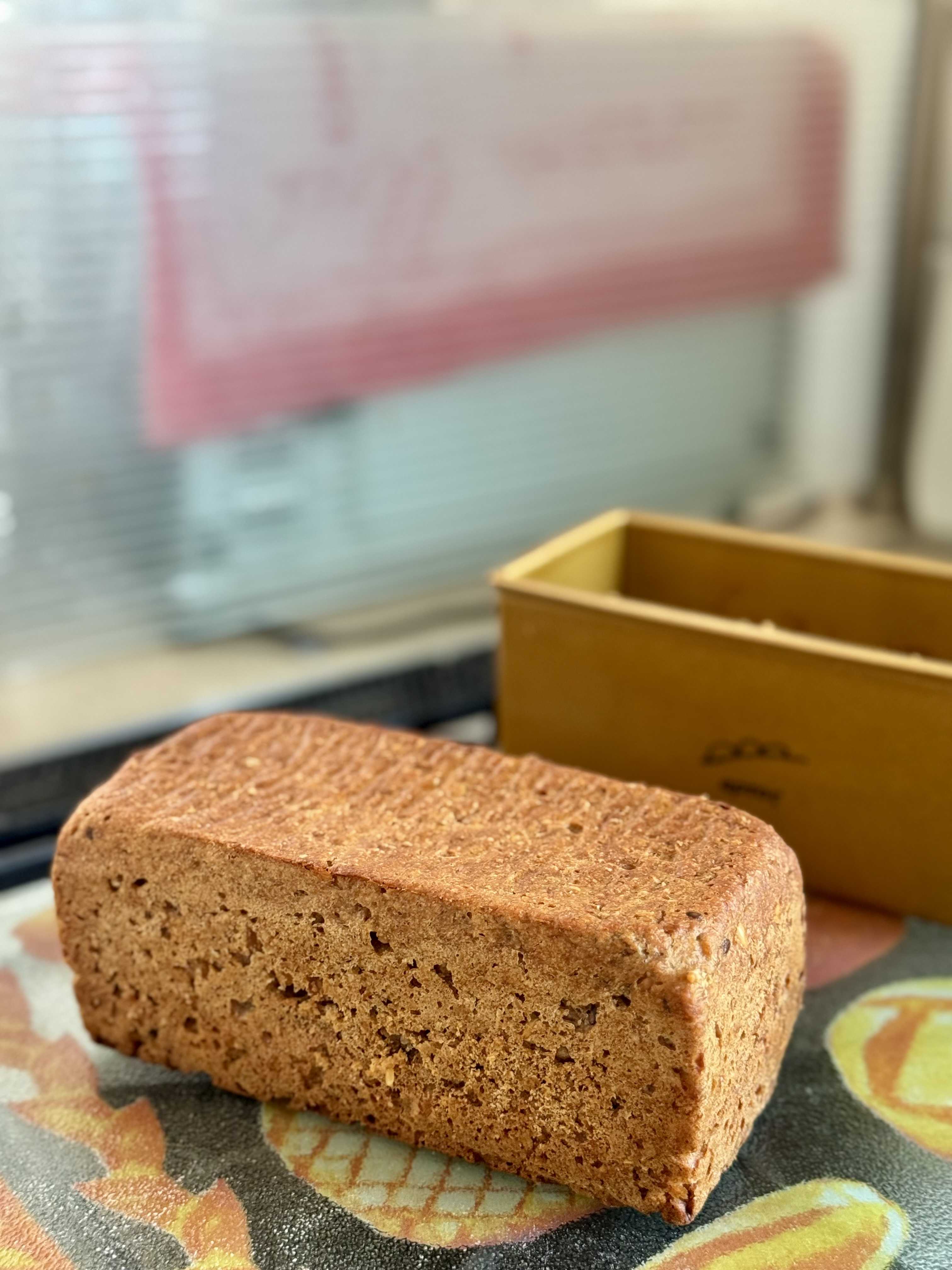 ロブロを焼きました。 まだまだ認知度が低い、北欧デンマークのライ麦全粒パンです。 今回もホシノ丹沢酵母とフォルサワー(サワー種)を入れています。水分はほとんどがヨーグルトの水分です。 ![]() いつも試行錯誤の状態で、今回は一次発酵時間が長過ぎたかも。焼き上がりにいつもより酸味を感じたからです。写真はホイロ後で、部屋の中で3時間位でした。 ![]() 焼き上がりは中心温度が98℃になっていれば大丈夫との事。1時間20分ほど釜に入っていました。 ![]() 型には離型剤をスプレーしていましたが、側面が引っ付いていました。伏せて蒸らすようにしていたら、何とか外れました。ホッ ![]() 布巾に包んで冷まします。 一晩置いてカットしてみました。 ![]() 前回は底が硬く焼き上がったのですが、陶器の型が良かったのか大丈夫でした。 普通のパンと違ってふんわり食感じゃないですよ。 ![]() 嫌な酸味じゃないのですが、今までは出なかった酸味なので、きっと発酵時間の長さが原因と思います。 これは、何回か焼いてみて自分の好きな味に近づけるしかないです。 サンドにしたり、クリームチーズとジャムで食べたり、シンプルに冷たいバターをのせて食べたりして楽しみます。食感はもっちり感もあるけれど、ホロっとして口の中で解ける(ほどける)ような感じです。これは好き嫌いが分かれそうかな。 ![]() カットした端切れと一枚失敬して、グラノーラにしました。 黄色いのはなんと焼き芋、赤いのはクランベリー、レーズンとスライスアーモンドを入れました。 ![]() ギーとメイプルシロップを絡めています。 ロブロはカリッとして、お芋とドライフルーツはネッチリしています。 売っているお店がまだまだ少なく、自分のロブロに自信がなかったのですが、チクテベーカリーさんのを食べて納得。 今から流行るか分かりませんが、ワタシは好きなので、焼き続けたいと思っています。 お気に入りの記事を「いいね!」で応援しよう