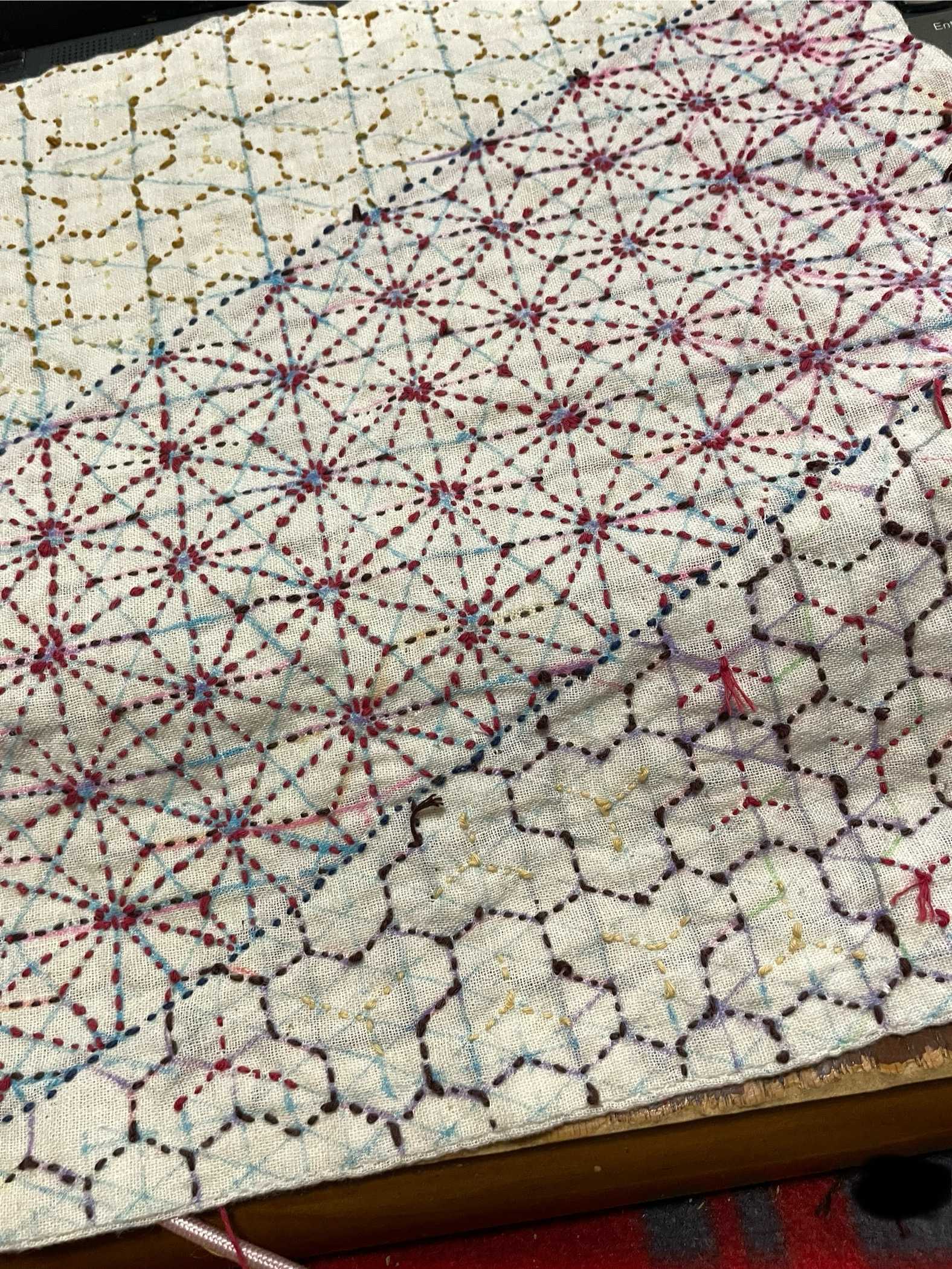 先日の刺し子。とりあえず刺す作業だけは終了。表裏刺し子の良い点は、裏も表も模様が浮かび上がること。刺繍と刺し子の違いは、このままググればAI様が回答してくださってるので、そこでご参照ください。私の中では刺し子は元をただせば『補修』的な意味合いの高く、刺繍は『飾り』的なイメージですけどね。この布巾。後は水通しして、表裏に出てる糸を切ってアイロンを当てて、下書きの線を消したら、もっとさっぱりした感じになるかな?麻の葉も毘沙門亀甲も、迷子になりすぎて、いったいどこを刺してるのか?どう刺したらいいのか?('◇')ゞ迷いに迷い。。何度刺し直したことか('◇')ゞさて、次は何を刺そうか??な(笑)刺してる時間が楽しい('◇')ゞ