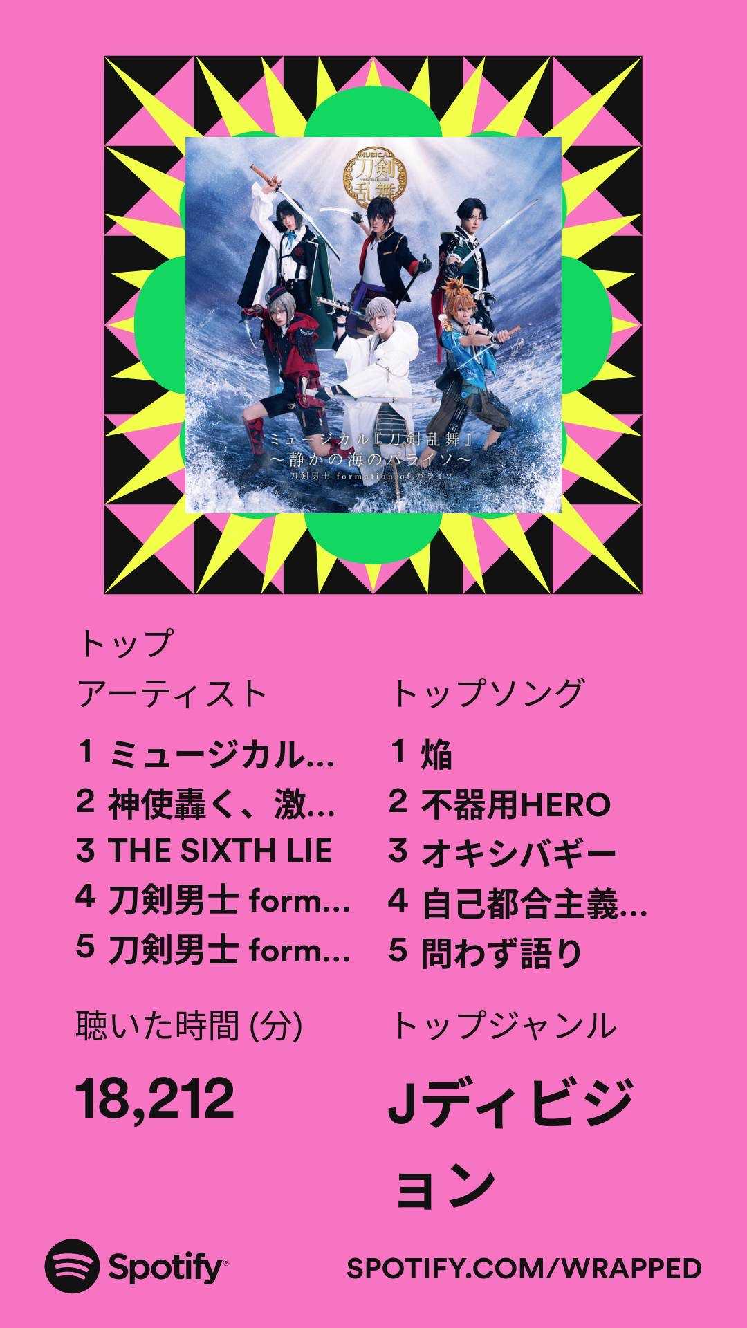 こんばんは、今年のSpotifyまとめをSpotifyが作ってくれたので供養したいと思いますほぼほぼ刀剣乱舞しか聴いていないかもしれない。曲数が多いだけなのだが、、聴いた曲数は1089曲総再生時間は18,212分刀ミュ楽曲は3,861分も聴いていたみたいですかなり細かく出てきて数字管理が最近趣味なので中々面白いですちなみに通勤中に聴いていただけです🚎2位は神使轟く、激情の如く。好きなイケメン女さんがいるグループですかなりロック3位はTHE SIXTH LIE(ロックバンド)ボーカルの声がかなりクリーンで聴きやすくベースの子の顔が可愛いです間違ってはないですね昭和歌謡、80年代洋楽なども聴いてます最近はずっとテニモでラッキー千石を無駄に聴いてるのでSpotifyあまり開いてないですが、、来年のトップソングは何になるでしょうか?楽しみです