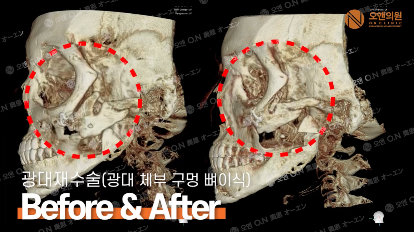 頬骨手術後のご相談で多いのが、 左右差や段差が気になるというお声です。 ![]() 今回の症例では、 頬骨再手術(体部骨移植) を行いました。 ![]() CT画像上では、 頬骨体部のボリューム不足と左右差、 骨の連続性が途切れて見える部分が確認されました。 ![]() このような場合、 単純な削骨ではかえってバランスを崩してしまう可能性があります。 ![]() そのため本症例では、 不足している体部に骨を移植し、 頬骨全体のラインを再構築しています。 術後CTでは、 骨のつながりが自然になり、 左右の高さや張り出しが整っていることが確認できます。 ![]() 実写写真においても、 時間の経過とともに腫れが引き、 より自然なフェイスラインへと変化していきます。 頬骨再手術は、 正確なCT診断と解剖学的理解が非常に重要です。 お一人おひとりの骨格状態に合わせた治療計画が、 無理のない仕上がりにつながります。