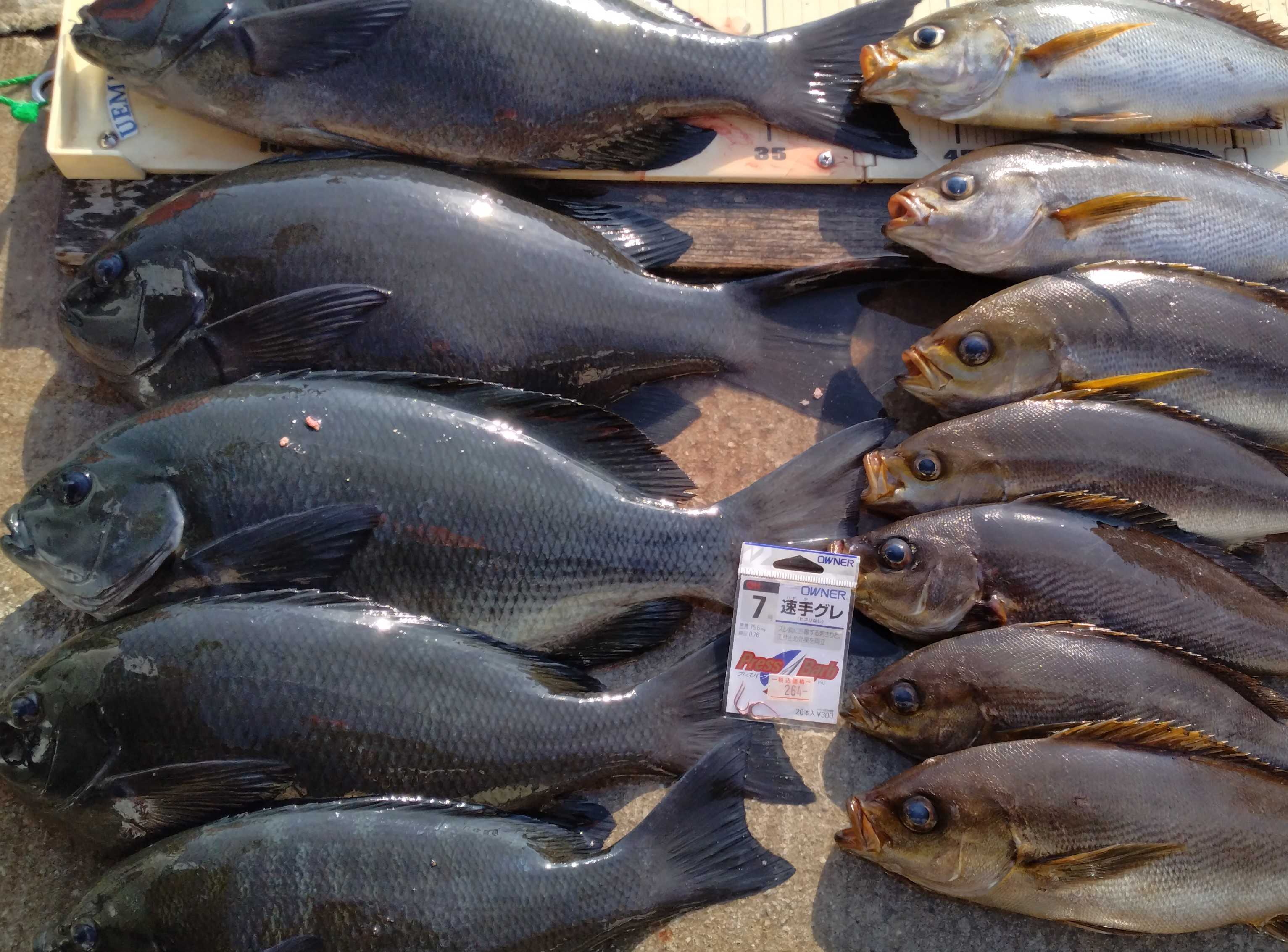 今年は忙しくて1月19日にやっと取材を兼ねたグレの初釣りにS水さんと出掛けました~♪ 午前6時15分、この🚢で出船 磯割抽選後、船長の勧めの磯へ ⇒ この日はなぜかウネリがついていてそれも結構な大きさ( ゚Д゚) ⇒ 安全な場所で開始 ⇒ 「とりあえずモーニング青物!」とプラグをキャスト ⇒ 数投しても反応がないからロッドを持ちかえる ⇒ 今回のマキエはこれをベースに作成 ウキは29サイズををチョイス ハリスはこのタイプを ハリはサシエに合わせてコレの7号を選択 相棒の反対側によさげな潮があったからそちらへ ⇒ 「さあ、来い!」と投入すると、すぐに良型イサキがヒット ⇒ 連発 ⇒ 「本命のグレちゃんはあそこか?」と狙いを変更 ⇒ ウネリの影響で発生するサラシに注意しながら操作 ⇒ 狙いのPに入っていくと、すぐにアタリ ⇒ 「来た!」と合わせる ⇒ 竿触は「グレ!」とやり取り開始 ⇒ 厄介な障害物を慎重にかわしながら誘導 ⇒ 無事にクリアーして今年の初物をゲットε-(´∀`*)ホッ ⇒ 体高のある本命でした 其の後もアタリは続き、両ターゲットを追加 ⇒ 「潮が変わるとあそこで」と思っていた場所はウネリの為にたどり着けないから断念 ⇒ 結果、お持ち帰りはこれだけでした その中から取材用に両手持ちで「パチリ!」 今回はウネリで釣りにくかったですが、初釣り&取材は成功となりましたからよかったです 翌日はコレで頂きましたヨ イサキも脂がのってきてました! 翌日は定番のグレのタタキ どちらも中々のマイウ~でした 後のお🐟さんは血抜き処理後、熟成中です さて、今回の詳細は1月27日(火)発売の『スポーツ報知新聞』に掲載されますのでご覧ください~