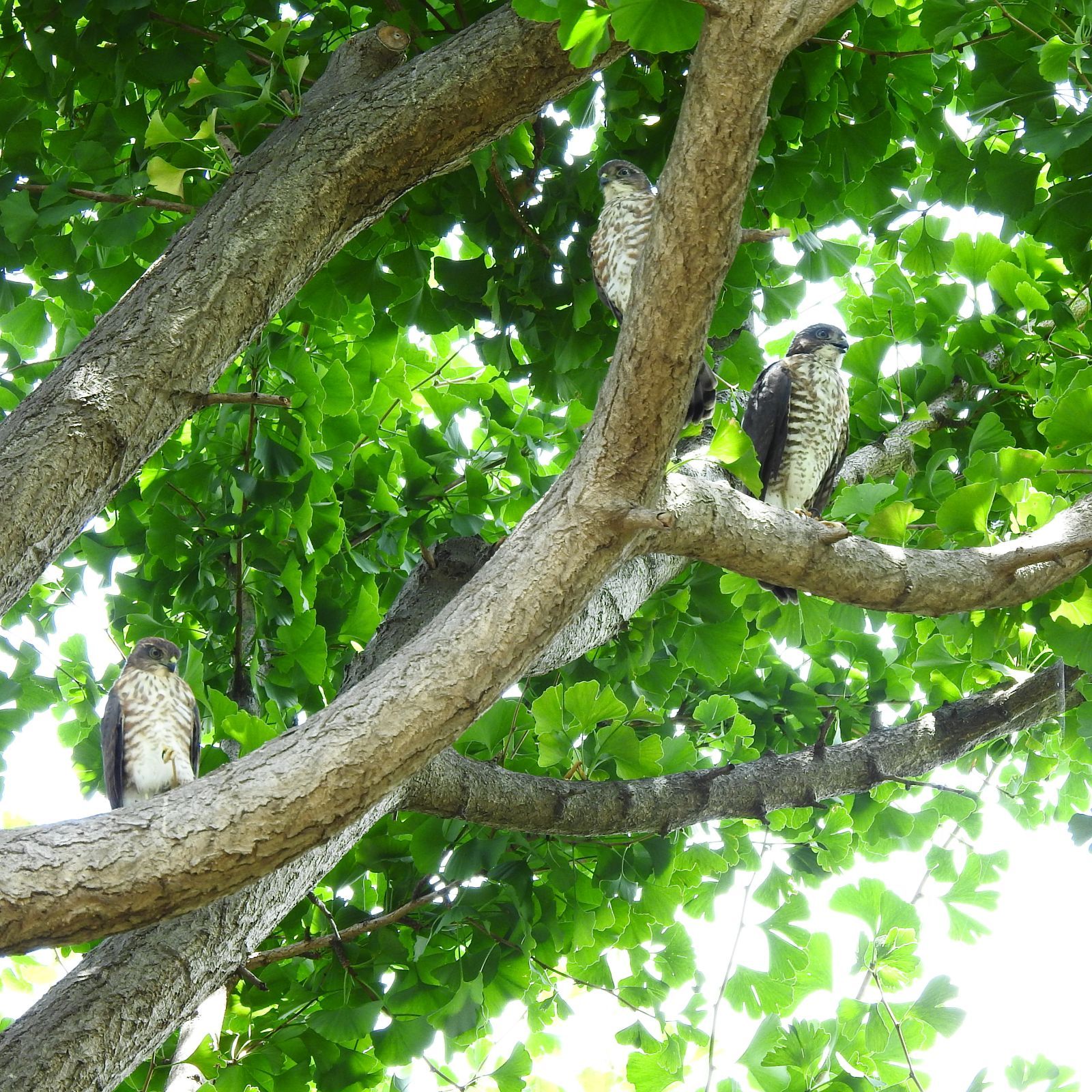 満潮時刻 4:44 199 18:33 203干潮時刻 11:32 -13 23:52 91 大潮最高気温 32℃ 最低気温 26℃ 日の出 4:35 日没 18:58 月齢 0 新月2組目に見つけたツミのペアは、無事に3羽が巣立ちを追えていた。巣立ち後1週間から10日ほどか?まだ幼さが残る。雛鳥でも体格差が歴然で、大きい方はメスだと思う。こちらが親鳥のメス。体の模様が雛と比べ横縞で細い。顔つきは、さすがに猛禽。これまで4組のペアの営巣を観察したが、雛鳥が無事に巣立ちを終えたのは初めて確認できた。