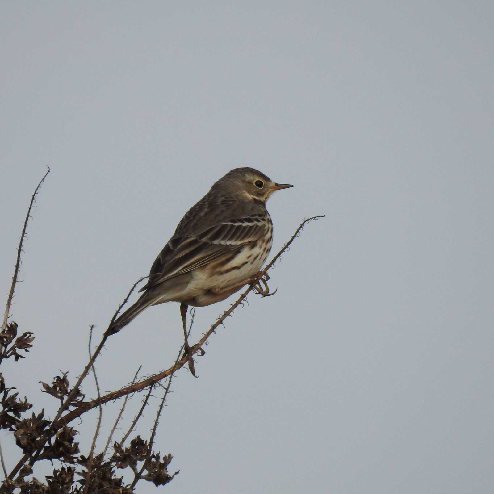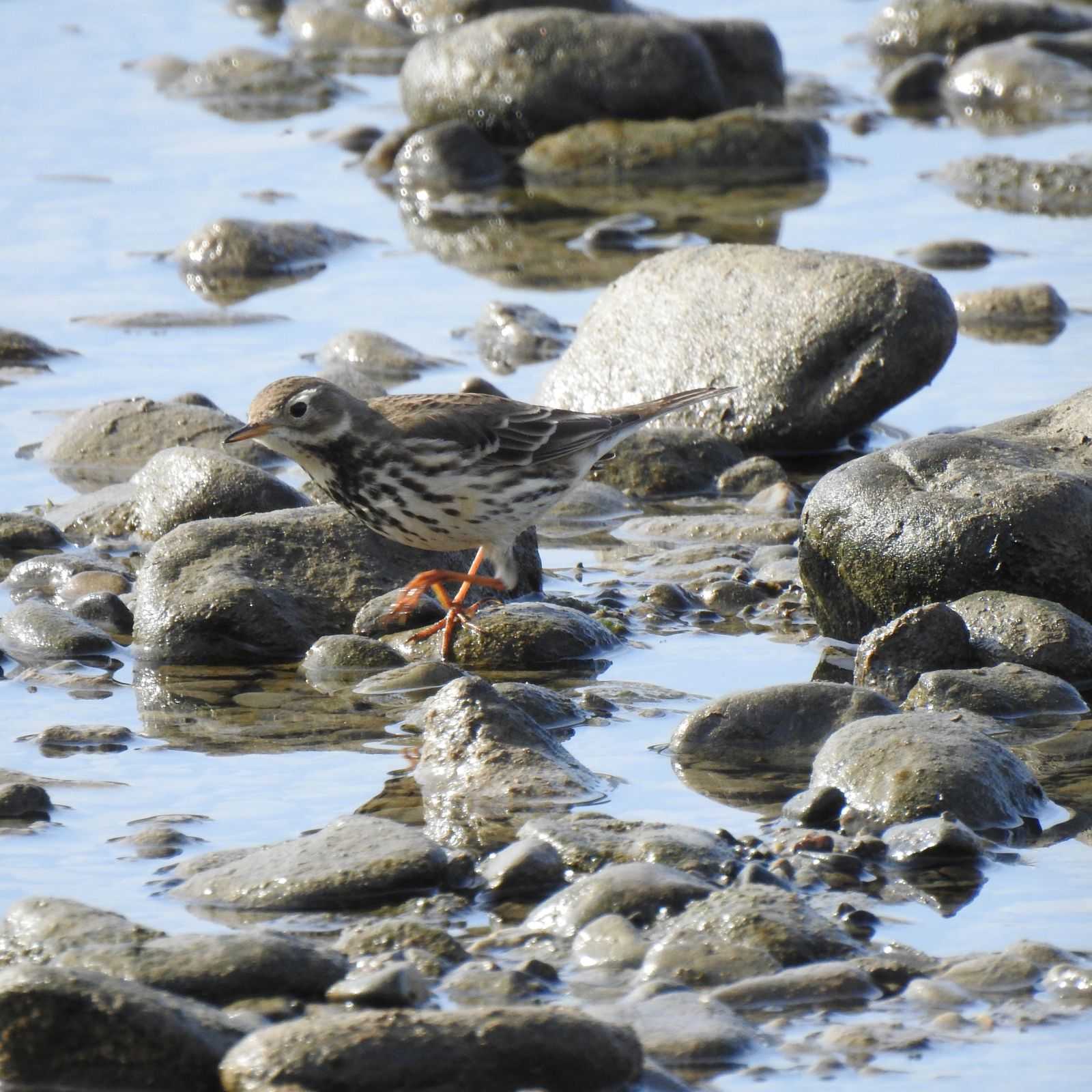 満潮時刻 7:11 199 18:13 197干潮時刻 0:17 -4 12:37 88 中潮最高気温 10℃ 最低気温 1℃ 日の出 6:42 日没 17:07 月齢 16.9富士山手前、丹沢あたりも雪が積もって見える。体型的にはモンゴルセグロカモメと思える個体。眼瞼はオレンジ色で虹彩は少し暗い。最大の特徴は風切り羽の突出、かなり長く見えるがP10はまだ伸長中。セグロカモメと考えている個体は、風切り羽はさほど長く見えない。ただ裏面にミラーが見られない点が気になる。伸長を終えると、どのように見えるか?嘴が太く短く見え、眼瞼は赤く光彩はやや明るい。亜種カモメ、翼の黒部が狭くコカモメを期待したが。嘴が太めで華奢には見えない。一般的な亜種カモメが正解だと考えた。タヒバリは59羽の群れを確認。全体がやや暗色で、体の模様が太い個体。ヨーロッパタヒバリの可能性がある。ヒバリが2羽混ざっていた。オオジュリン。セイタカシギ。バンは今季数が少ない。ツグミは芝生の上にいる個体数が増えた。こちらはメス。オスは色合いがクッキリ見える。メジロ。カンムリカイツブリ。ハマシギ、今季2羽でいる事が多かったが今日は4羽いた。ジシギは2羽確認した。ともにタシギのようだ。