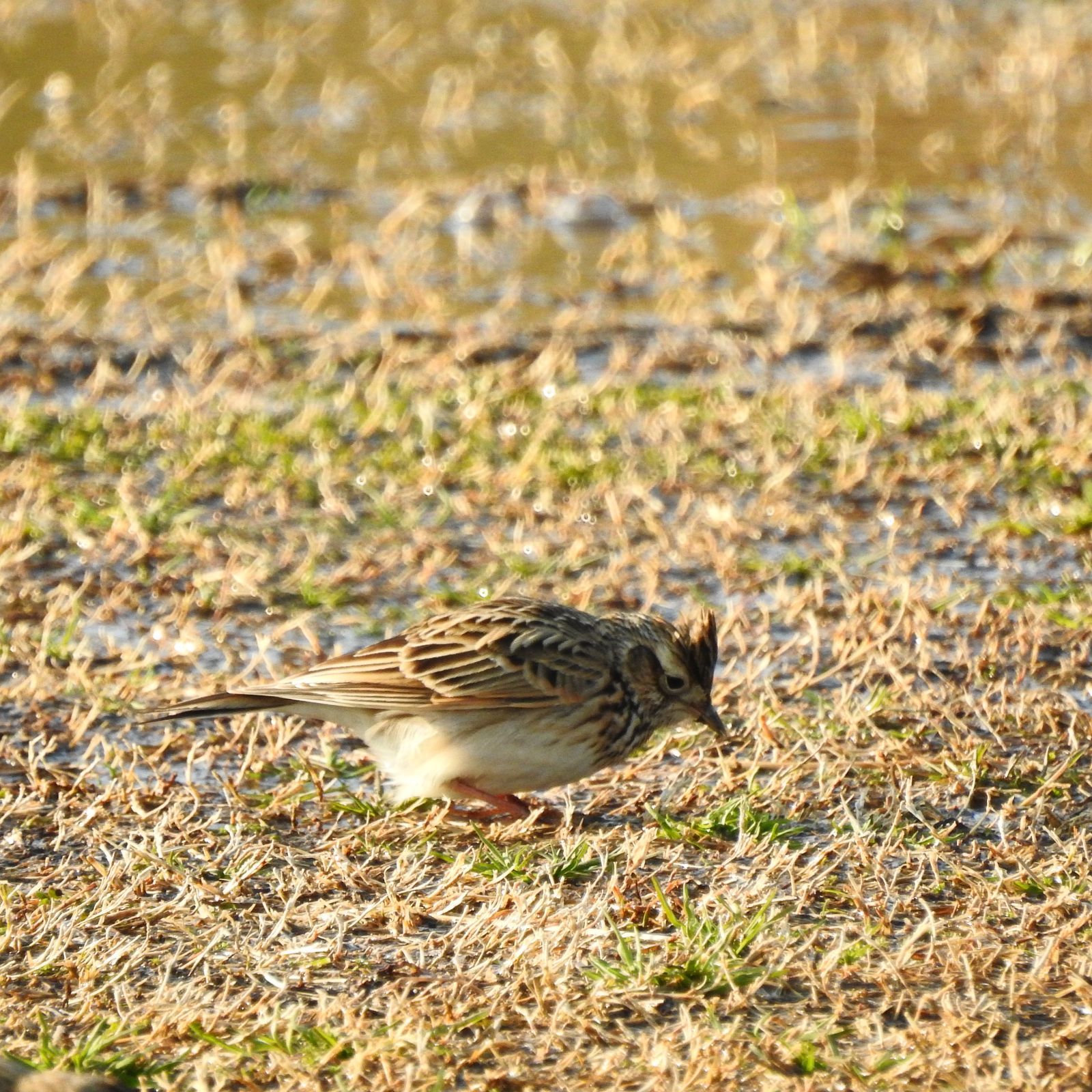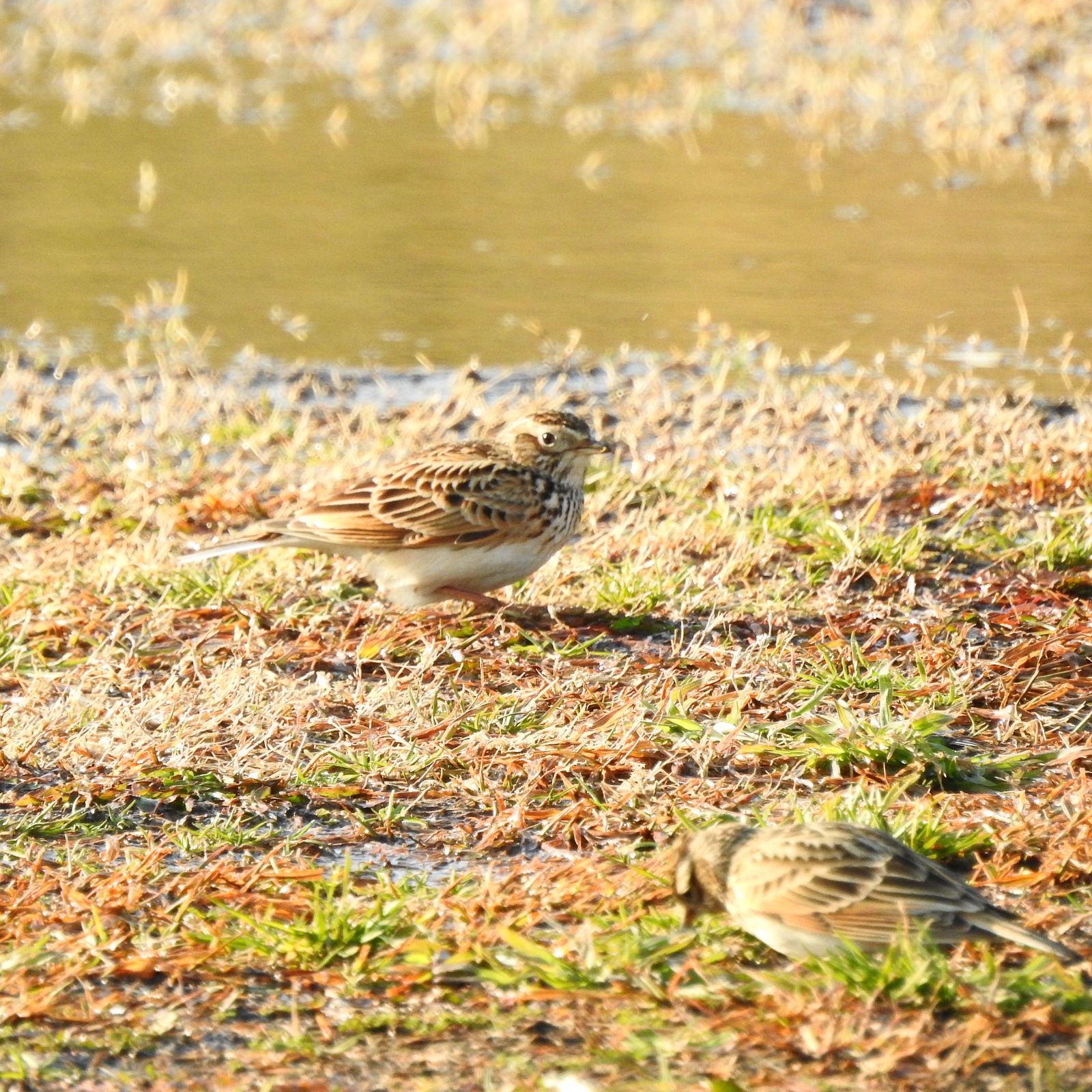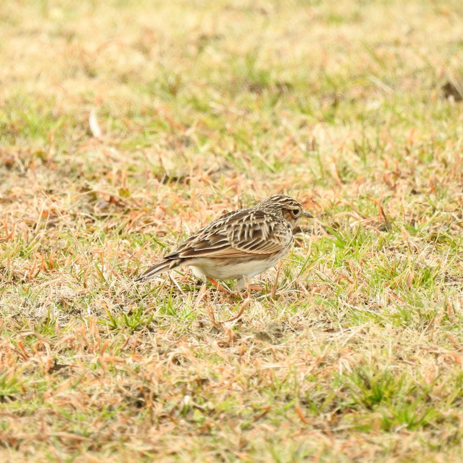 日本の野鳥650 P520のタイワンヒバリが最も類似するが、観察例は沖縄と与那国で数例。 2羽いて、これは遠目でスズメの様なズングリした体系に見える多分メス。 冠羽をよく逆立てるのは多分オス。 比較画像は20日に15羽の群れでいたヒバリ。色合いが淡いし体型がスマートで胸の模様は少なく薄い。 夕方単独で行動している個体は色合いは似てるけど体型がスマート。