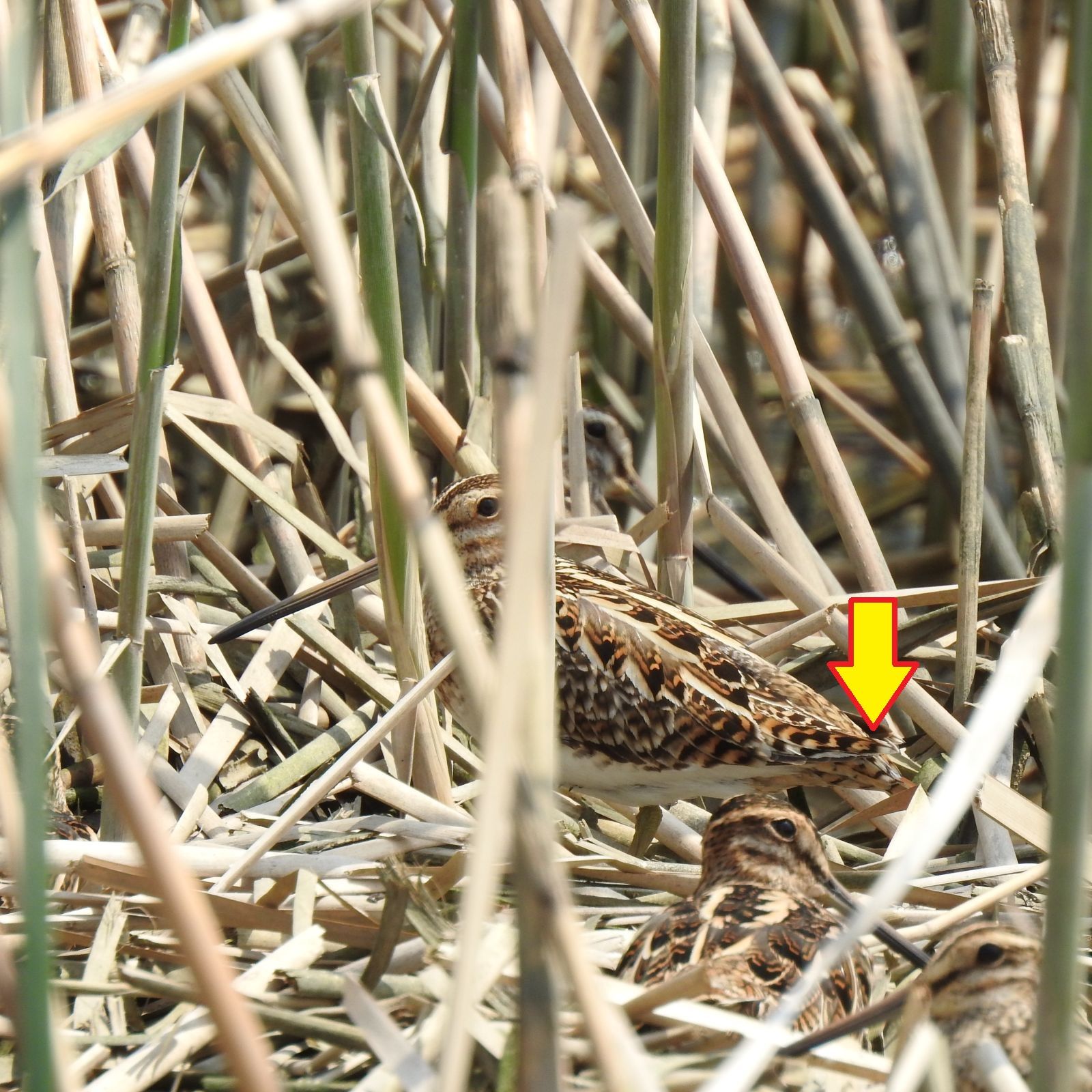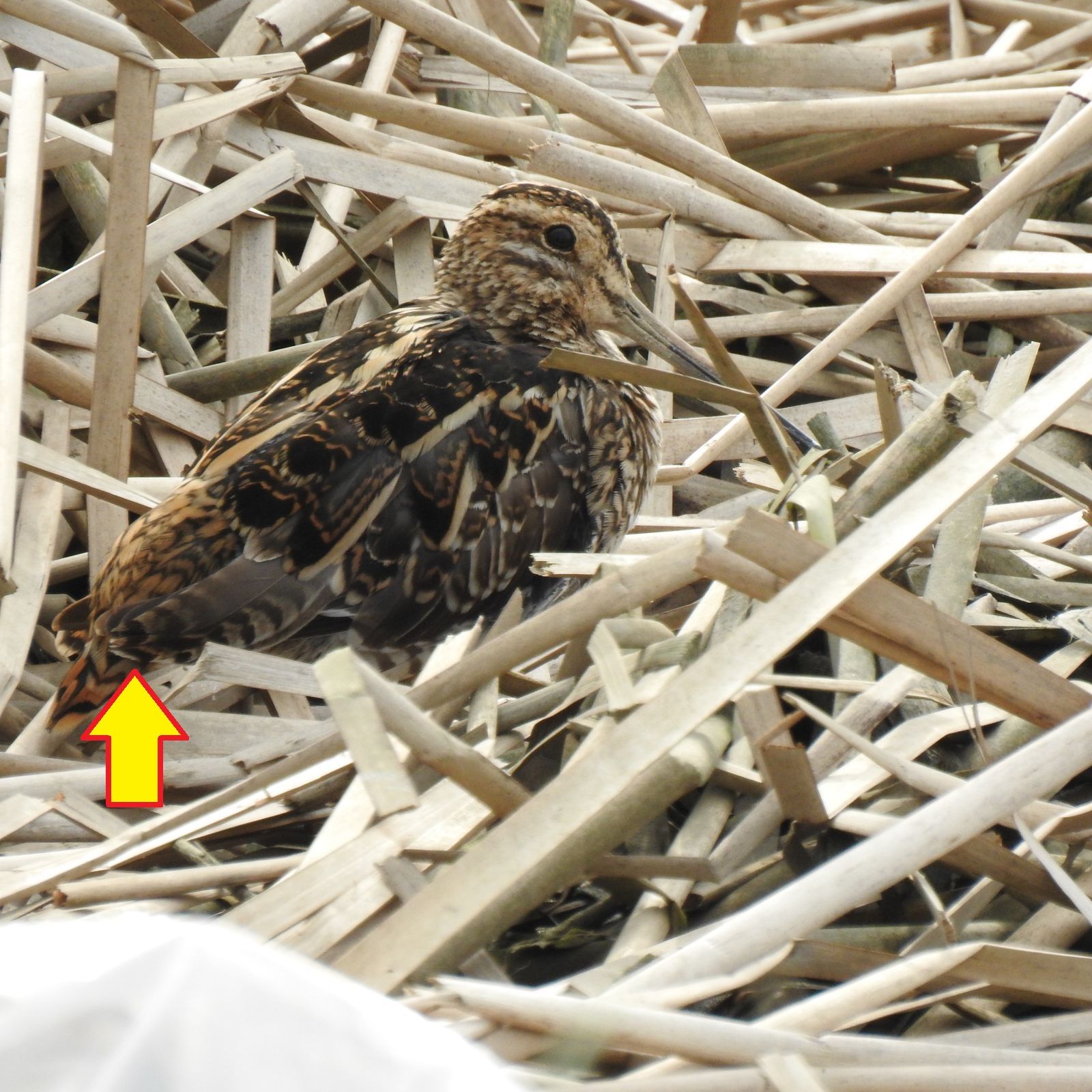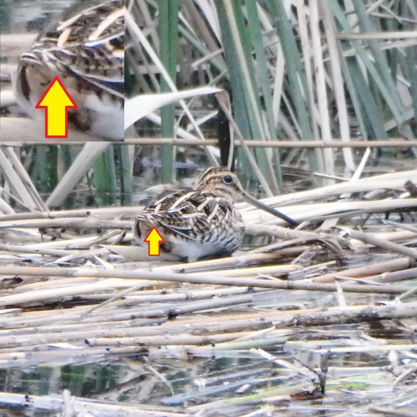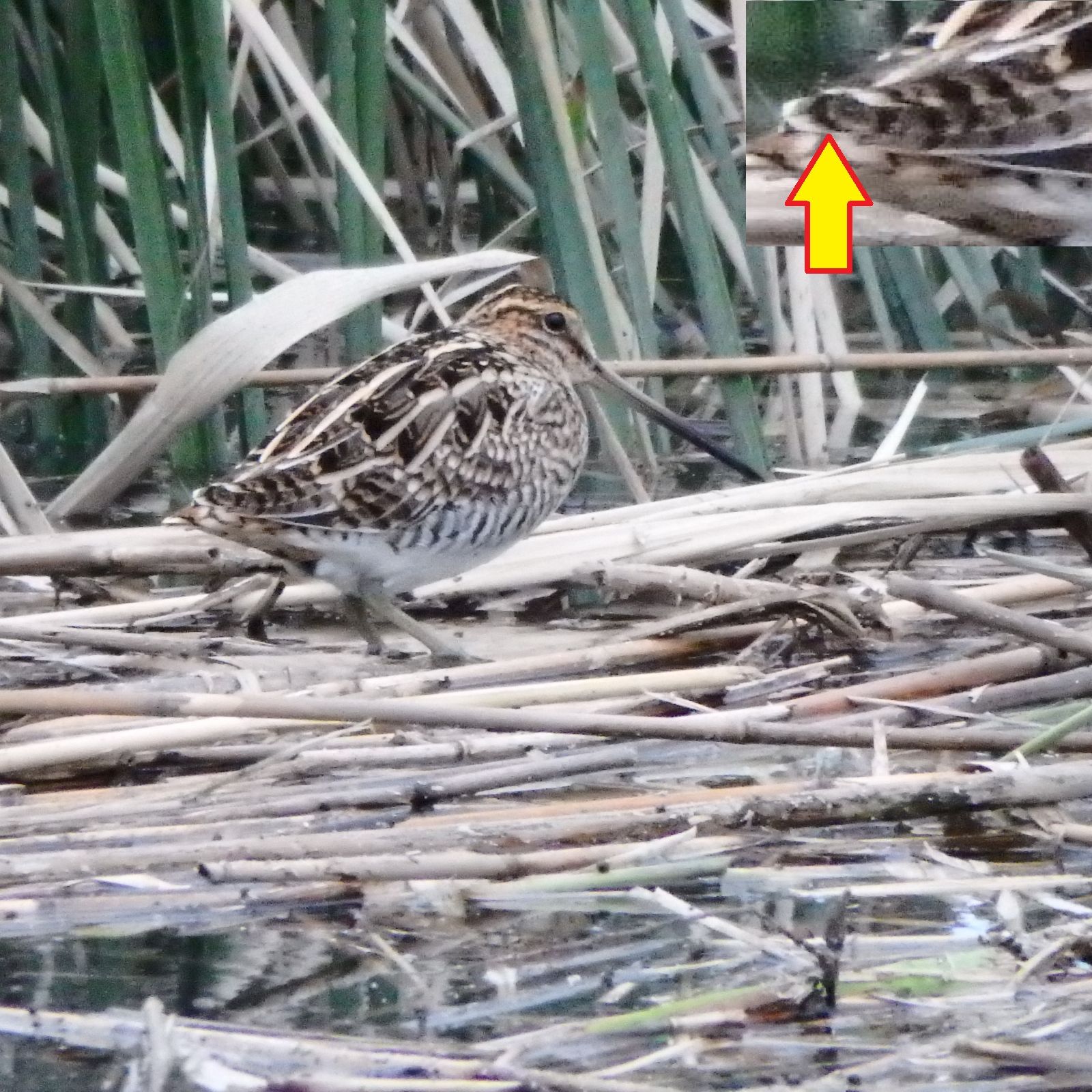 ジシギの識別で、最も決定的な証拠は尾羽の枚数とされる。今日見かけたジシギ、ハリオシギを疑っている。識別の上で三列風切羽の色と模様の太さも手掛かりになりそうだ。