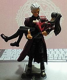 これを買って一番やりたかった事、それは お姫様抱っこ 不満1 アーチャーの手が(付属も)「グー」なので抱きかかえているように見えない 不満2 凛の腰が曲がらないのでちょうどいい体勢にならない 不満3 凛のスカートの塗装がチョロッと剥げてる 不満4 二人とも無表情 せめて凛だけでも雰囲気を変えたくて顔を赤くしてみた↑んですが、それっぽく見えるかな? 小道具↑(ペンライト&カラーセロファン 共に100円ショップ商品) やりたかった事・その2 腕を組む 後ろから抱きつくのはイマイチ 弓凛 定番の「背中合わせ」 ここまで携帯カメラのライトを点け忘れてたから画面が暗い 二人の足元はノートPCです(;^_^A ココ(何ていうの?タッチパネル?)壊れてて使い物にならないし、テーブルの上より立たせやすかったので壊れてるからって、こんな事に使うような神経だからパソもすぐ故障するのかしら 不満5 実物の胸とシャツの十文字の位置が低いような気がする パッケージ↑ 実物↓ ポーズを変える度に腕や頭部がポロポロ落ちるので面倒くさいですが、値段分は楽しめたかな?