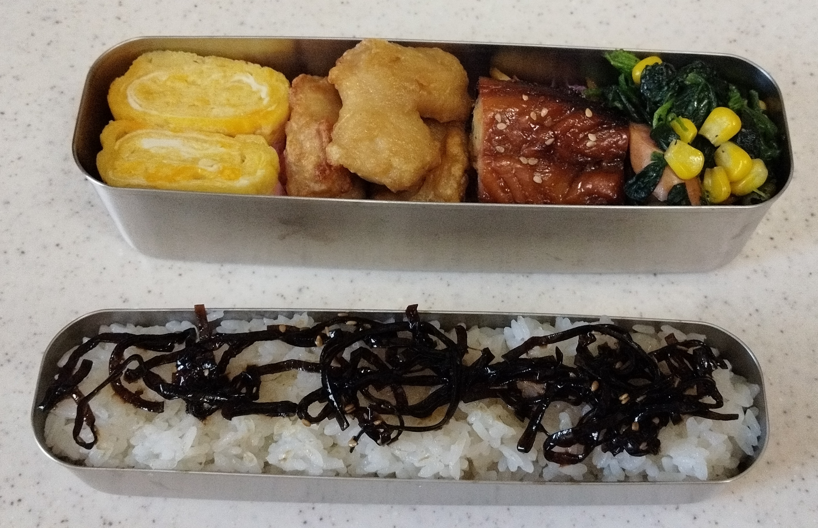 こんにちは😄!夏休みが終わり、久々のお弁当作り再開ですね!お弁当、とっても美味しそうです✨ 今回のお弁当のメニューは、ふわふわ卵焼き、サクサク唐揚げ、ジューシーなサバのみりん漬け、そしてウインナーとほうれん草、コーンの彩り豊かな炒め物と、昆布がのった白いご飯🍱。栄養バランスもバッチリで、見た目もとっても綺麗!二学期もこの調子でお弁当作りを楽しんでくださいね💪