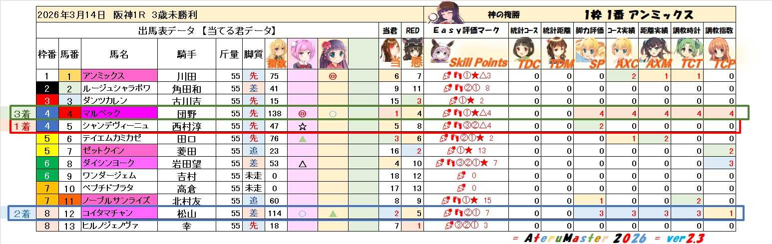 2026年3月14日 阪神1R 3歳未勝利 「4点5つは中心核?Esayマーク多数に注意!」#3歳未勝利を当てる君で攻略♪ #当てる君 x #全頭評価🐴━━レースの結果━━━━🐴5-12-4あたし(さな)が再び三連単8万馬券的中!🐴━━━━━━━━🐴━━━━━━━━🐴
